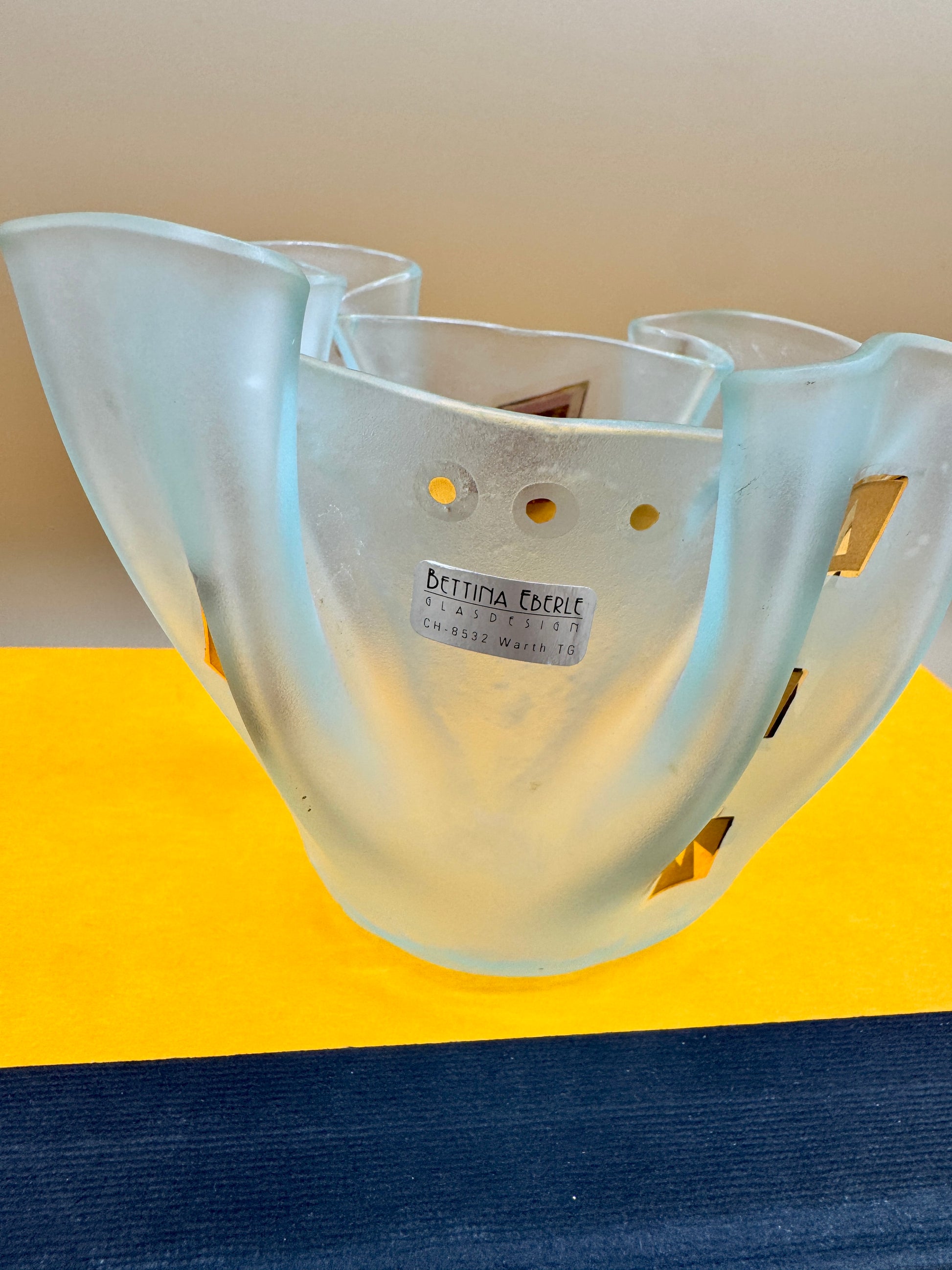 Bettina Eberle Swiss Glass Vase – Frosted Art Glass with Gold Accents, Signed GlasDesign