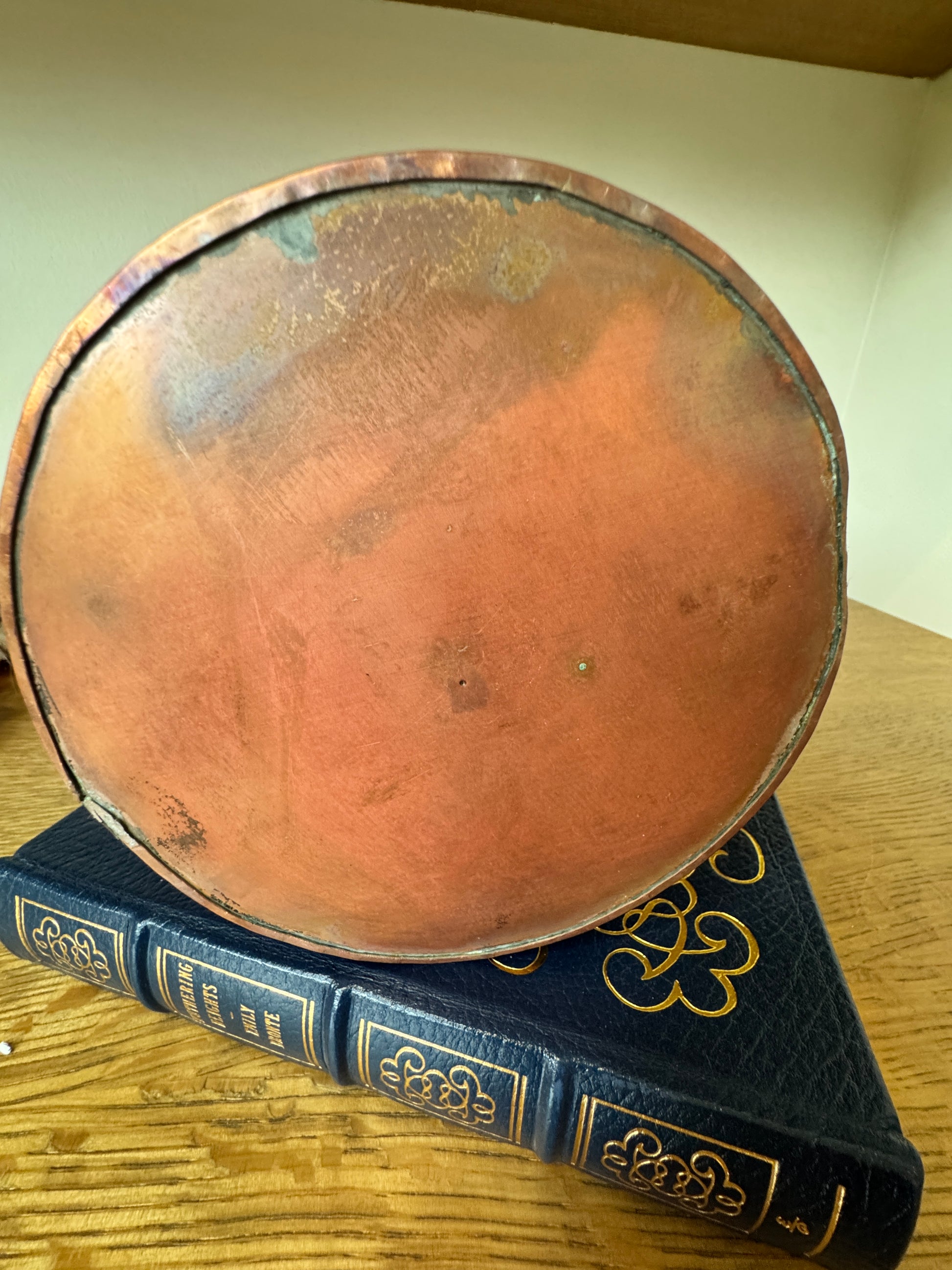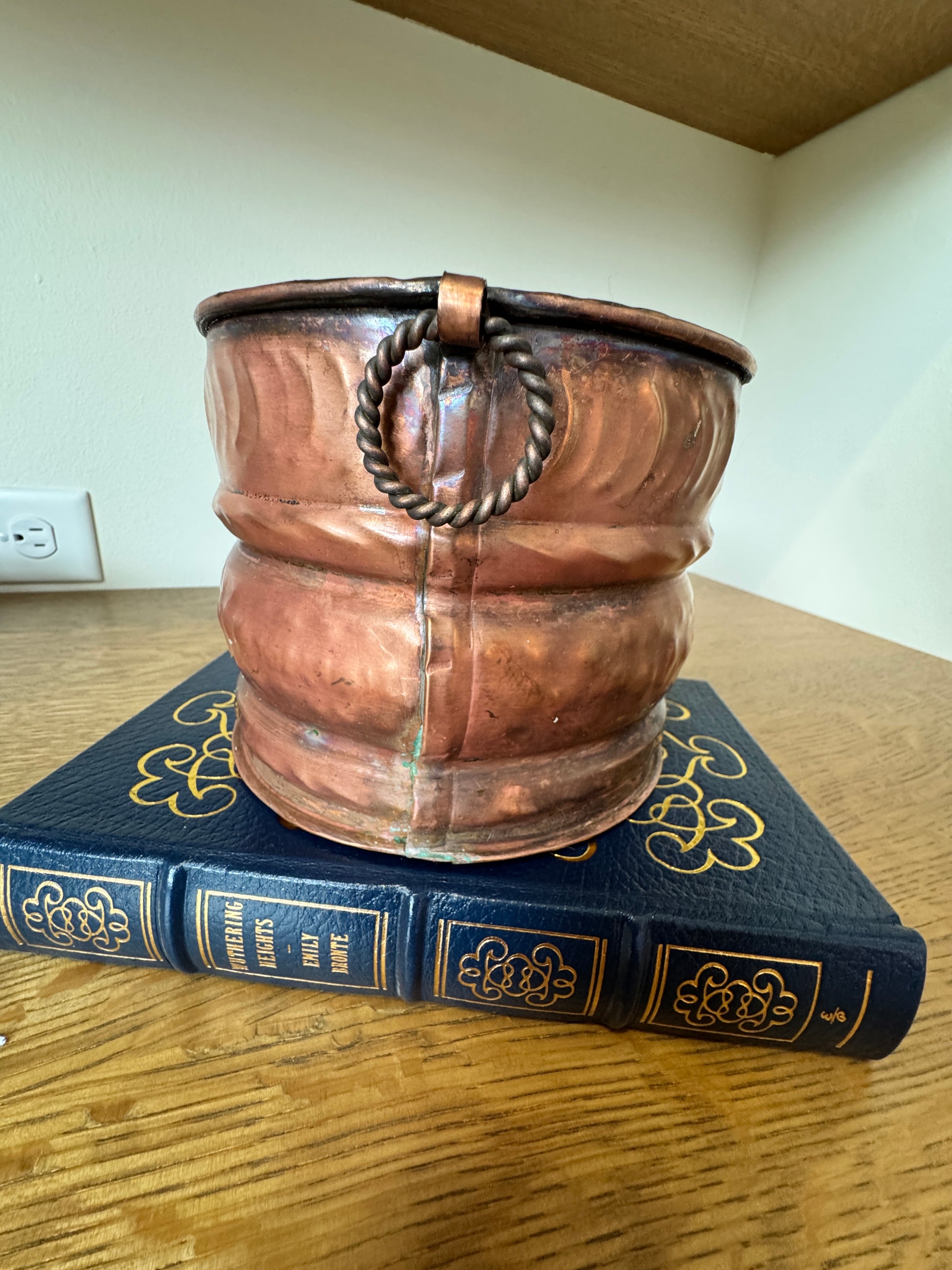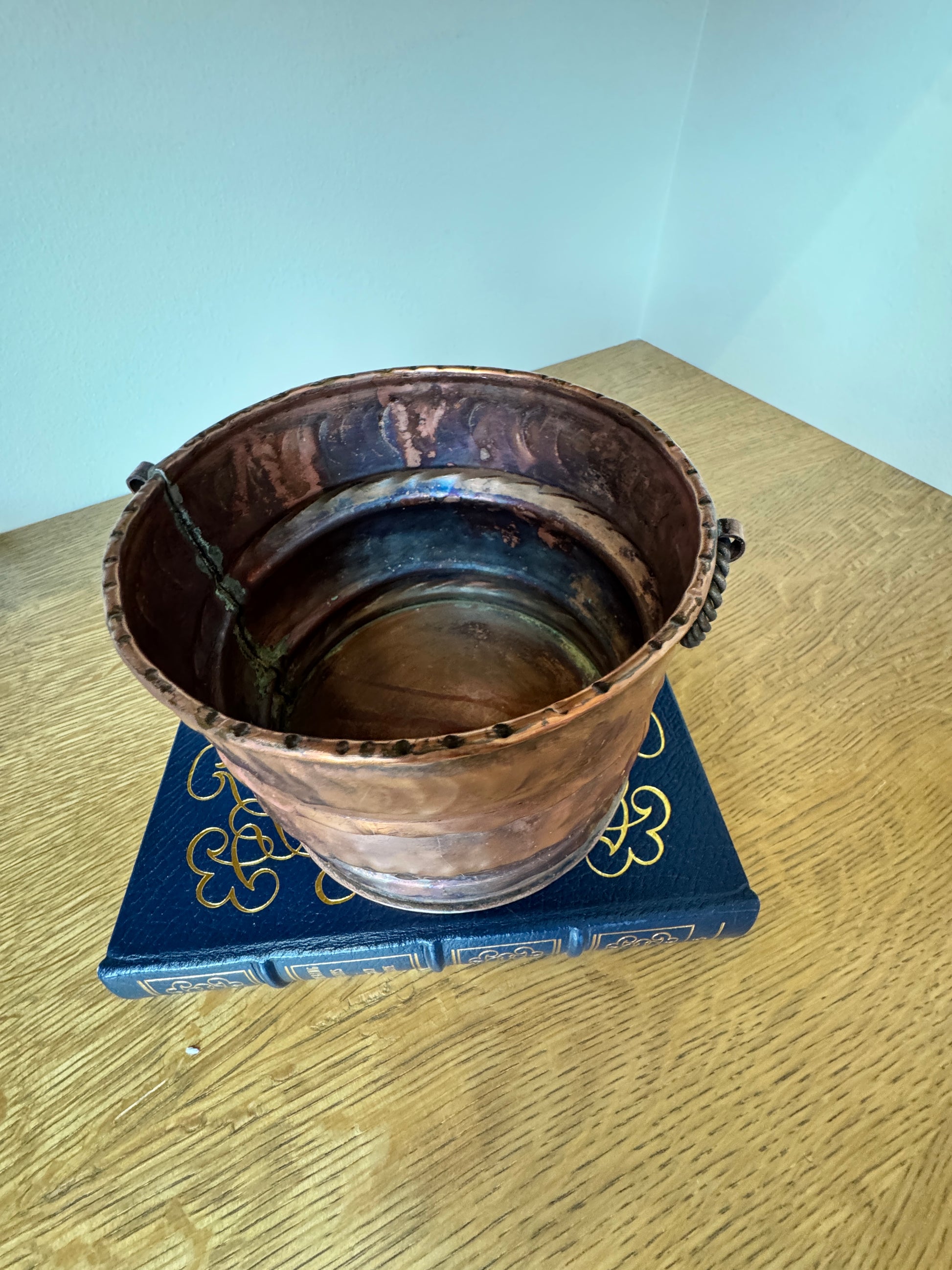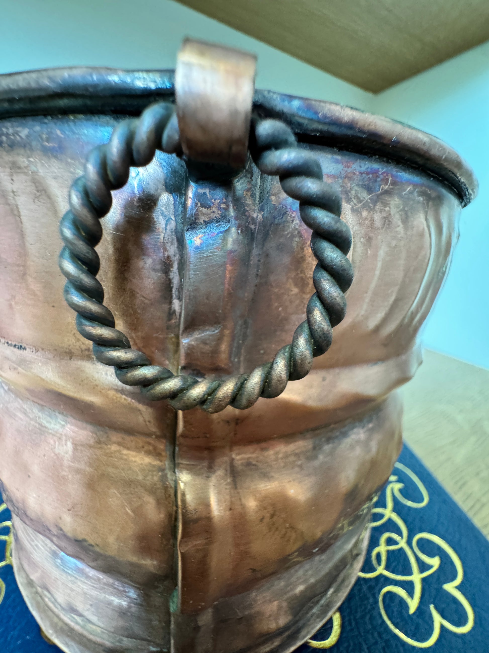 A beautiful Swiss handmade copper pail with classic twisted iron ring handles. Thise piece features a hand-hammered texture, rich patina, and timeless character that reflects its age and craftsmanship. Its heavy patina and wear give it a rustic charm, making it an excellent display piece, planter, or storage accent.