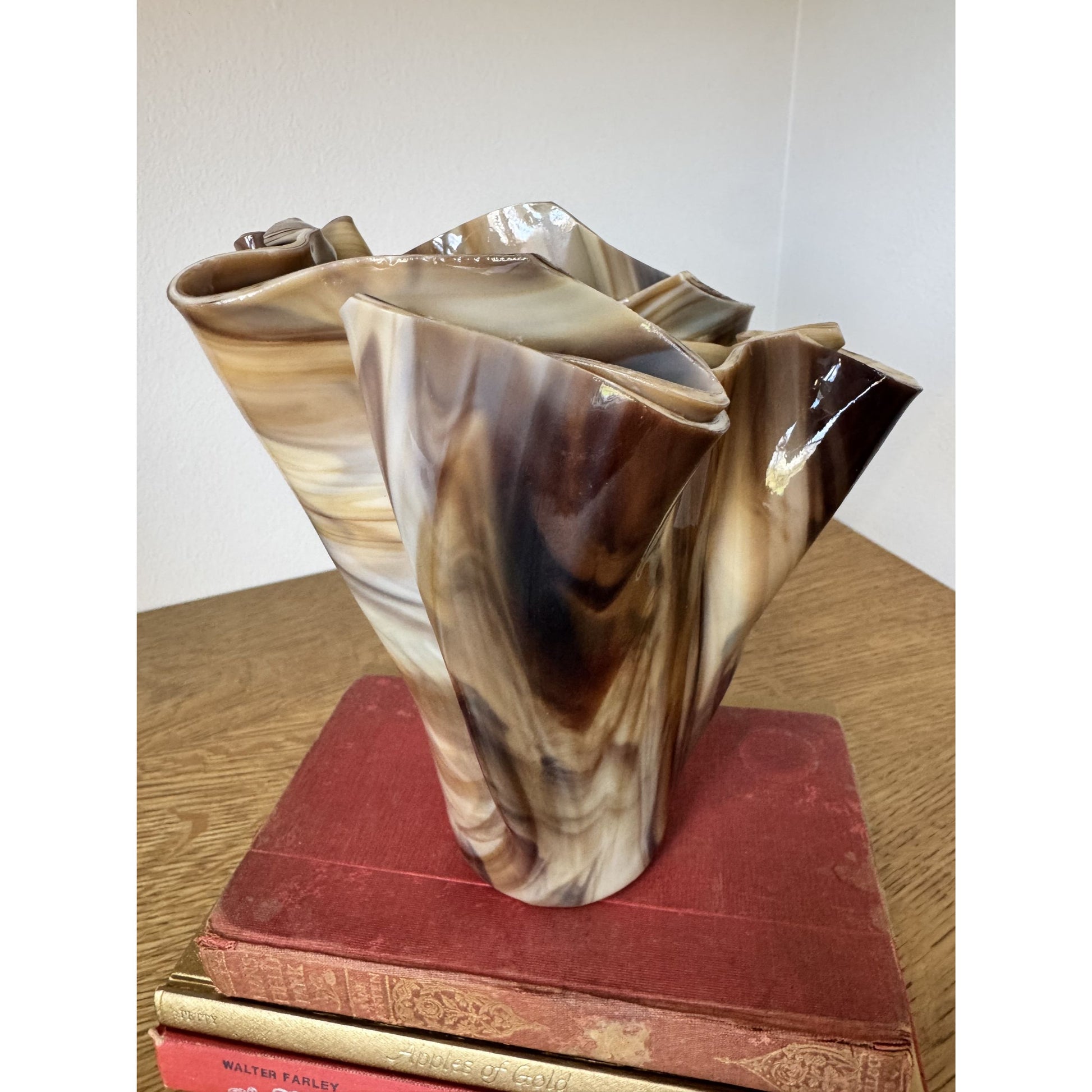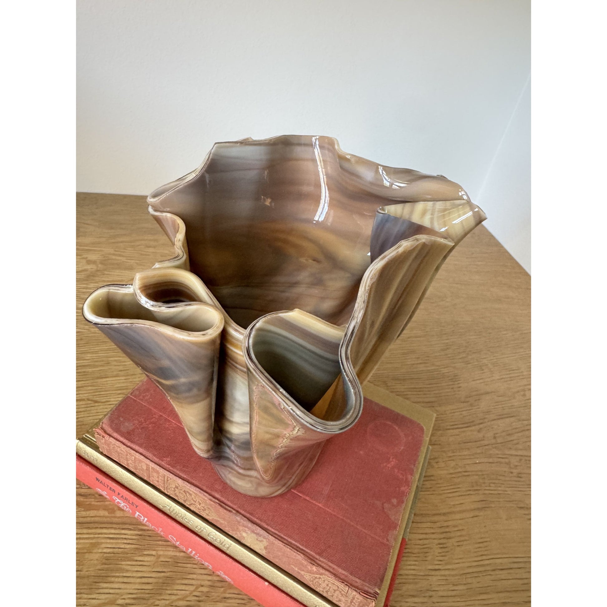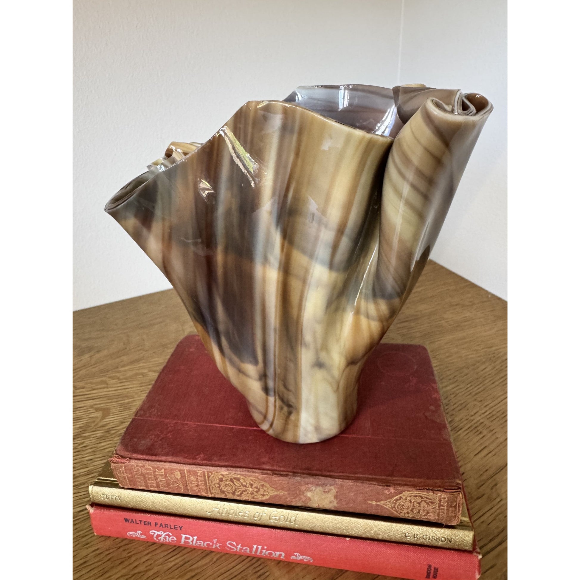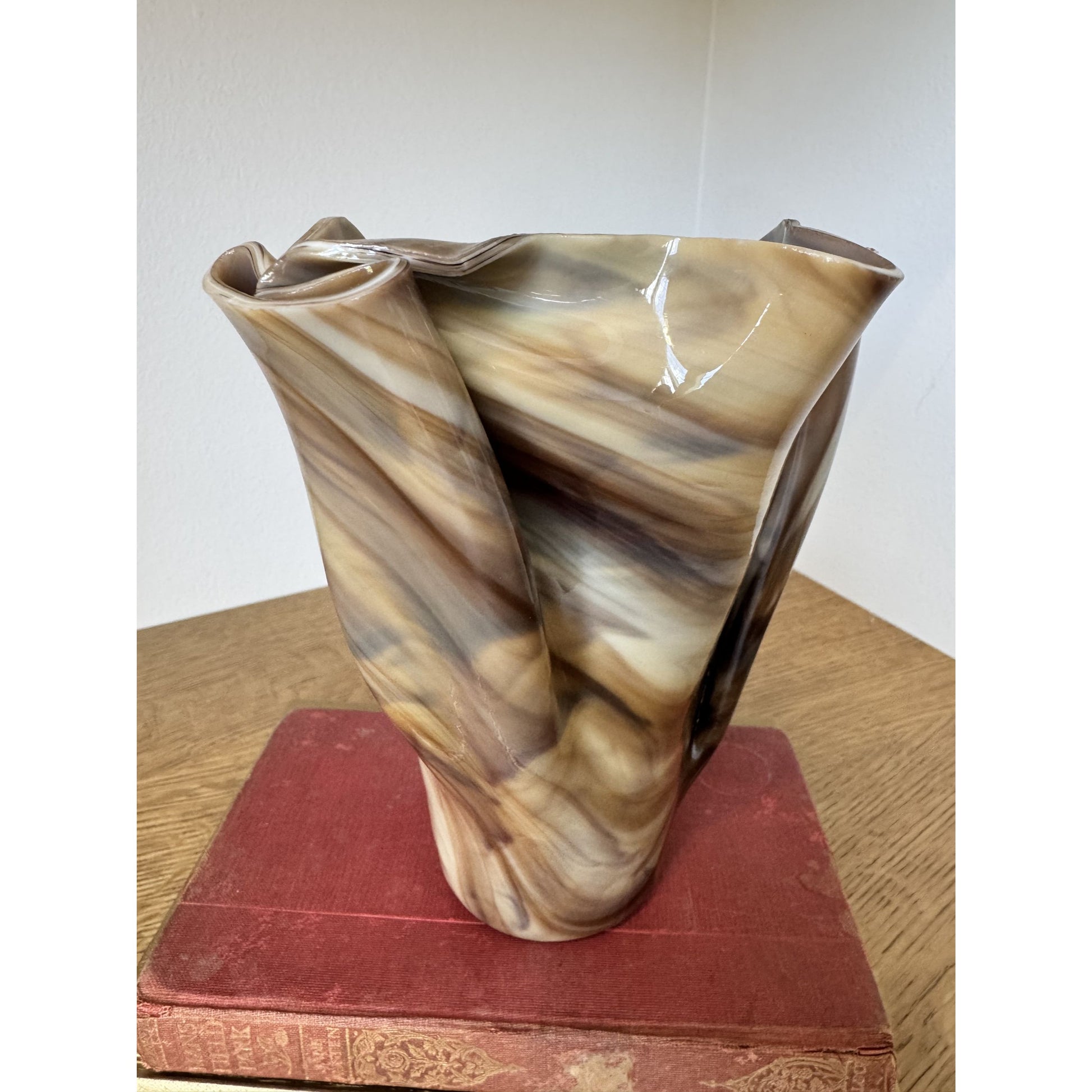 It features rich marbling in cream and brown tones, a hallmark of slag glass, with swirls that vary beautifully depending on the angle. The glass folds create stunning dimensionality, making this vase a true conversation piece.