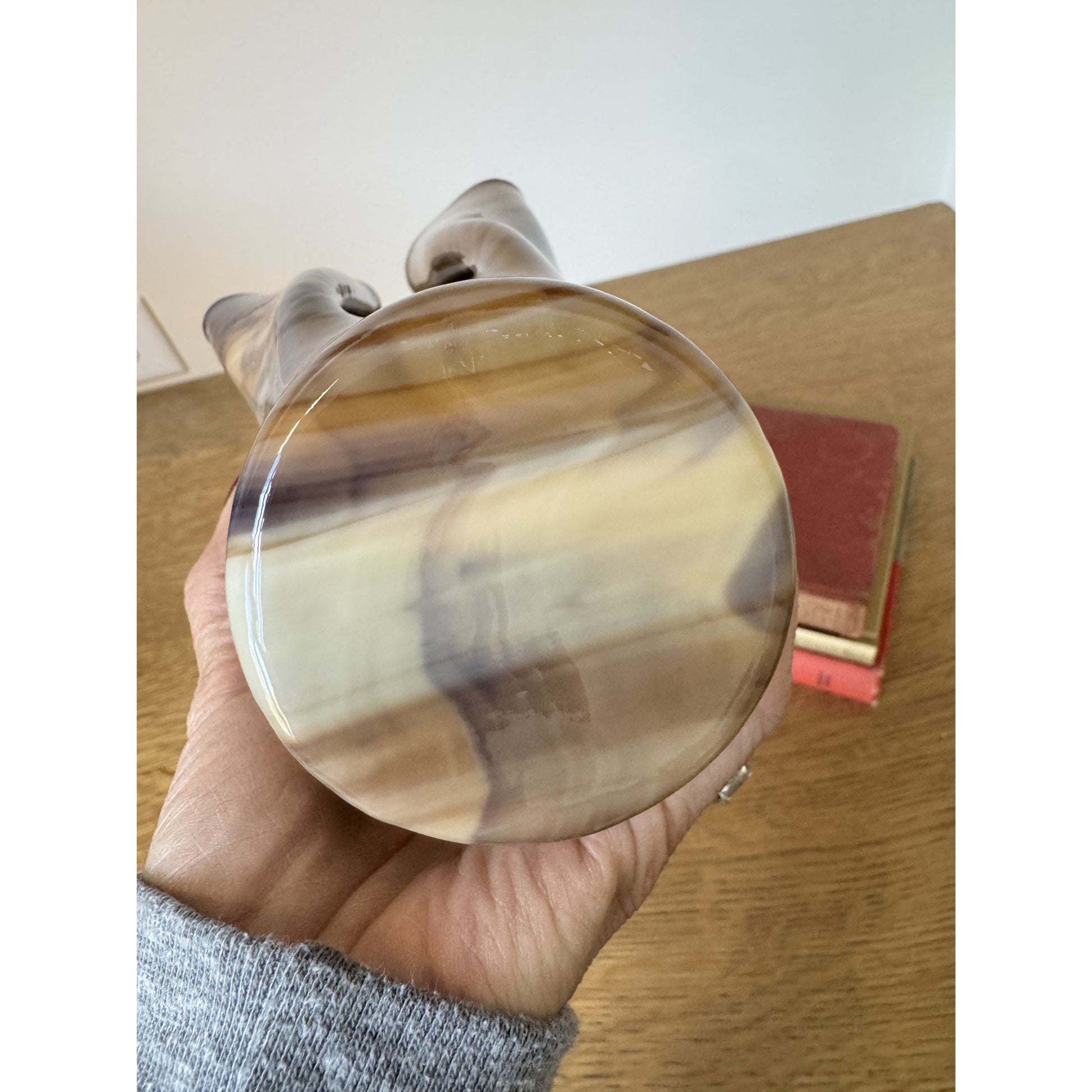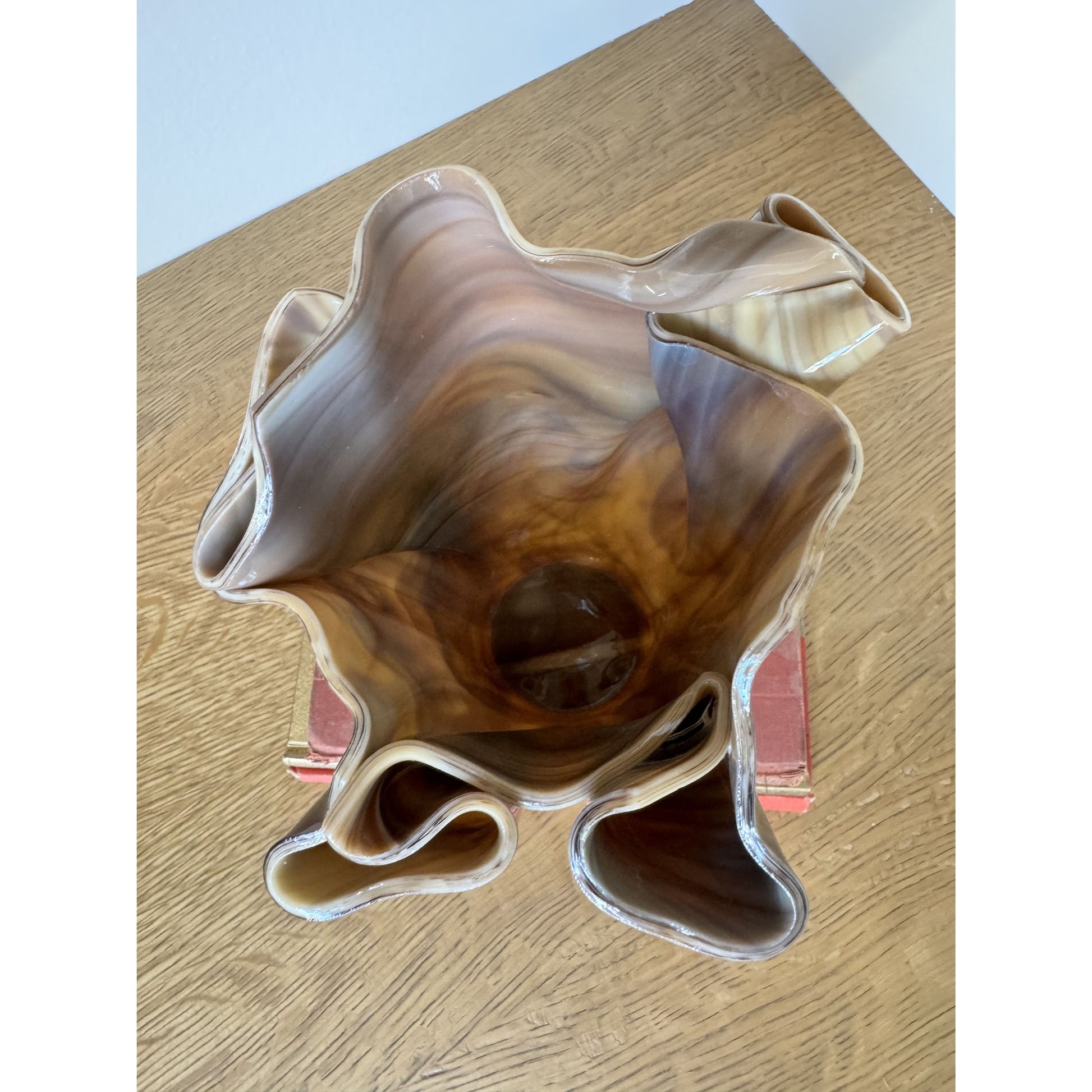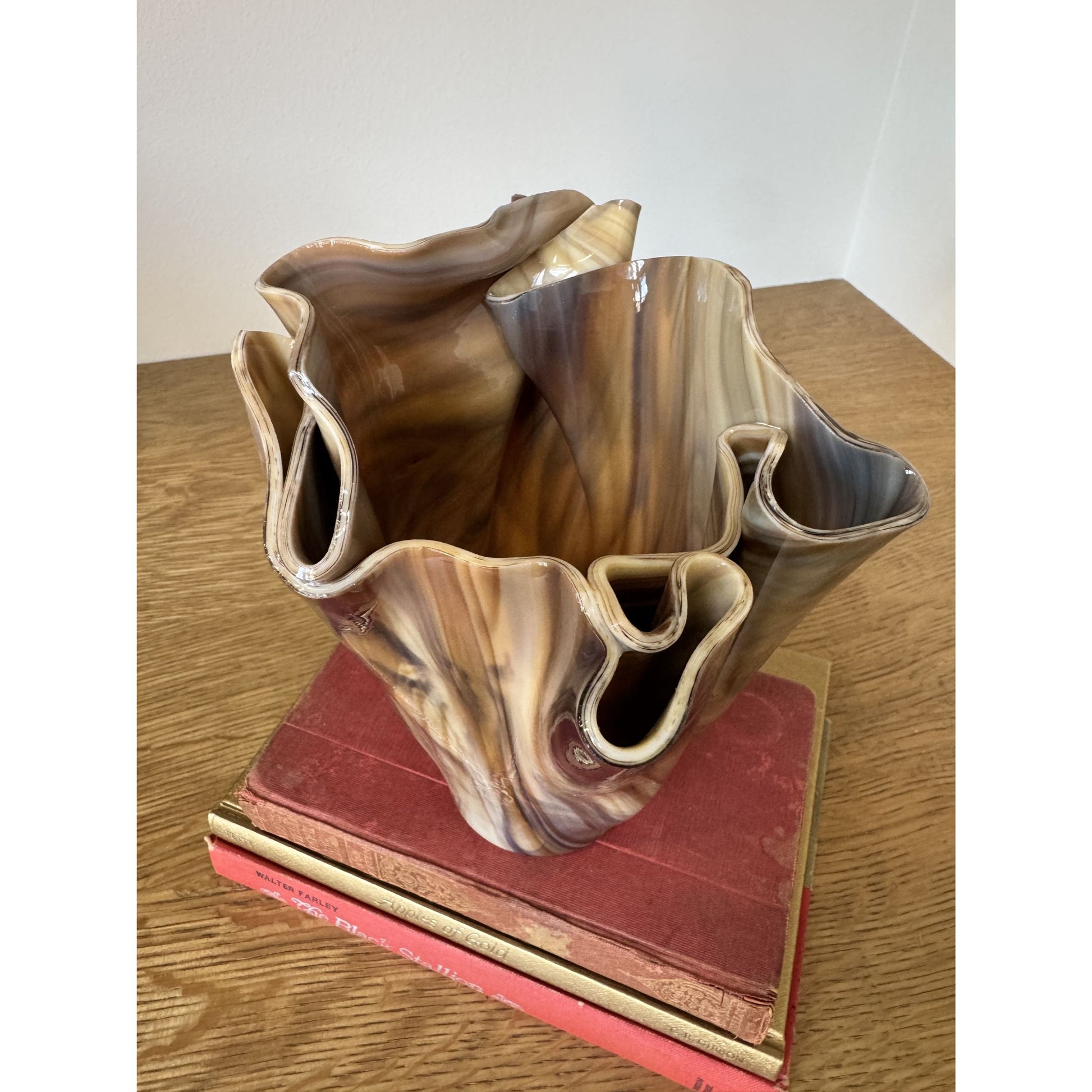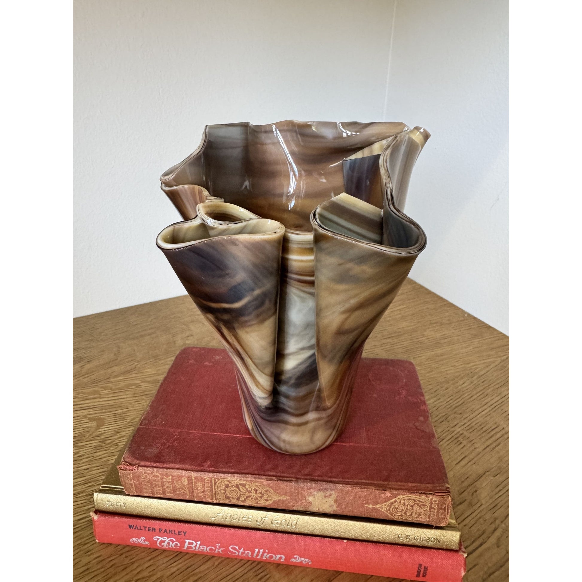 It features rich marbling in cream and brown tones, a hallmark of slag glass, with swirls that vary beautifully depending on the angle. The glass folds create stunning dimensionality, making this vase a true conversation piece.