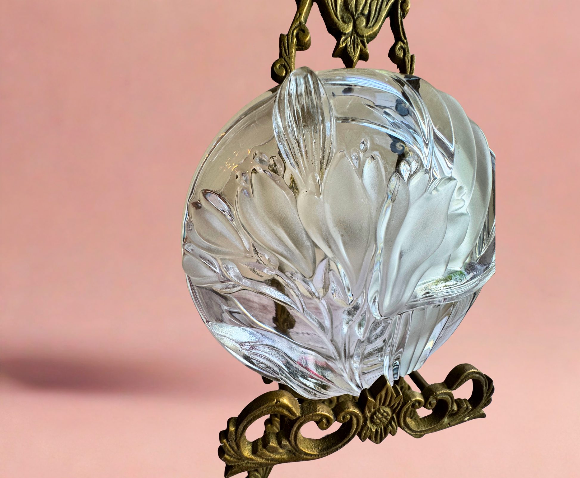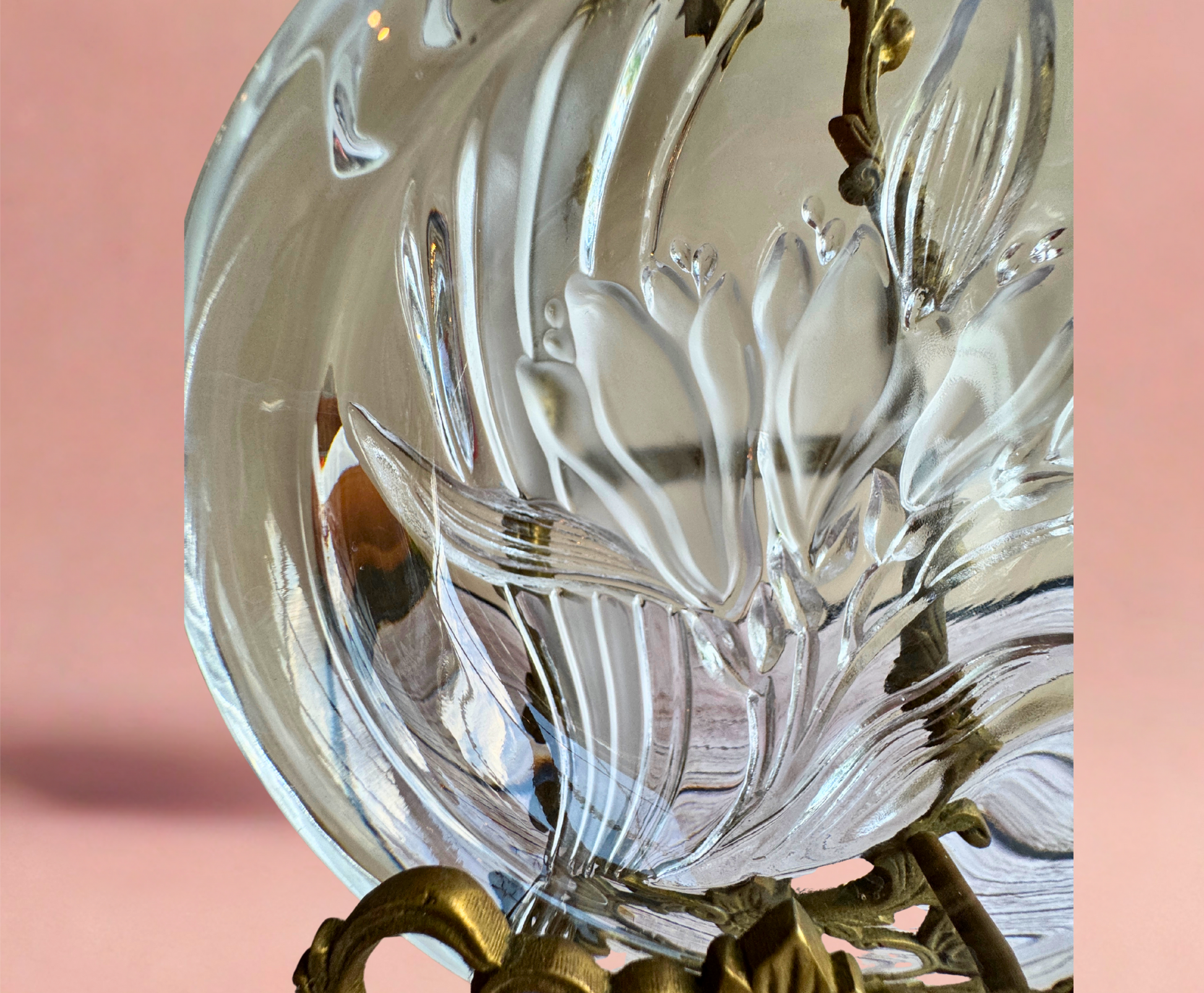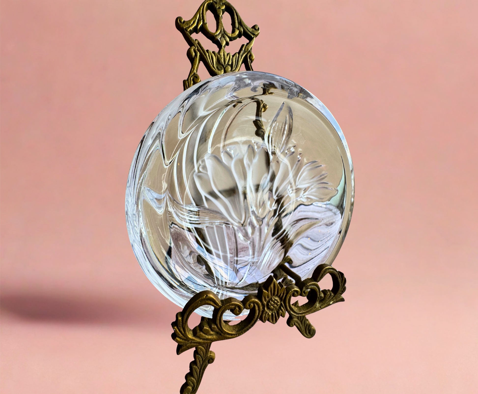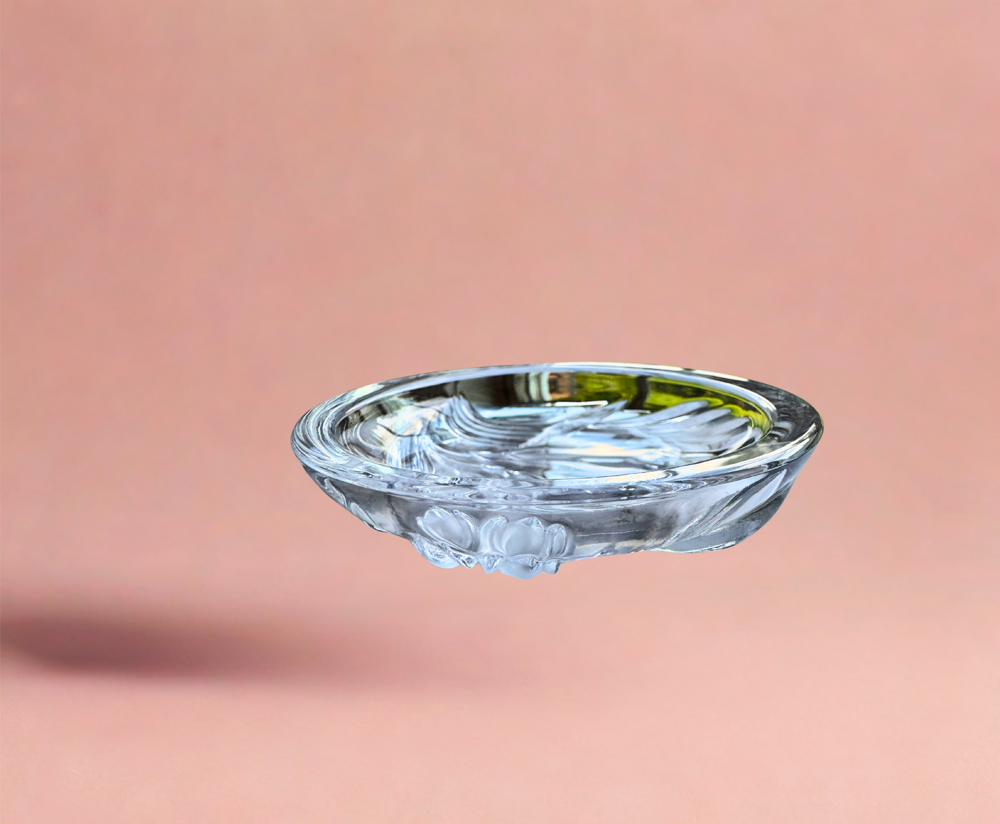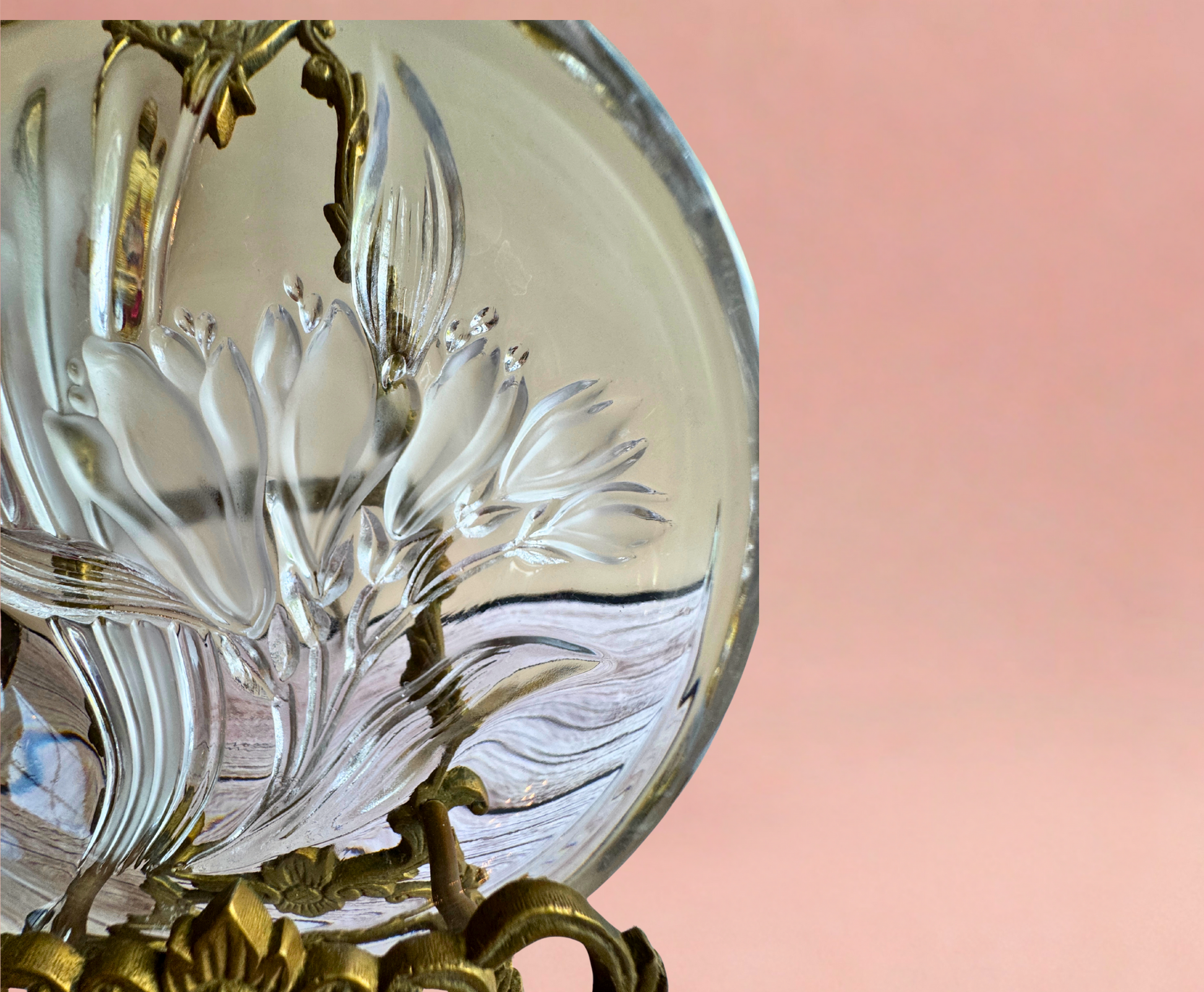 This exquisite pressed glass dish features an elegant lily motif rendered in raised frosted and clear glass. With gentle curves and a low-profile design, this piece captures and refracts light beautifully. The sculpted bloom design evokes Art Nouveau influences, making it equally suited for vanity styling, a trinket catchall, or a dainty serving piece.