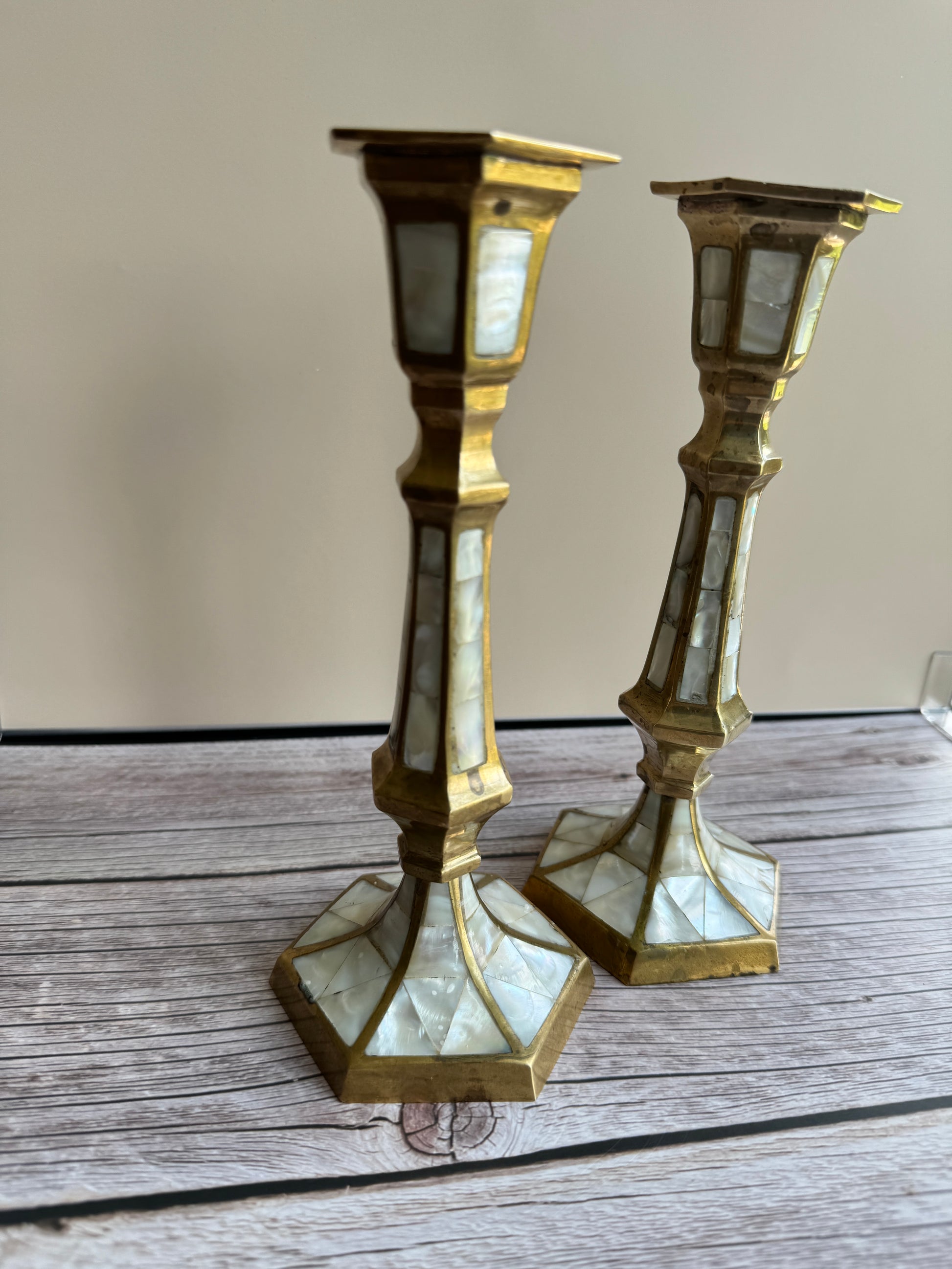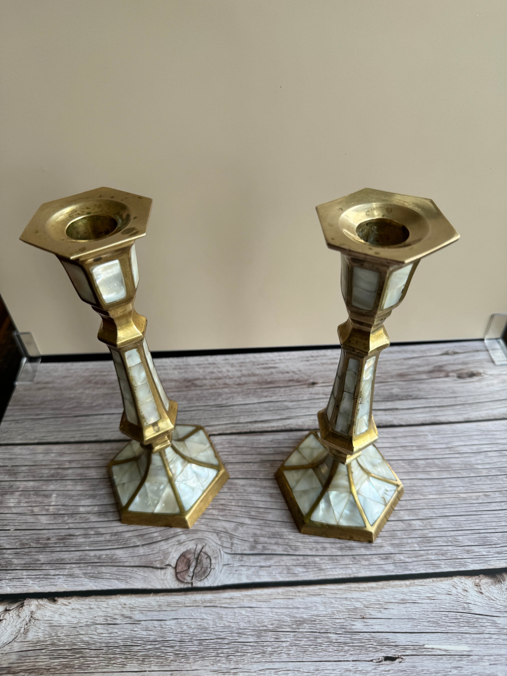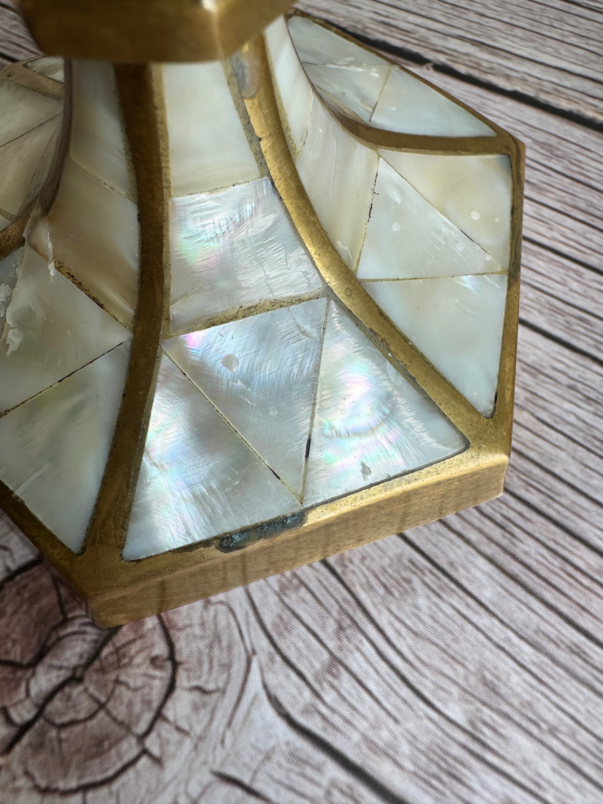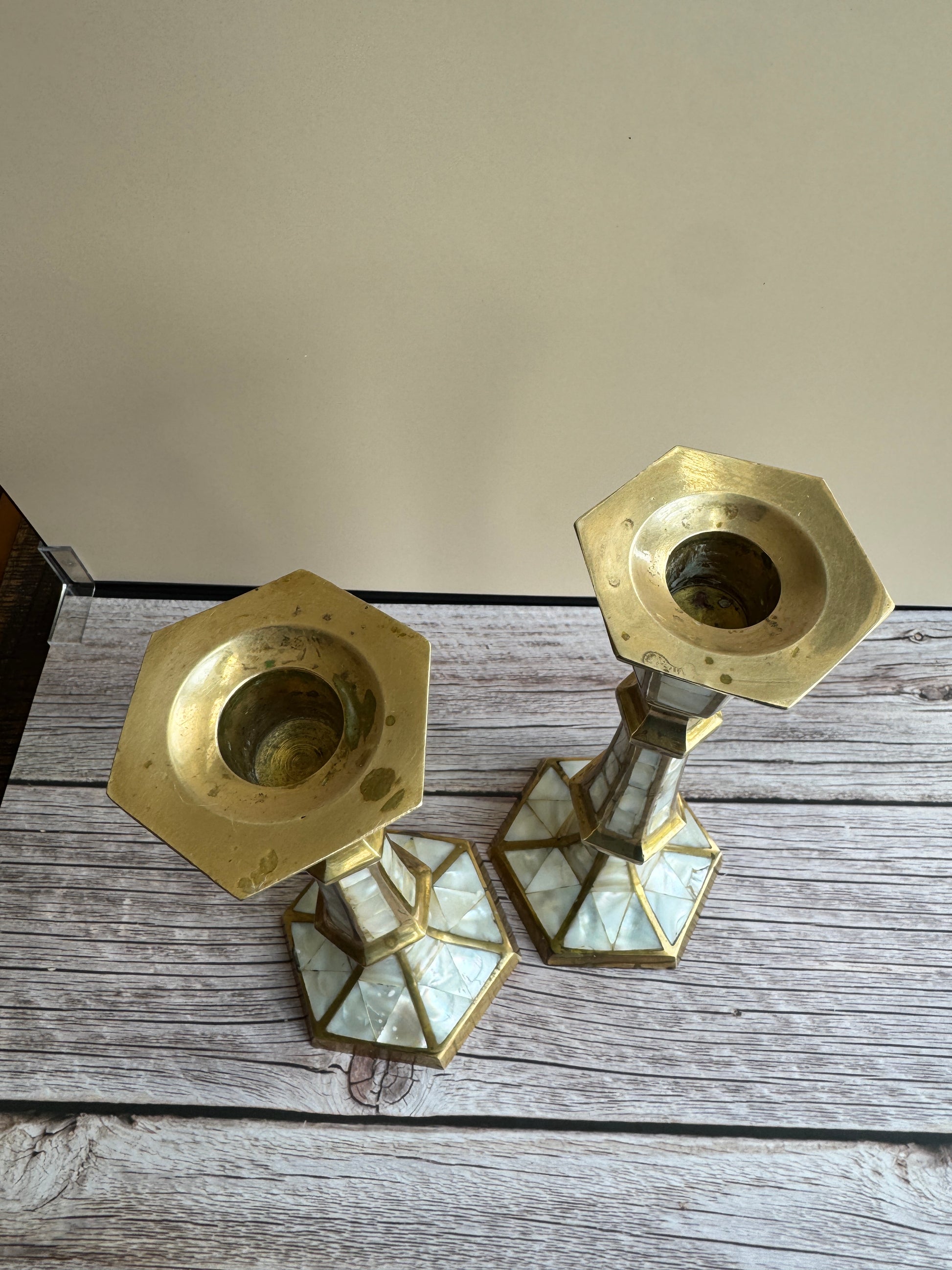 Mother-of-Pearl & Brass Candlestick Pair – 1970s–1990s