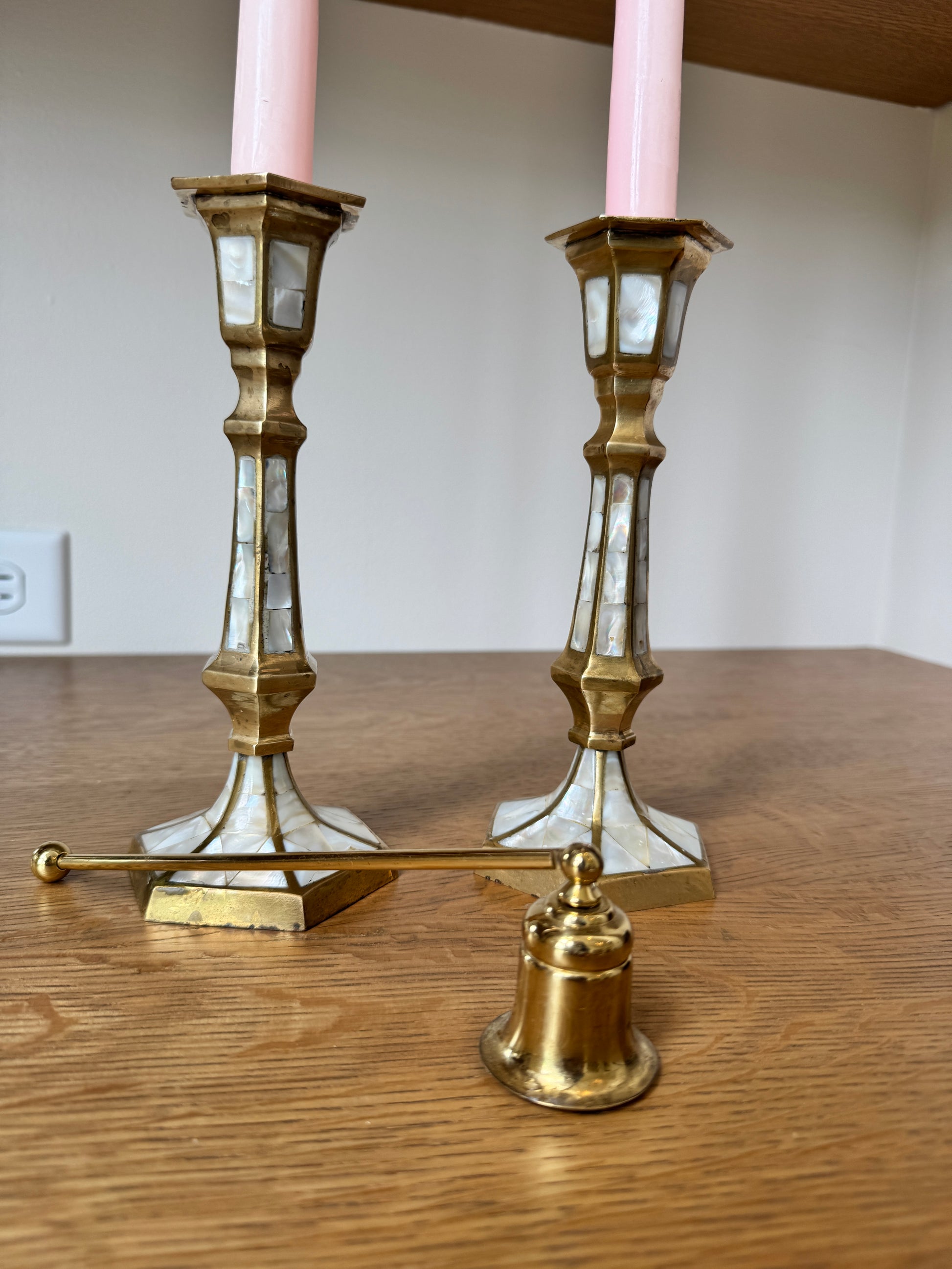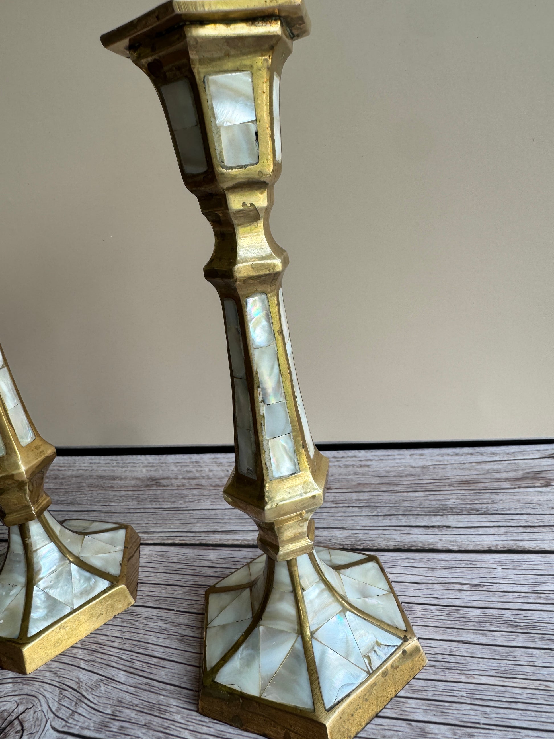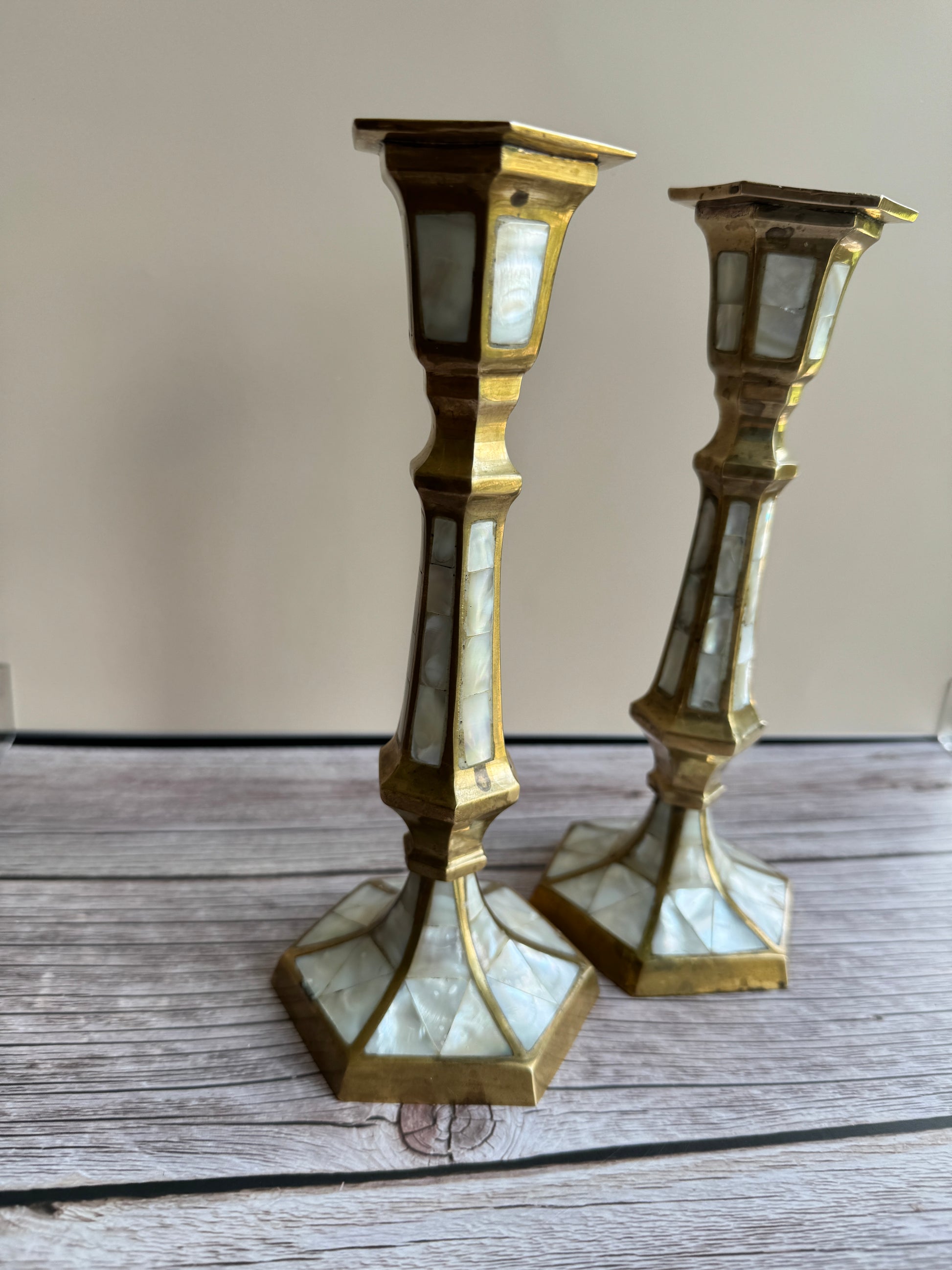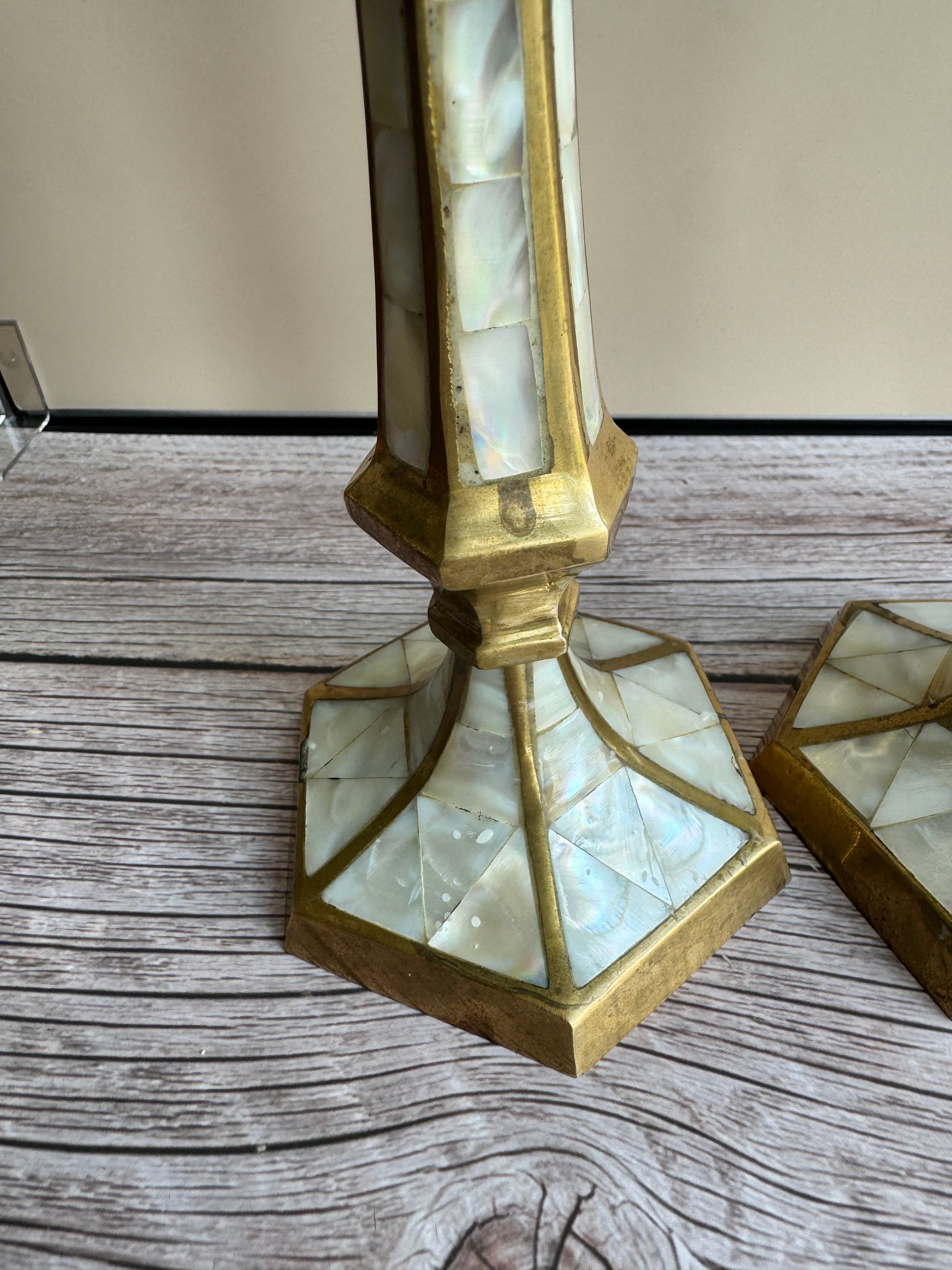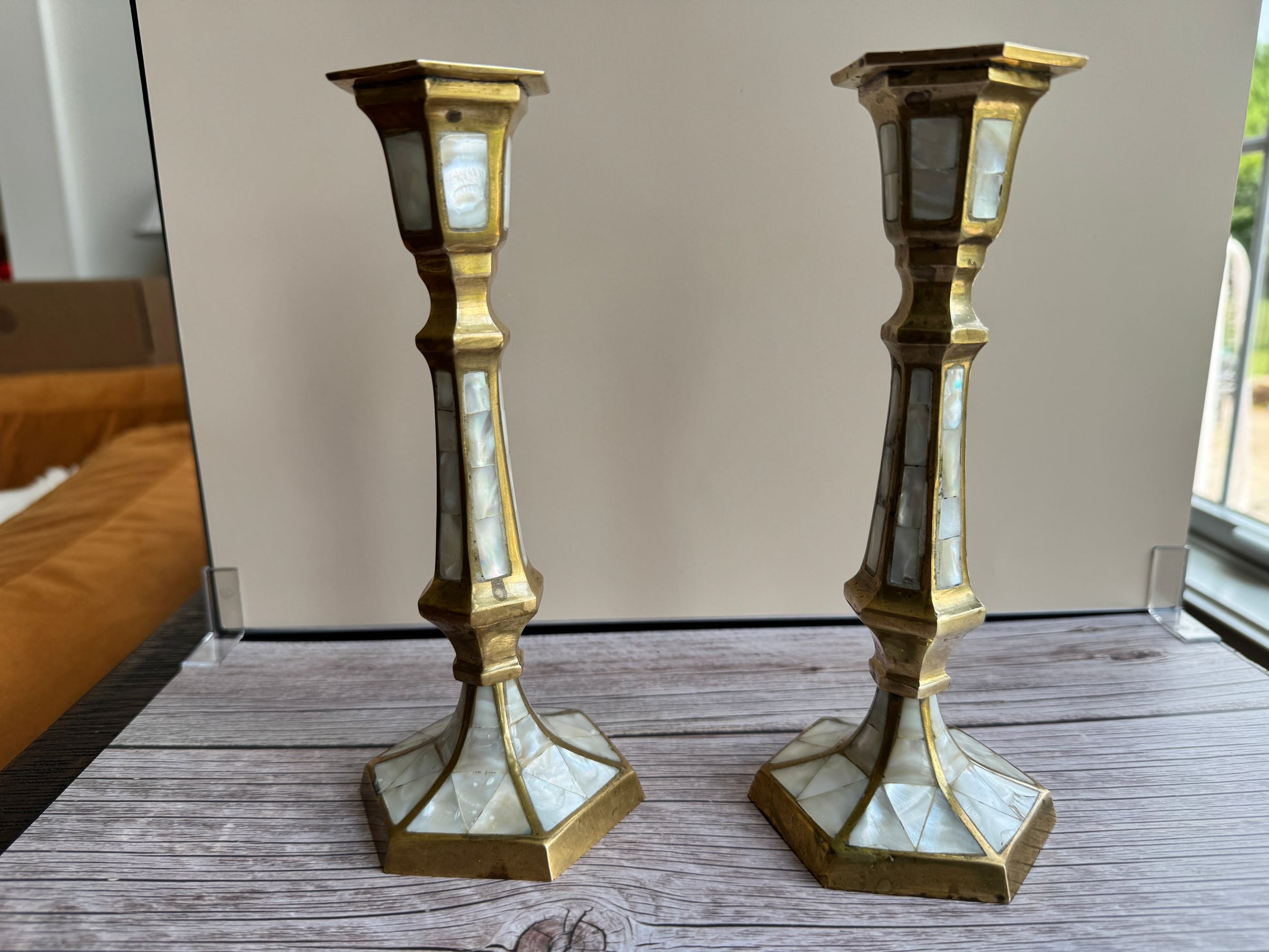 Mother-of-Pearl & Brass Candlestick Pair – 1970s–1990s