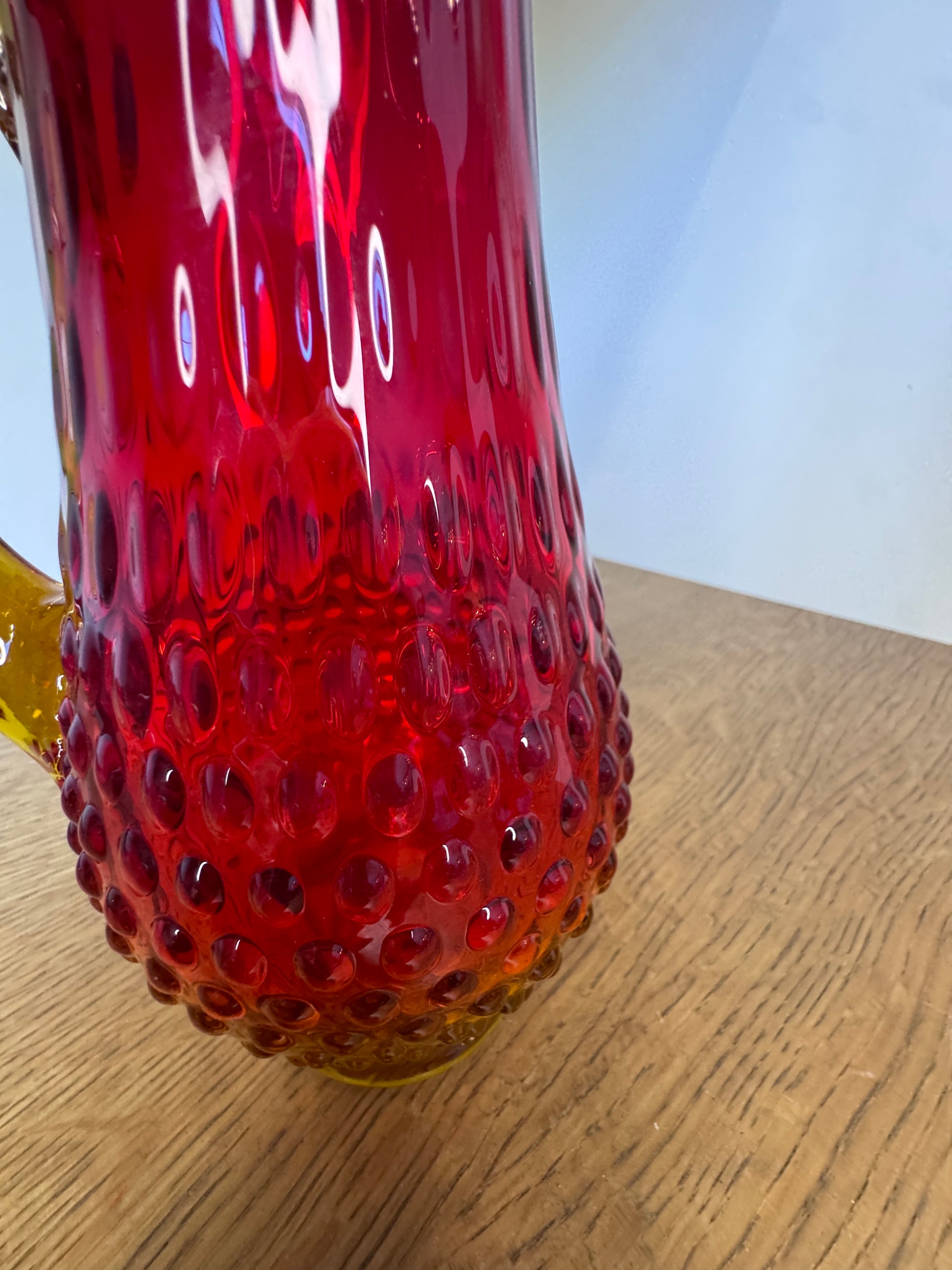 A striking Mid-Century Amberina glass pitcher featuring a fiery color gradient that fades from deep ruby red to warm golden amber. The elongated swung shape, hobnail texture, and curved applied handle make this piece both sculptural and functional — a classic example of 1960s American art glass design.