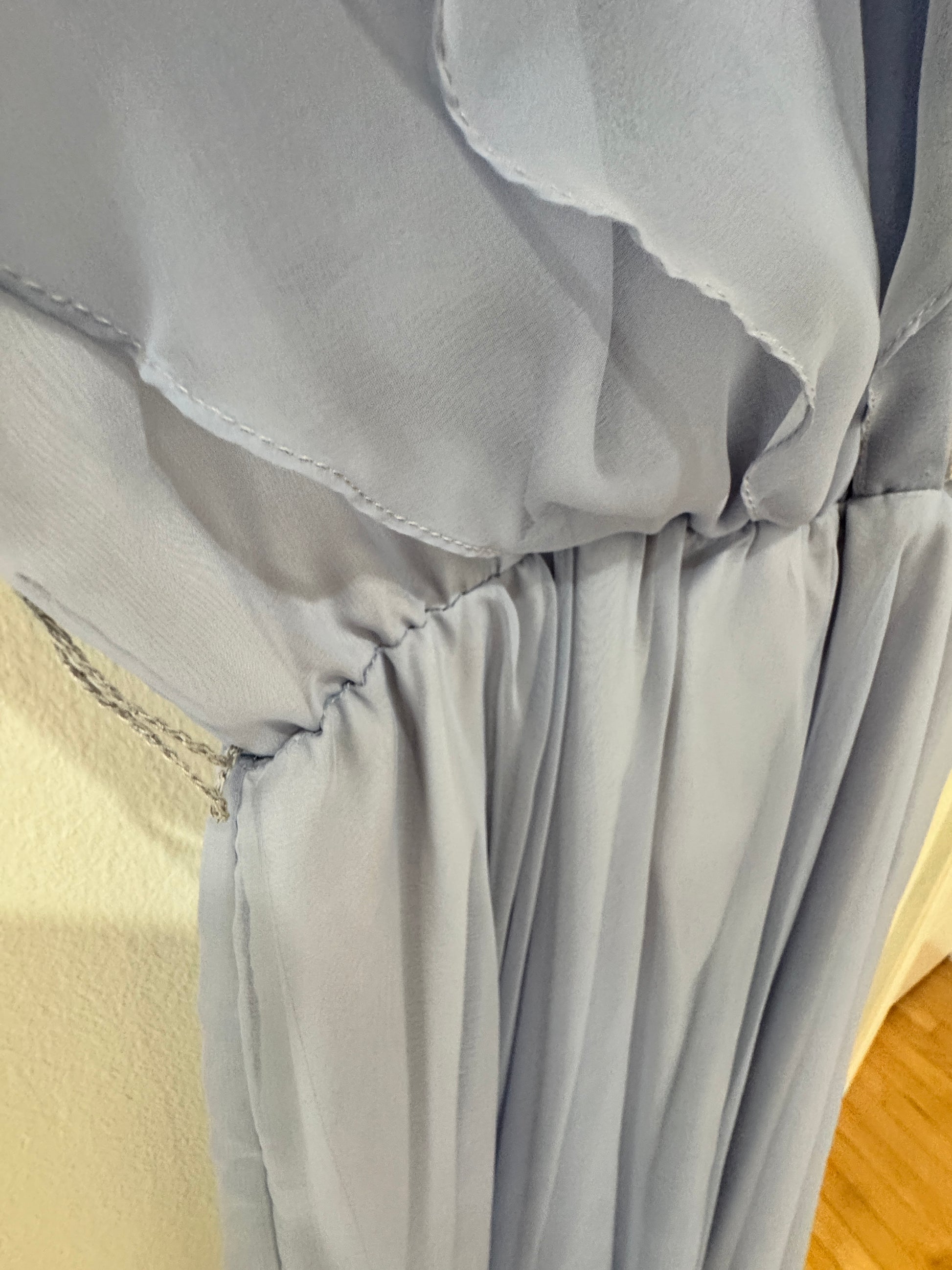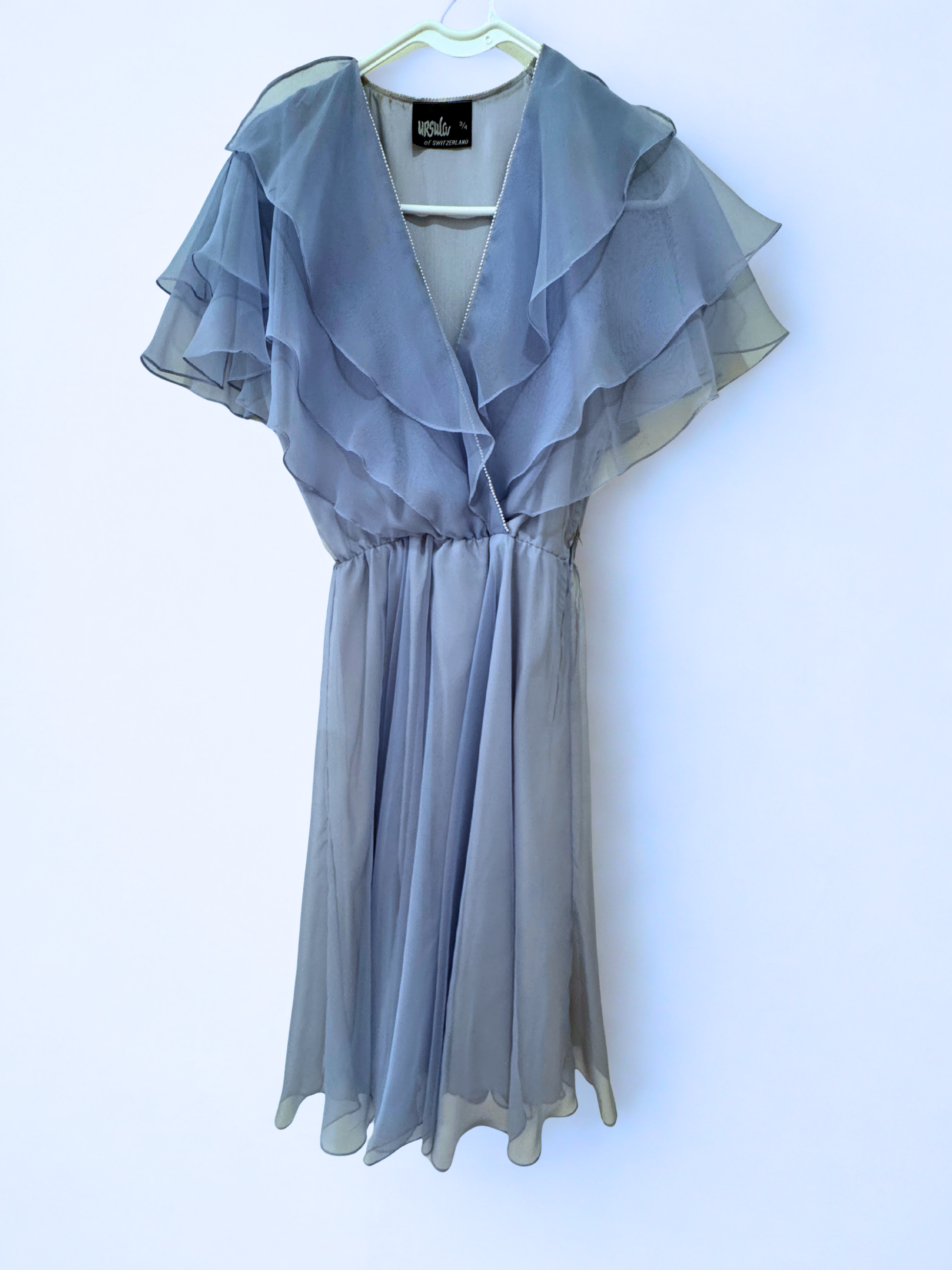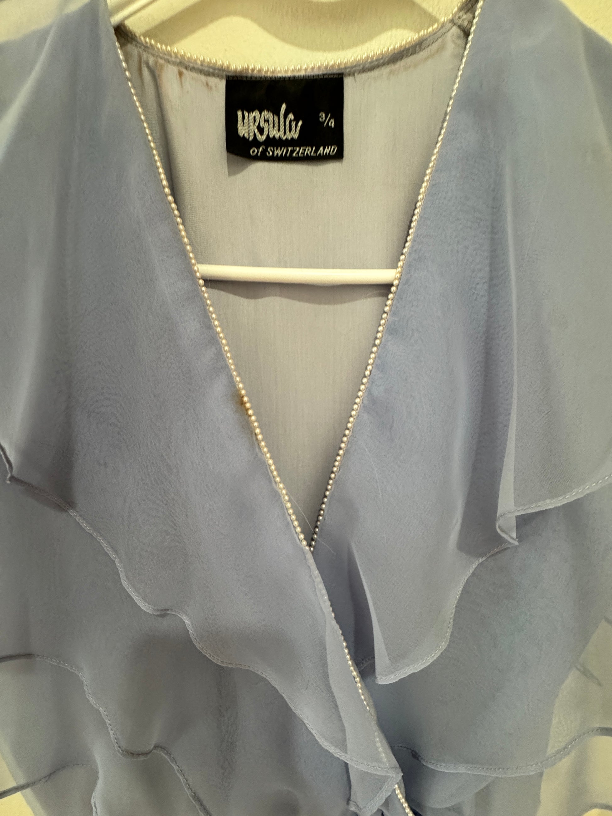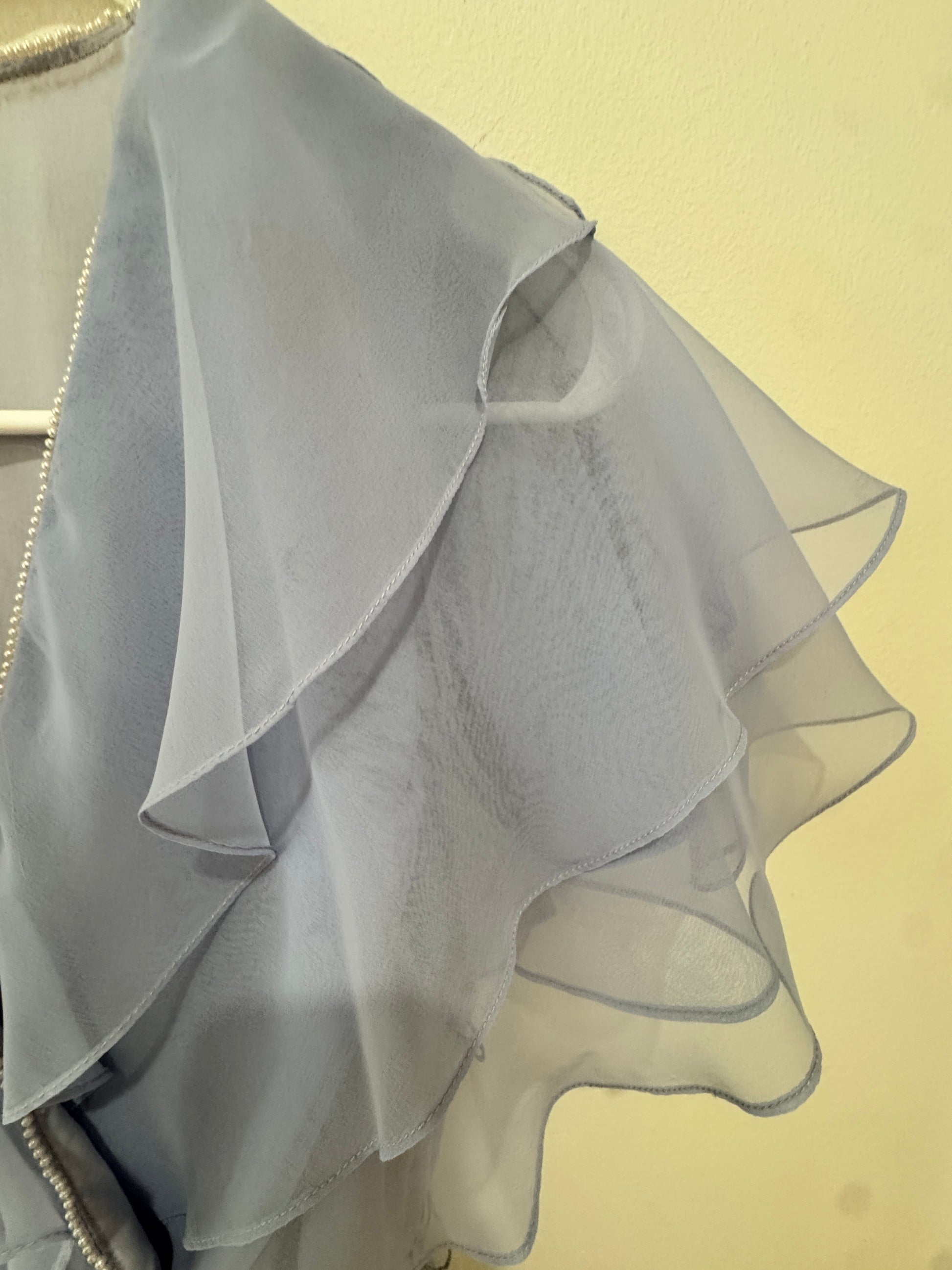 This dreamy dusty blue chiffon dress by Ursula of Switzerland features tiered flutter sleeves, a soft V-neckline with delicate pearl trim, and a gathered elastic waist. Light, romantic, and full of movement, it’s an elegant silhouette that flatters while offering effortless grace.