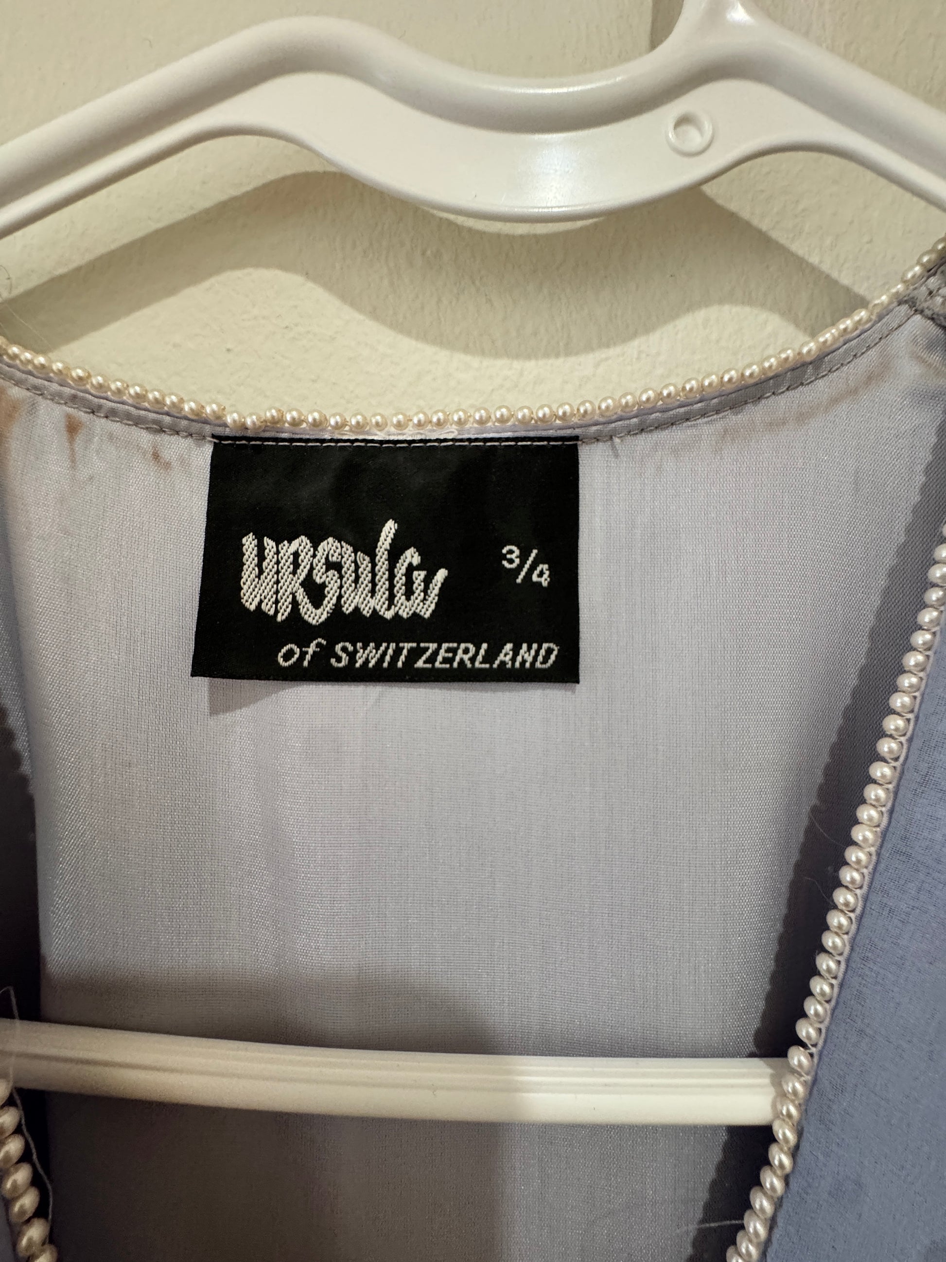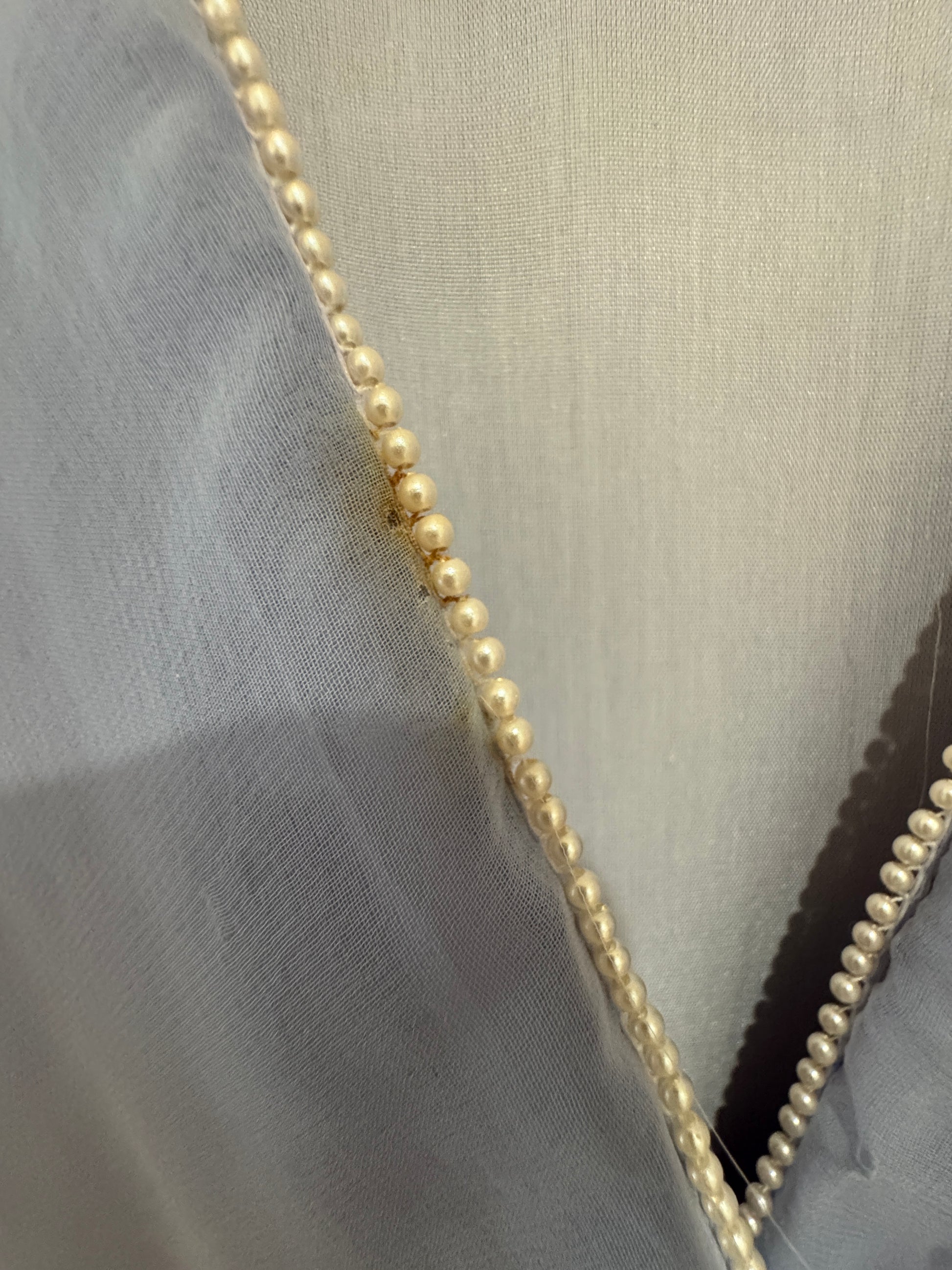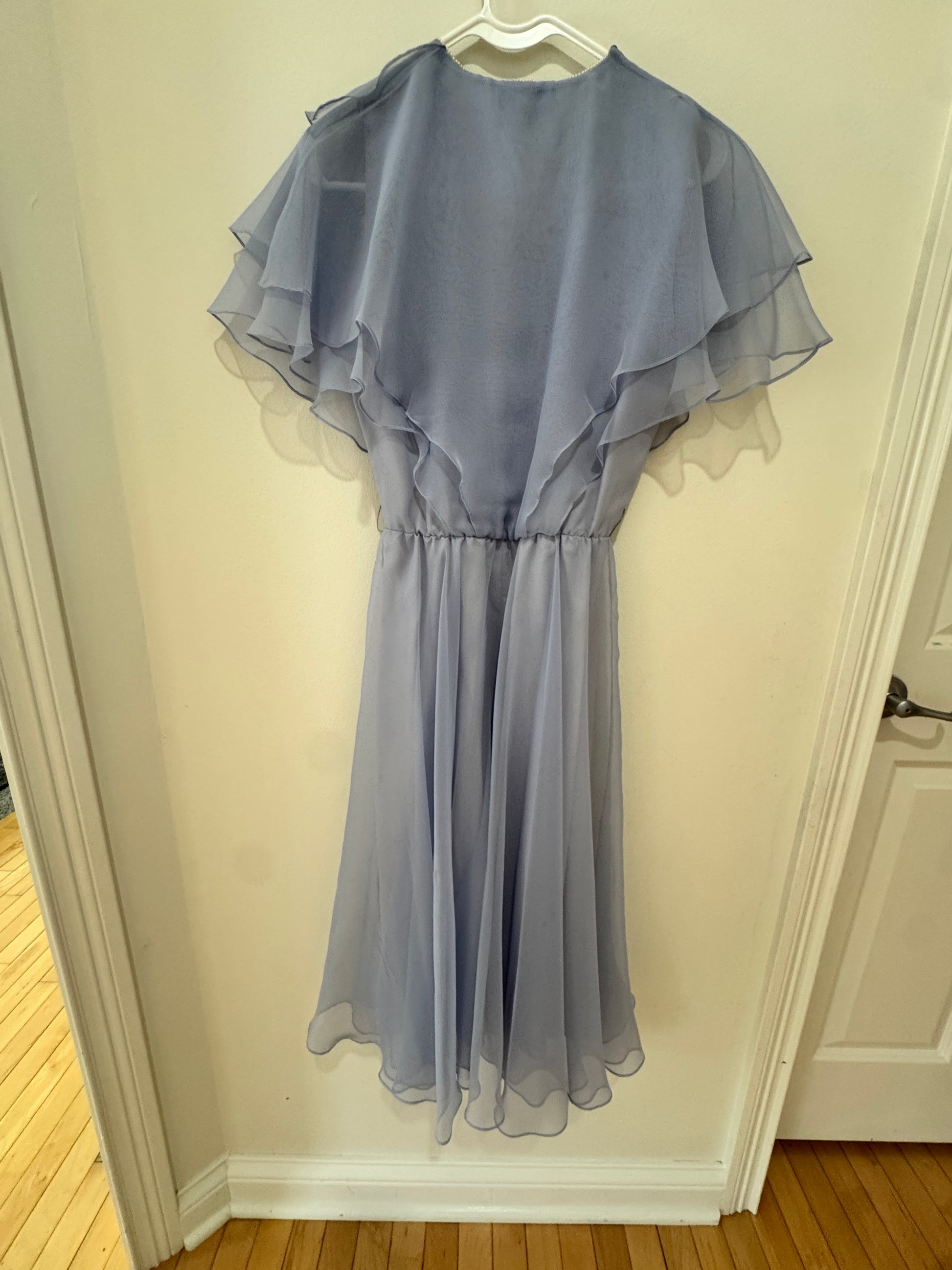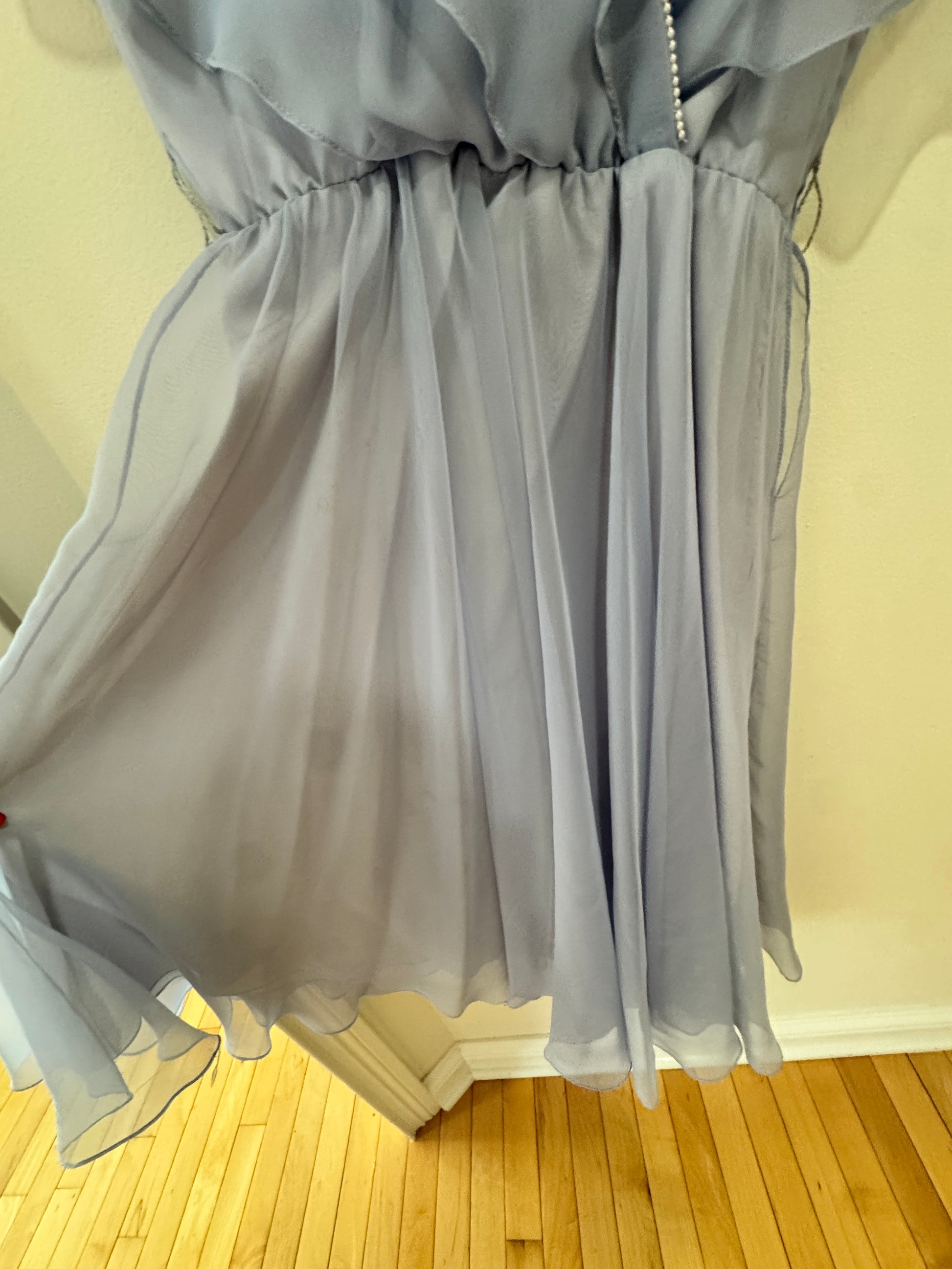 Ursula of Switzerland Pearl-Trimmed Chiffon Dress – Dusty Blue, Flutter Sleeve, Size 3/4