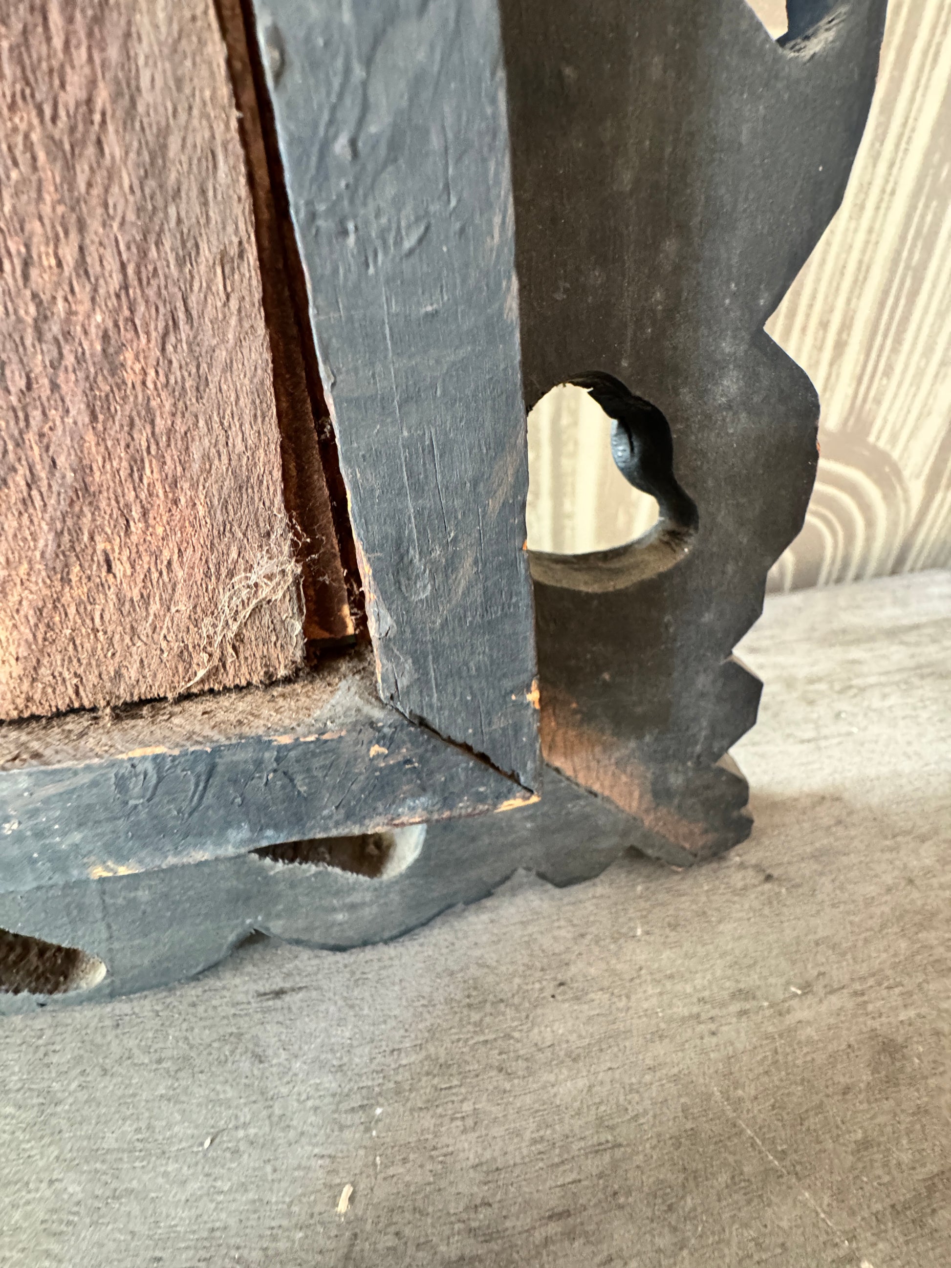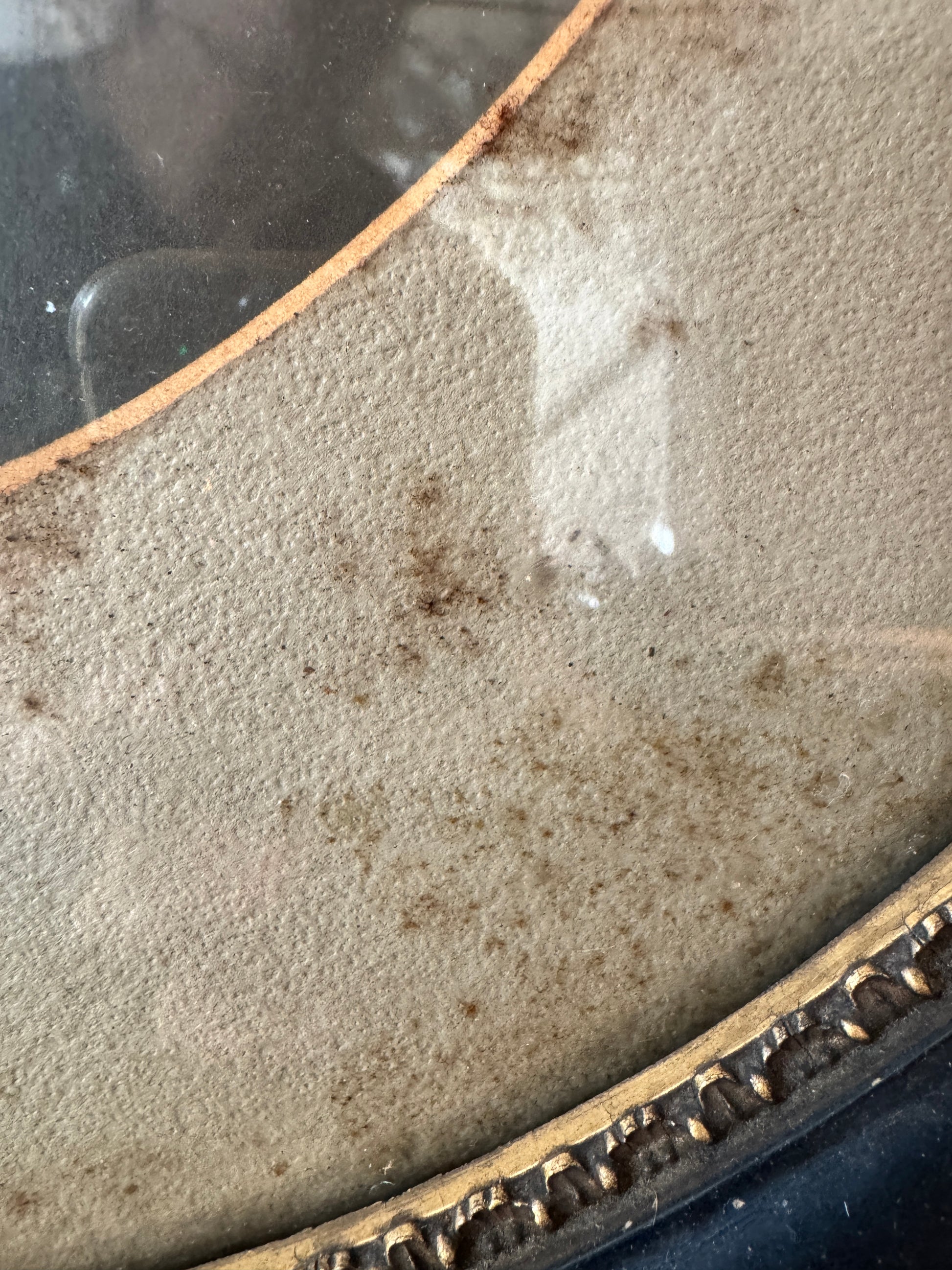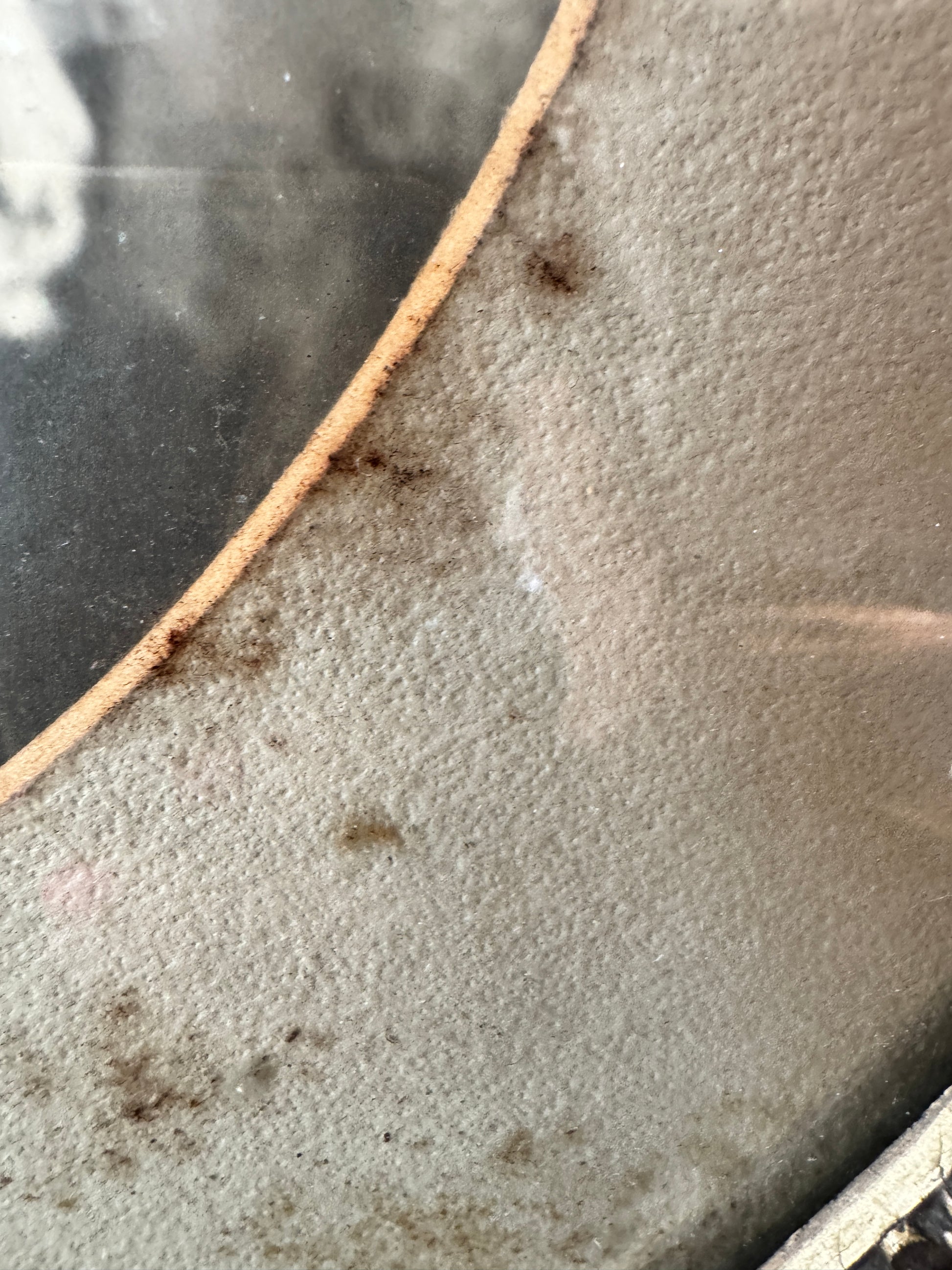 The portrait has visible water staining to the inner matboard and minor rippling to the frame’s interior edge — consistent with age and prior moisture exposure. These imperfections do not affect the photograph itself and only enhance the timeworn appeal of this character-filled piece.