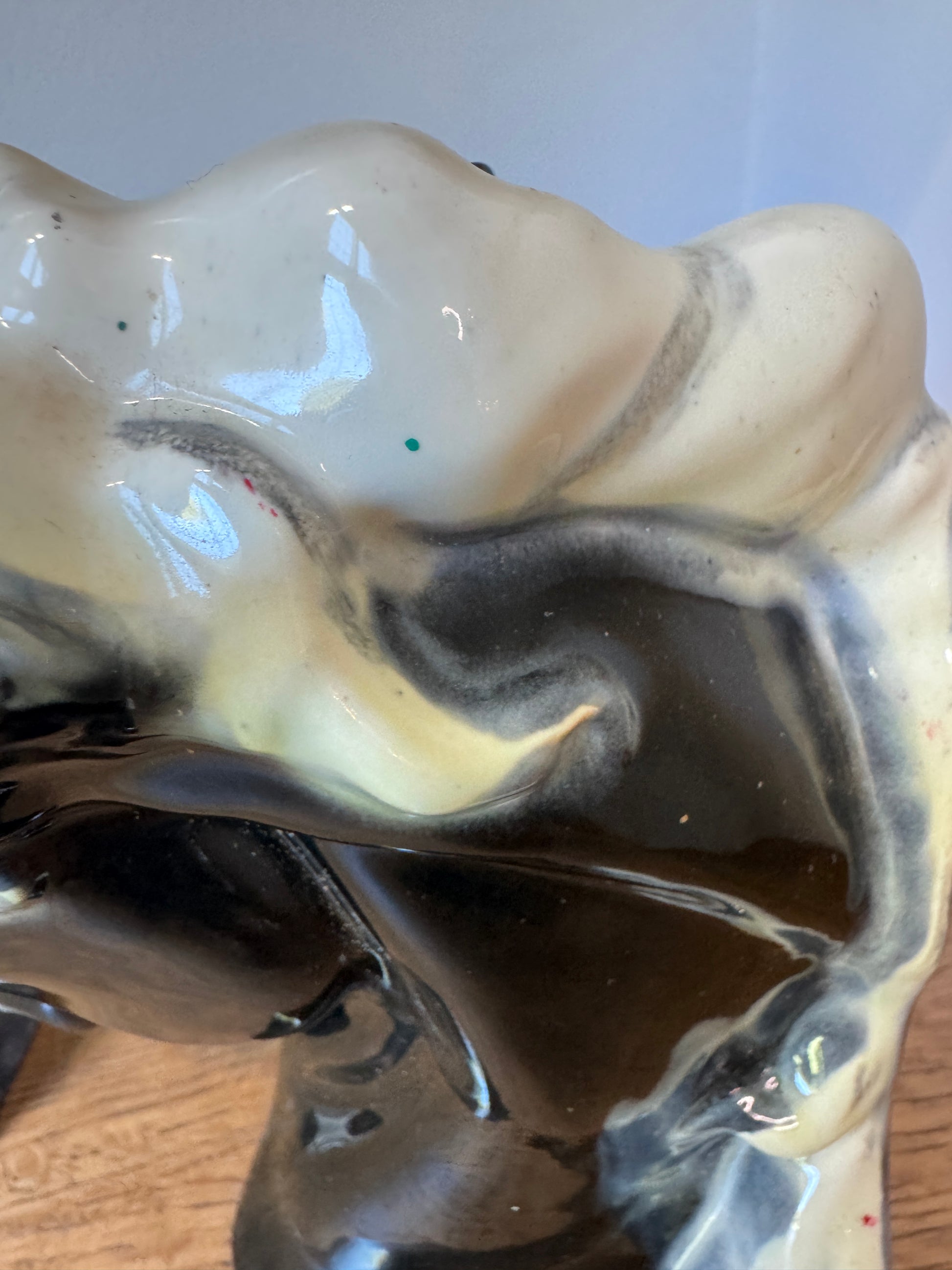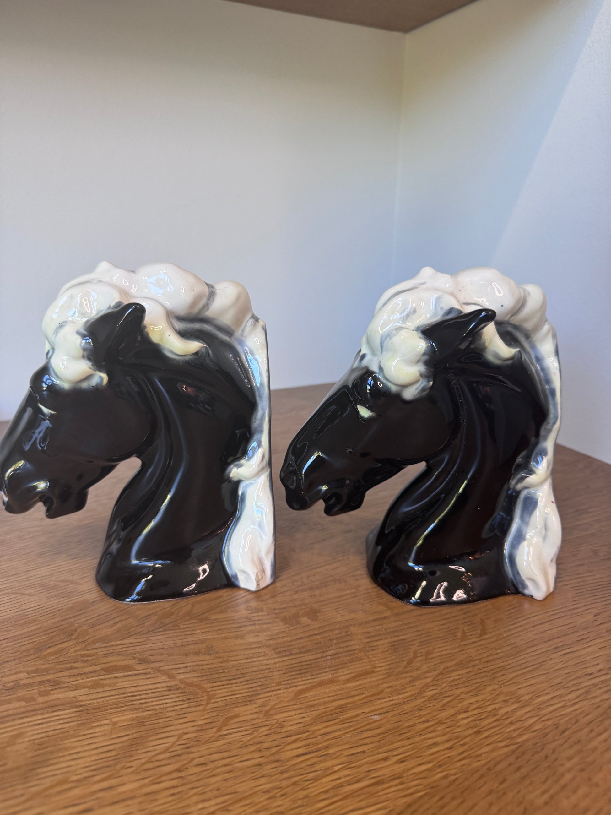 Striking pair of vintage ceramic horse head bookends, signed L. Hall (1974) and finished in a glossy black glaze with ivory mane detailing. Sculptural, heavy, and bold — perfect for equestrian décor, office styling, or adding a dramatic statement to a bookshelf.