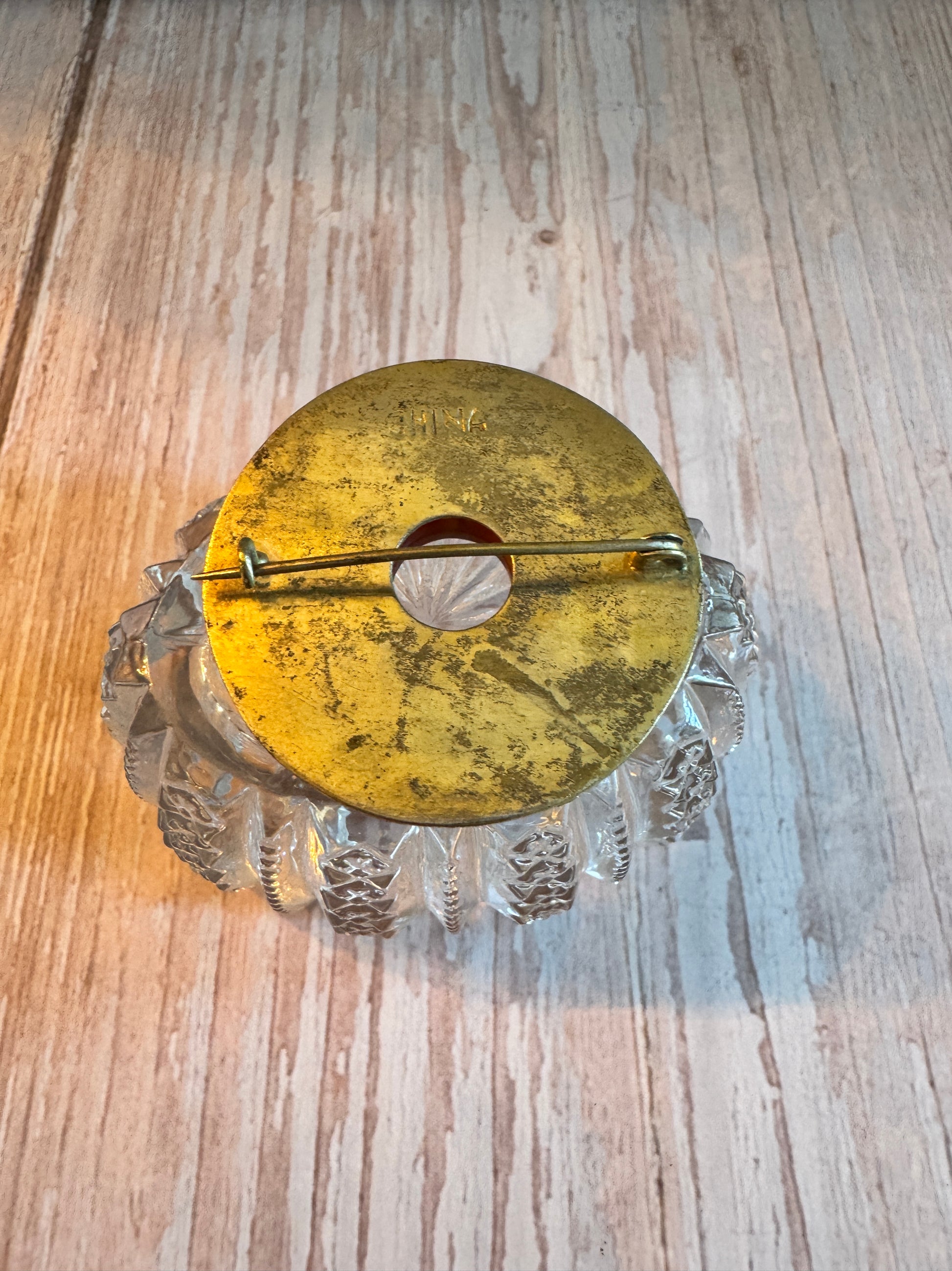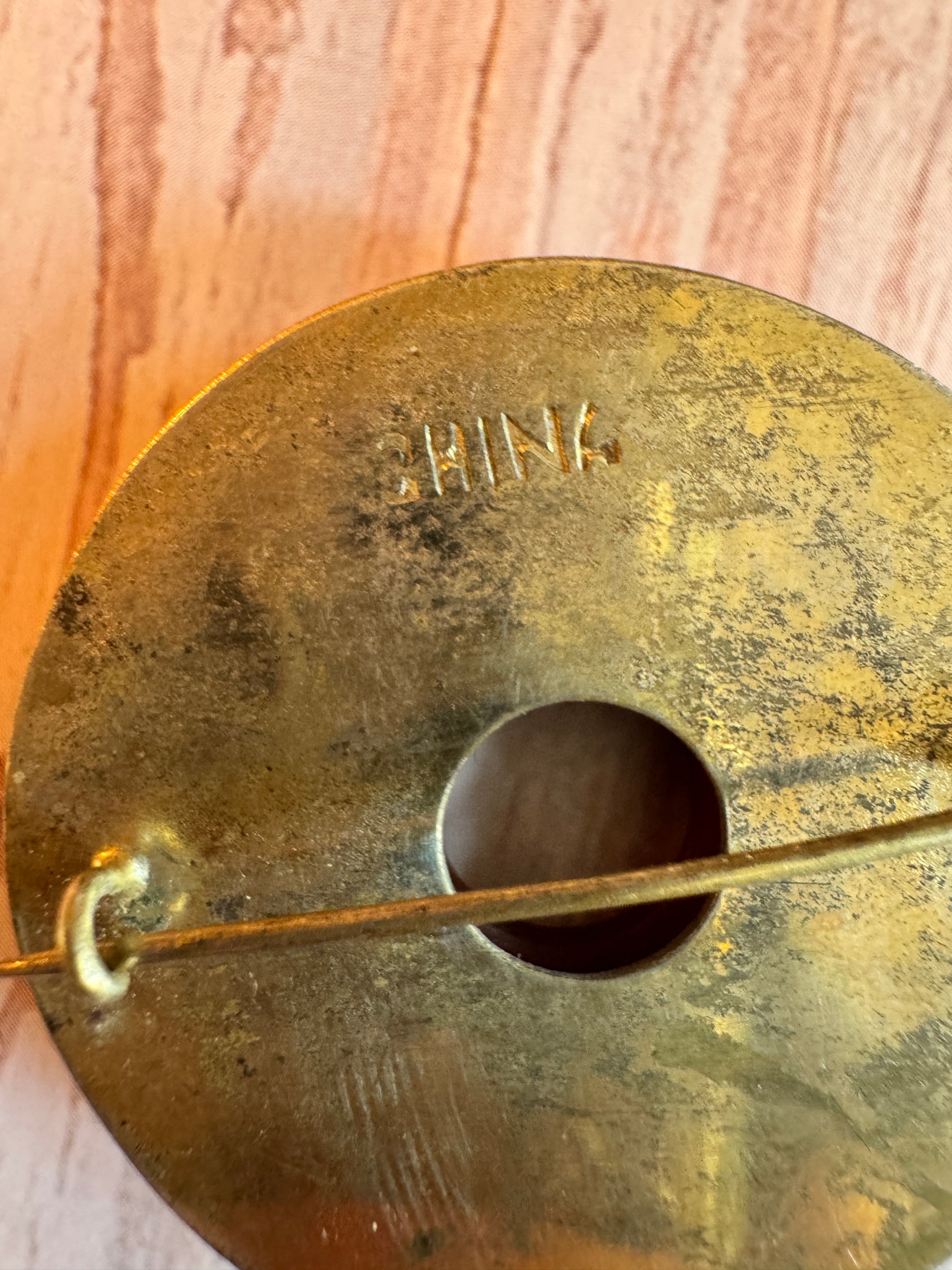 Stamped CHINA on the back, the brooch likely dates from the 1960s to 1980s, when decorative Chinese export jewelry rose in popularity for its vibrant colors and detailed metalwork.