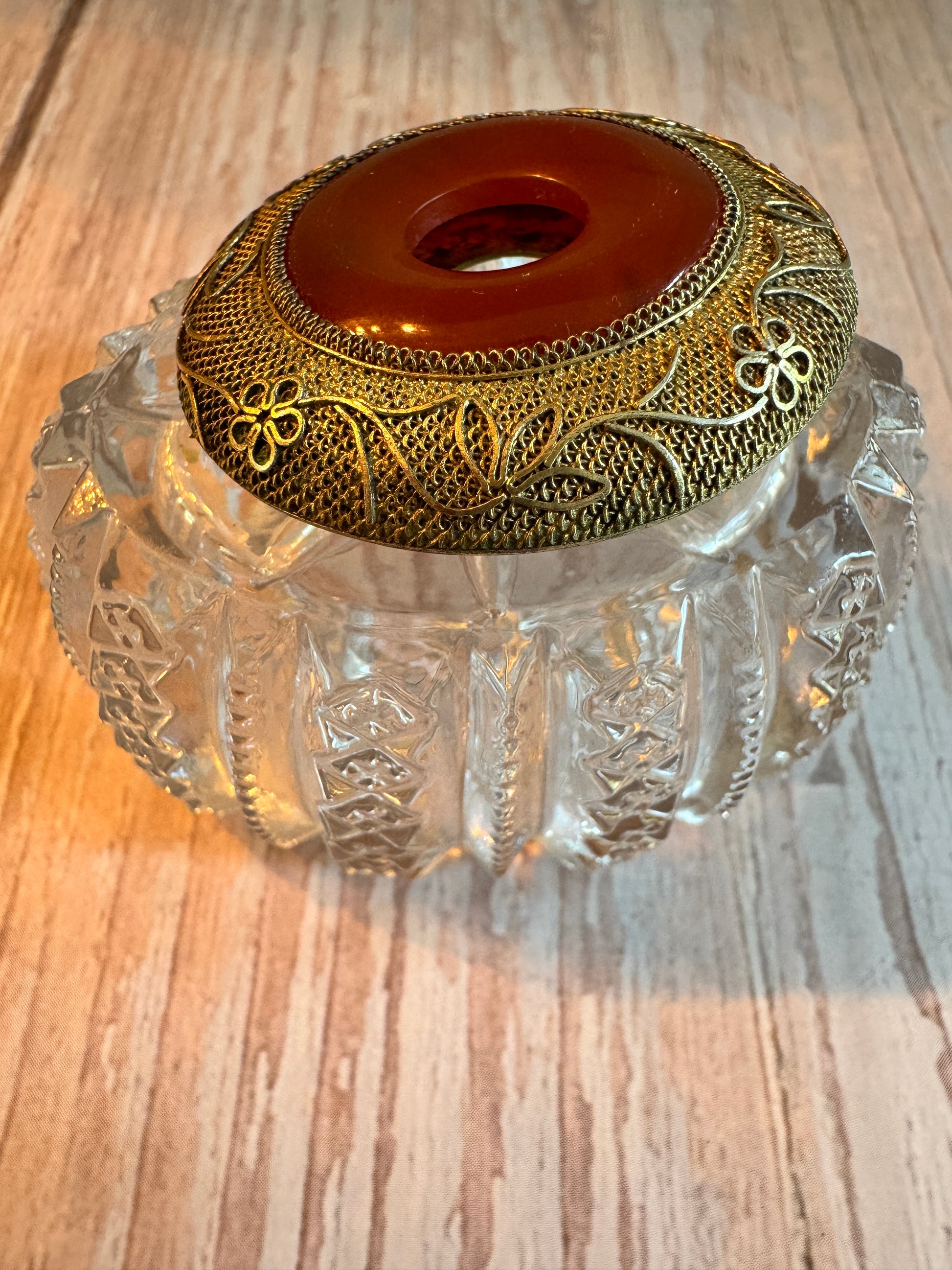 This vintage brooch is a beautiful example of mid-century Chinese export costume jewelry. It features a round amber-hued center stone—likely faux carnelian or dyed agate—framed by ornate brass-toned filigree with delicate floral and vine motifs.