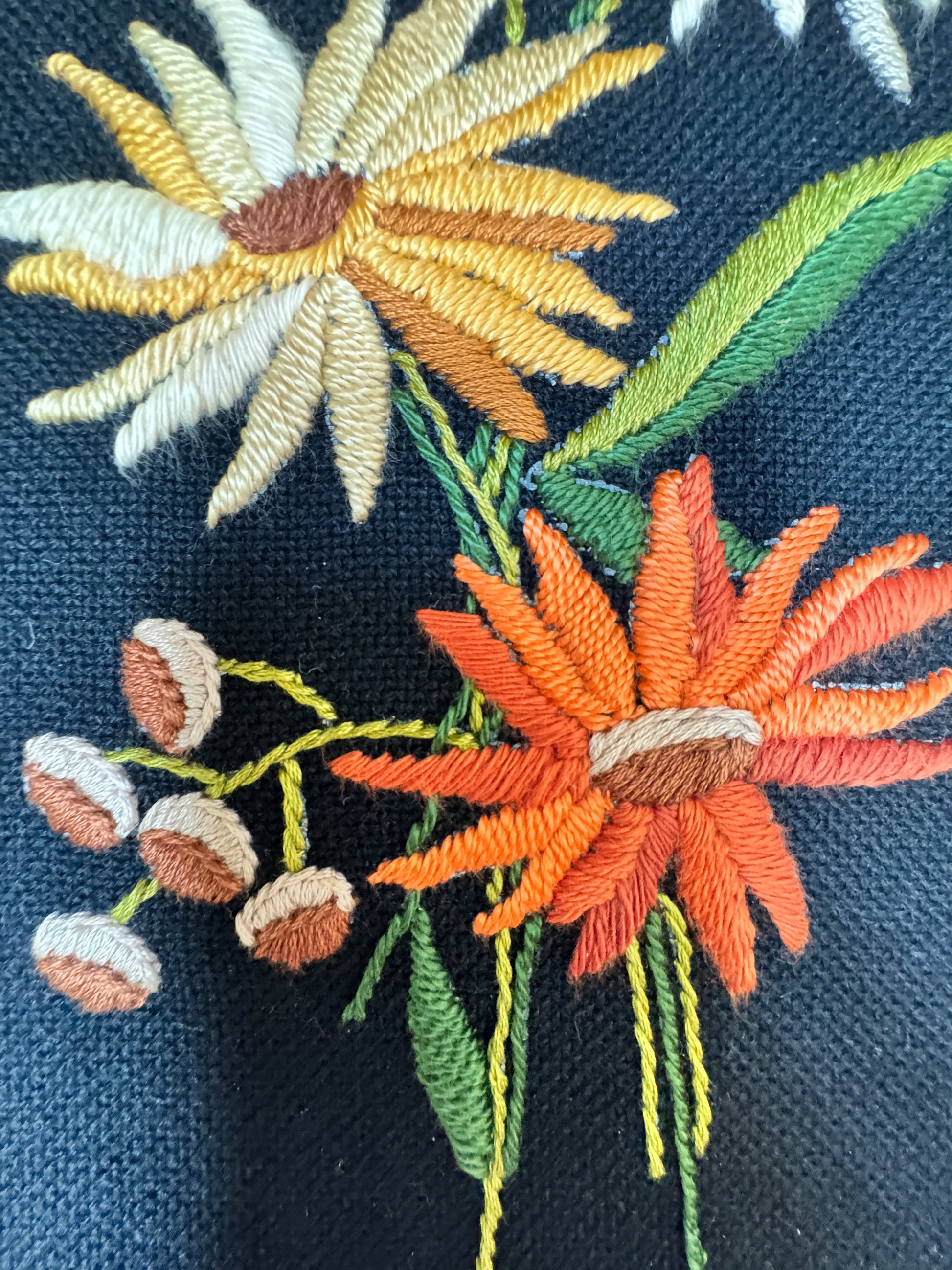 Charming vintage hand-stitched floral embroidery, displayed in its original warm wooden frame. Featuring colorful blooms in shades of orange, yellow, white, and green against a dark background, this piece brings a touch of mid-century charm and craftsmanship to any space.