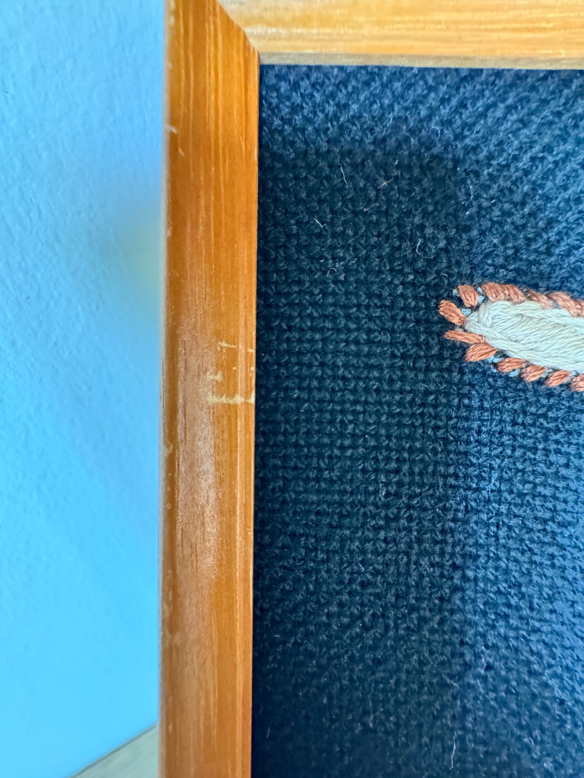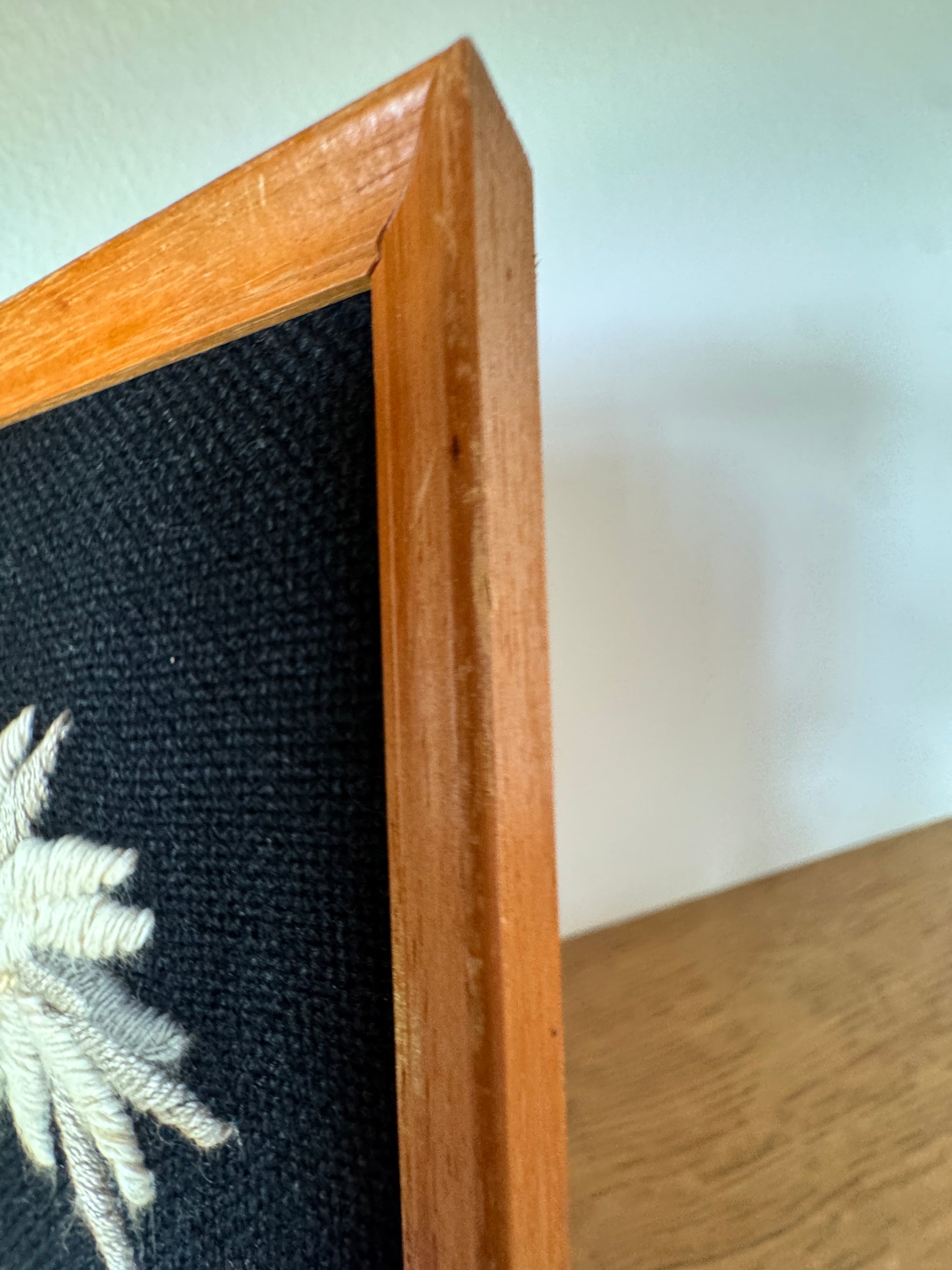 Measuring 11.5” tall x 7.5” wide, this textile wall art makes a lovely accent for a gallery wall, cozy nook, or vintage-inspired home. The embroidery is neatly preserved and ready to hang or lean for display.