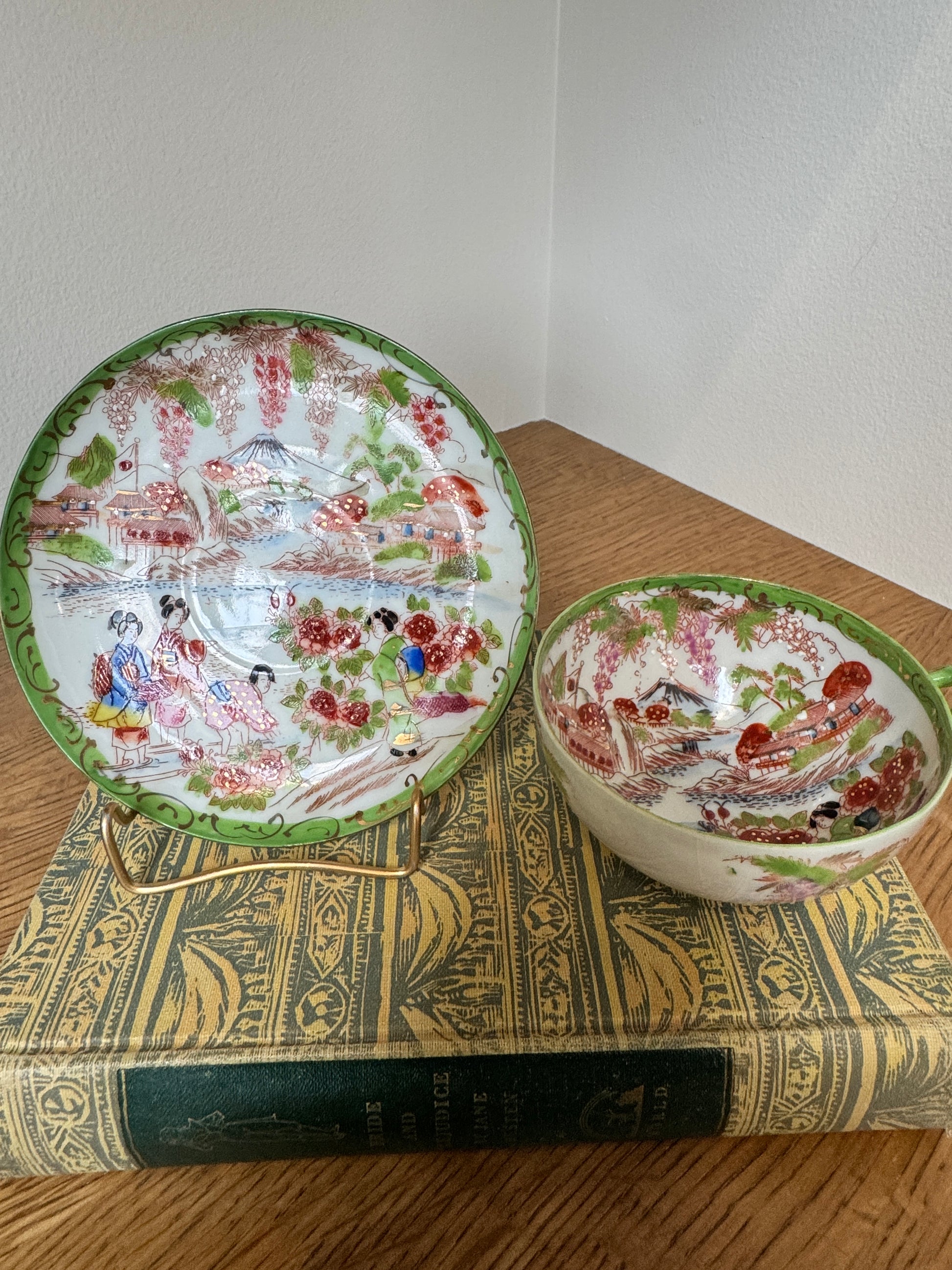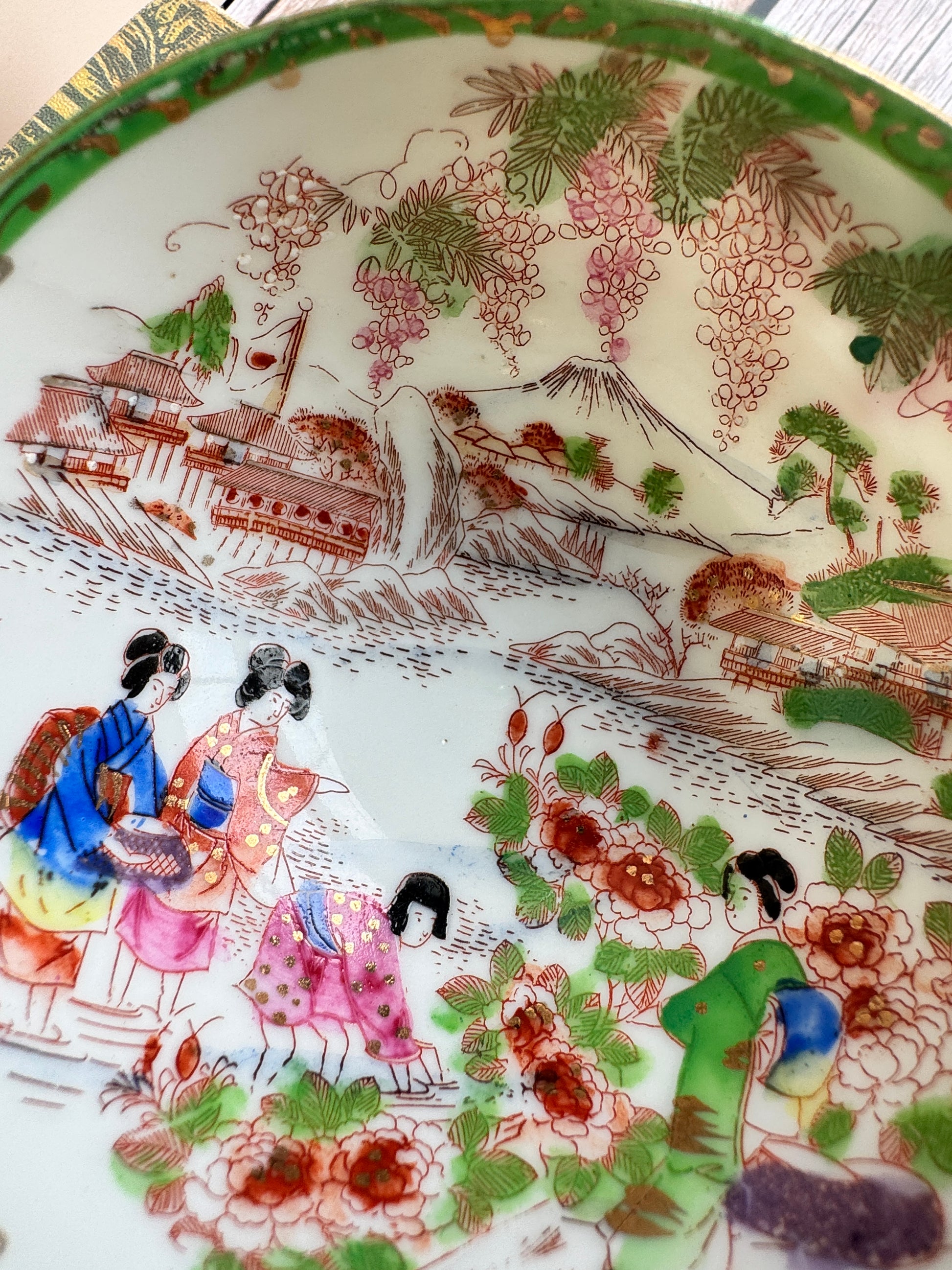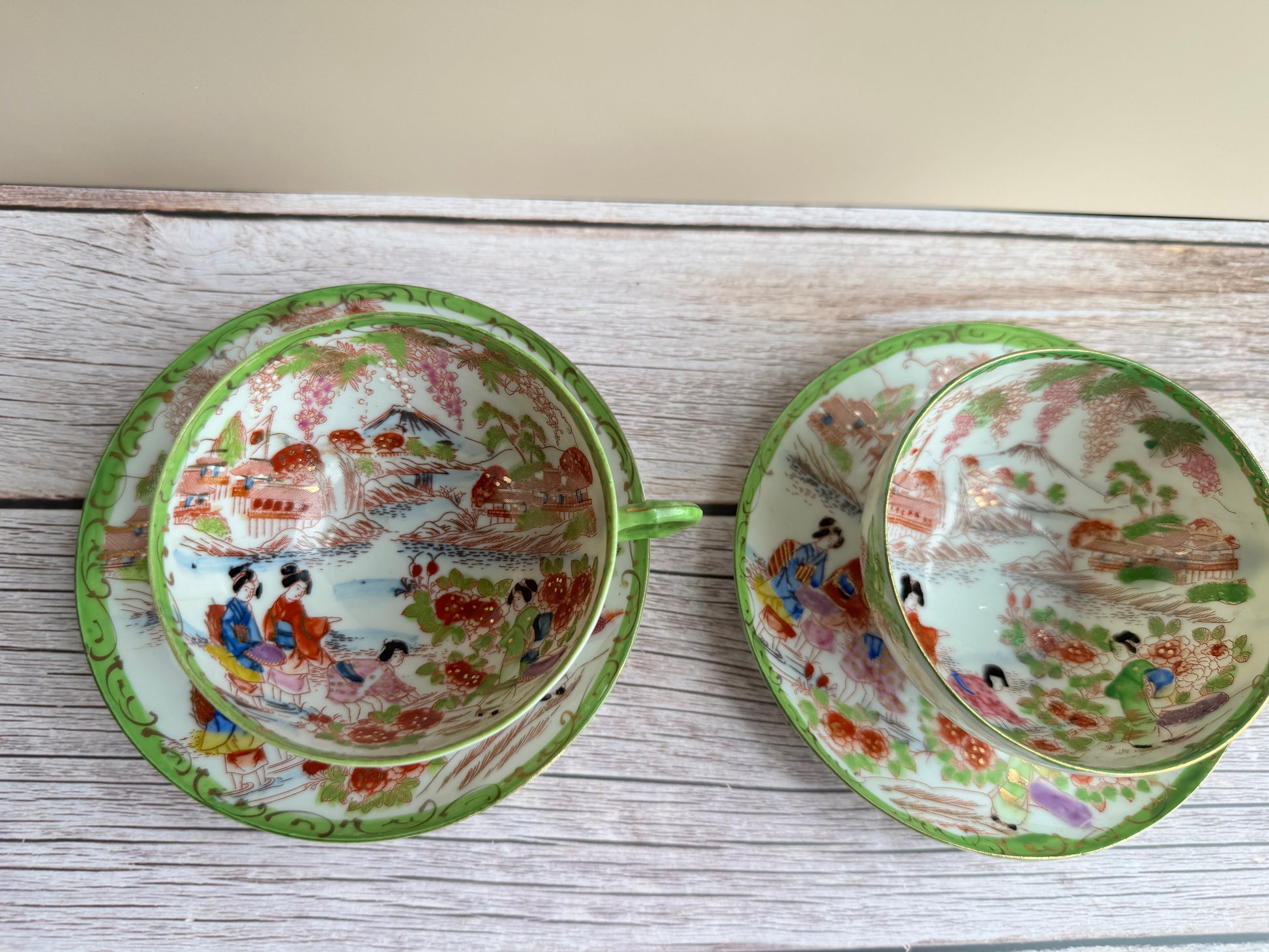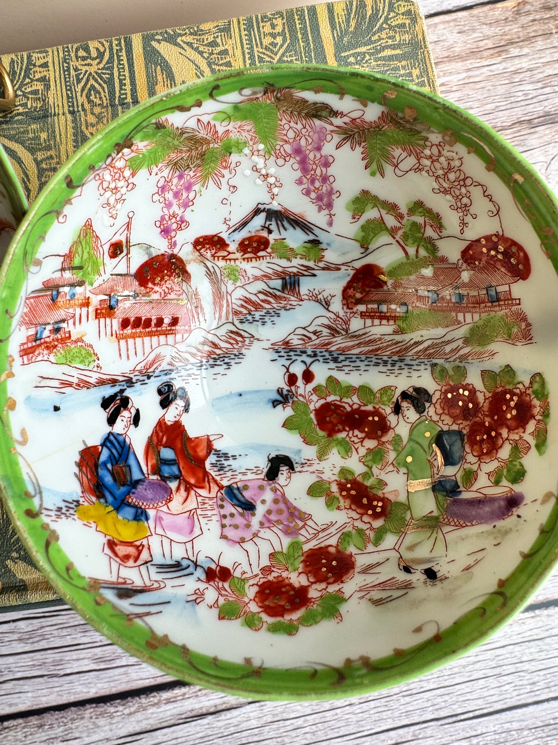 This delicate pair of vintage Japanese teacups and saucers features exquisite hand-painted scenic motifs—mountains, temples, trees, and water—framed in traditional red, green, and gold tones. Likely mid-20th century, these porcelain pieces reflect Japan’s export era, when fine wares were created for Western markets with an emphasis on artistry and elegance.