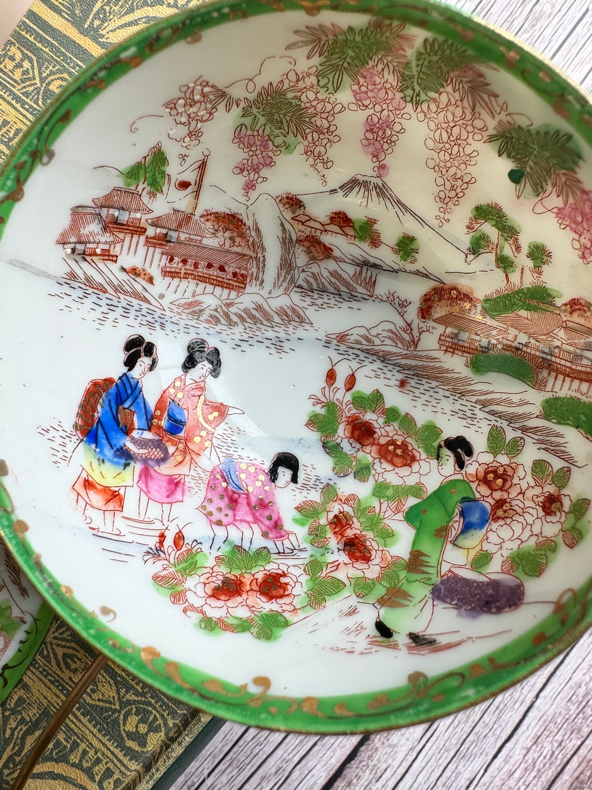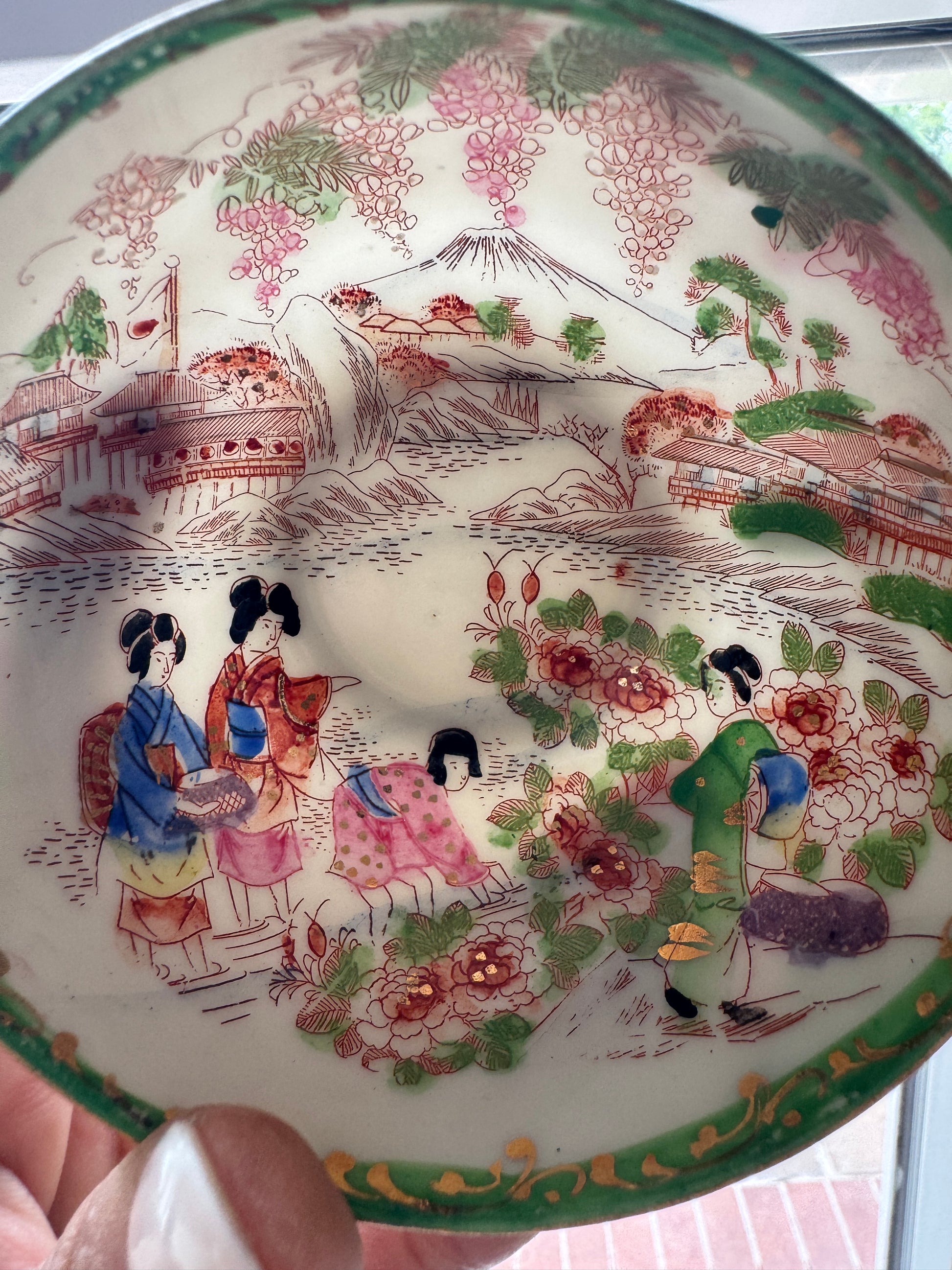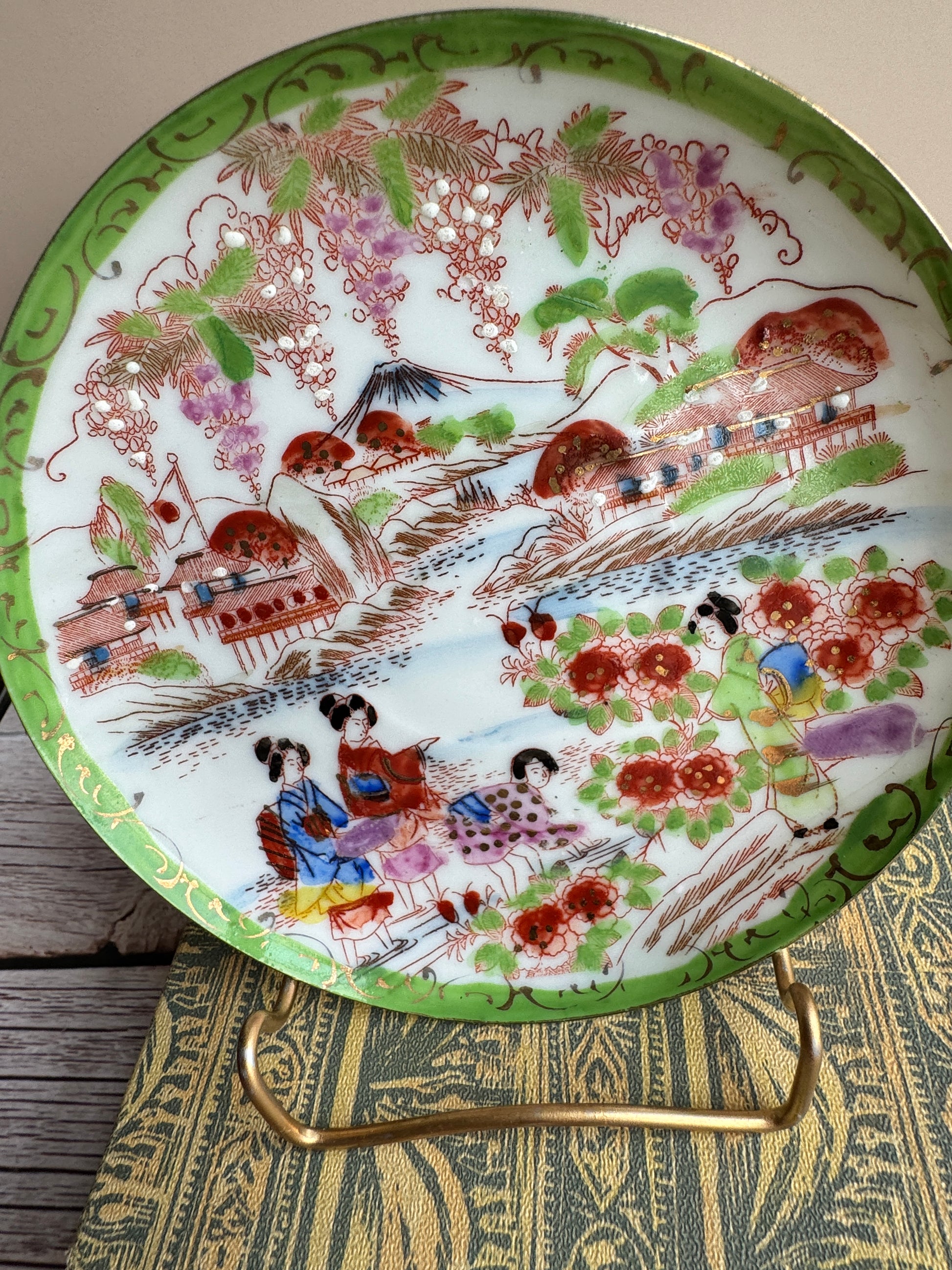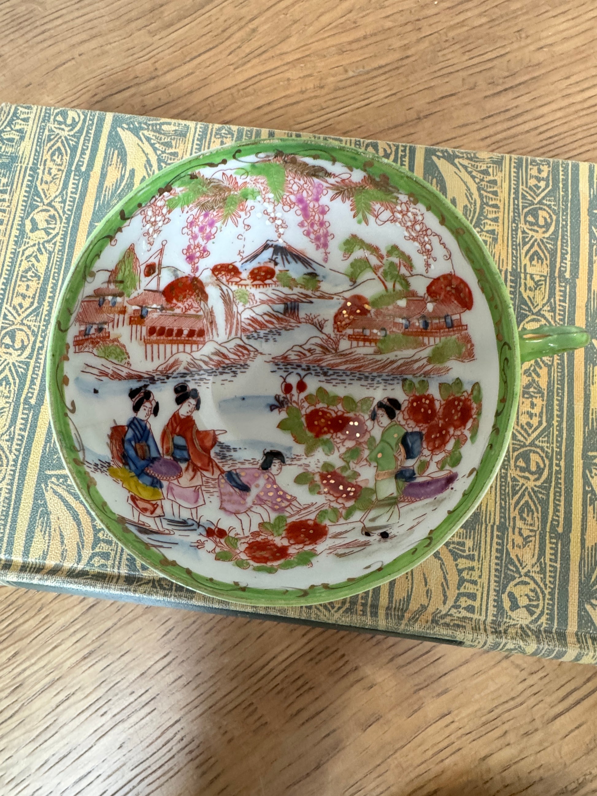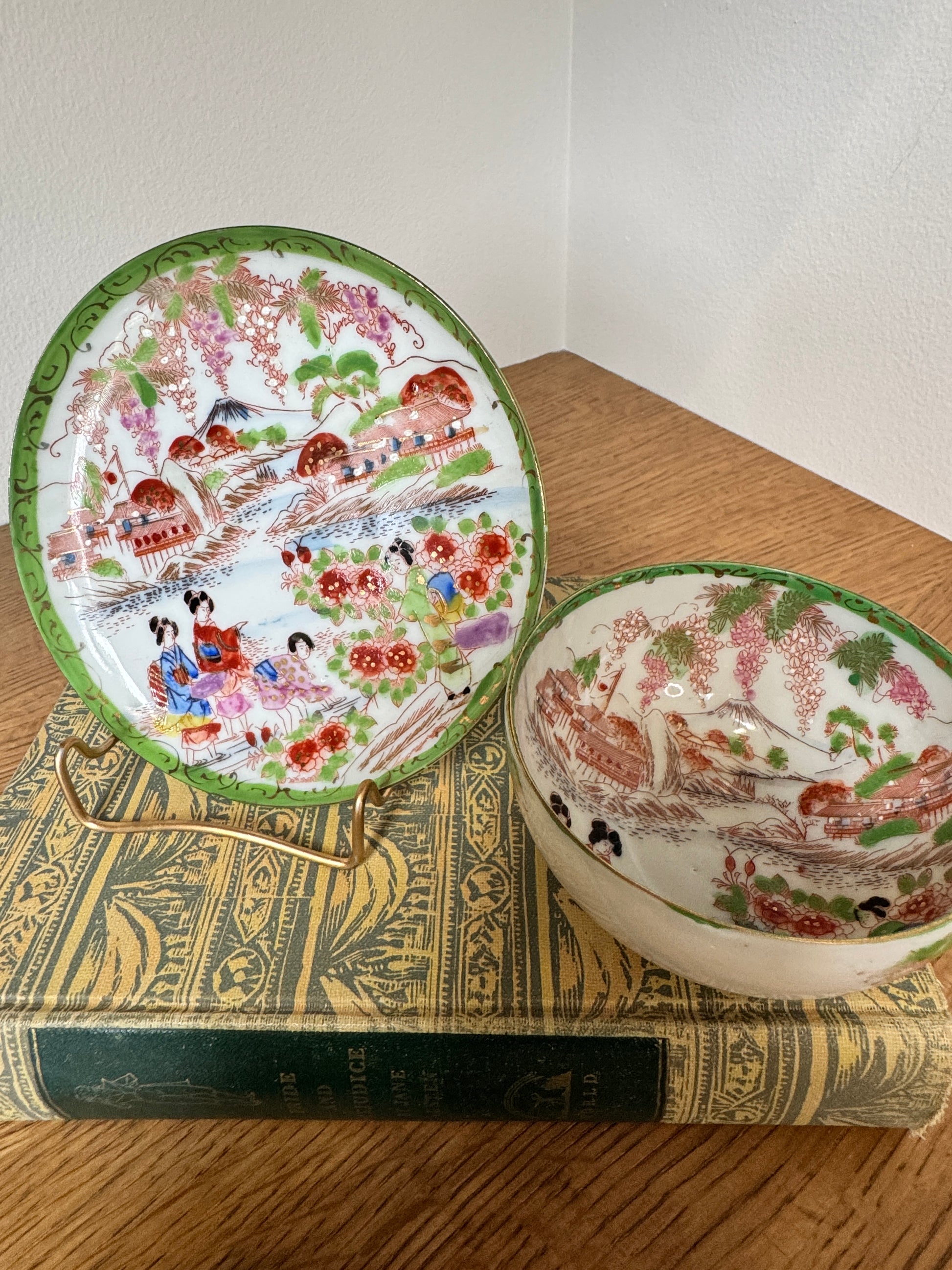 This delicate pair of vintage Japanese teacups and saucers features exquisite hand-painted scenic motifs—mountains, temples, trees, and water—framed in traditional red, green, and gold tones. Likely mid-20th century, these porcelain pieces reflect Japan’s export era, when fine wares were created for Western markets with an emphasis on artistry and elegance.