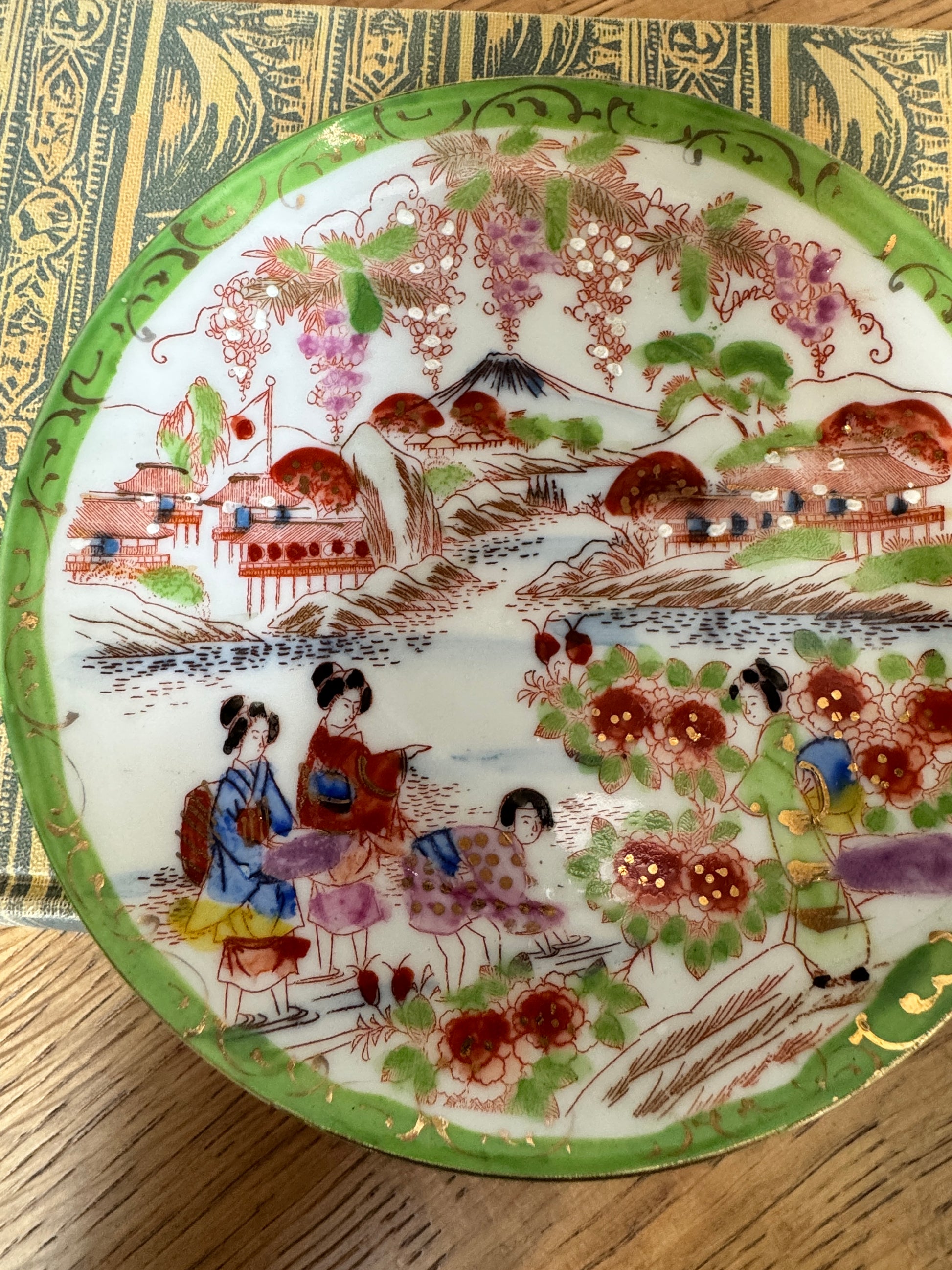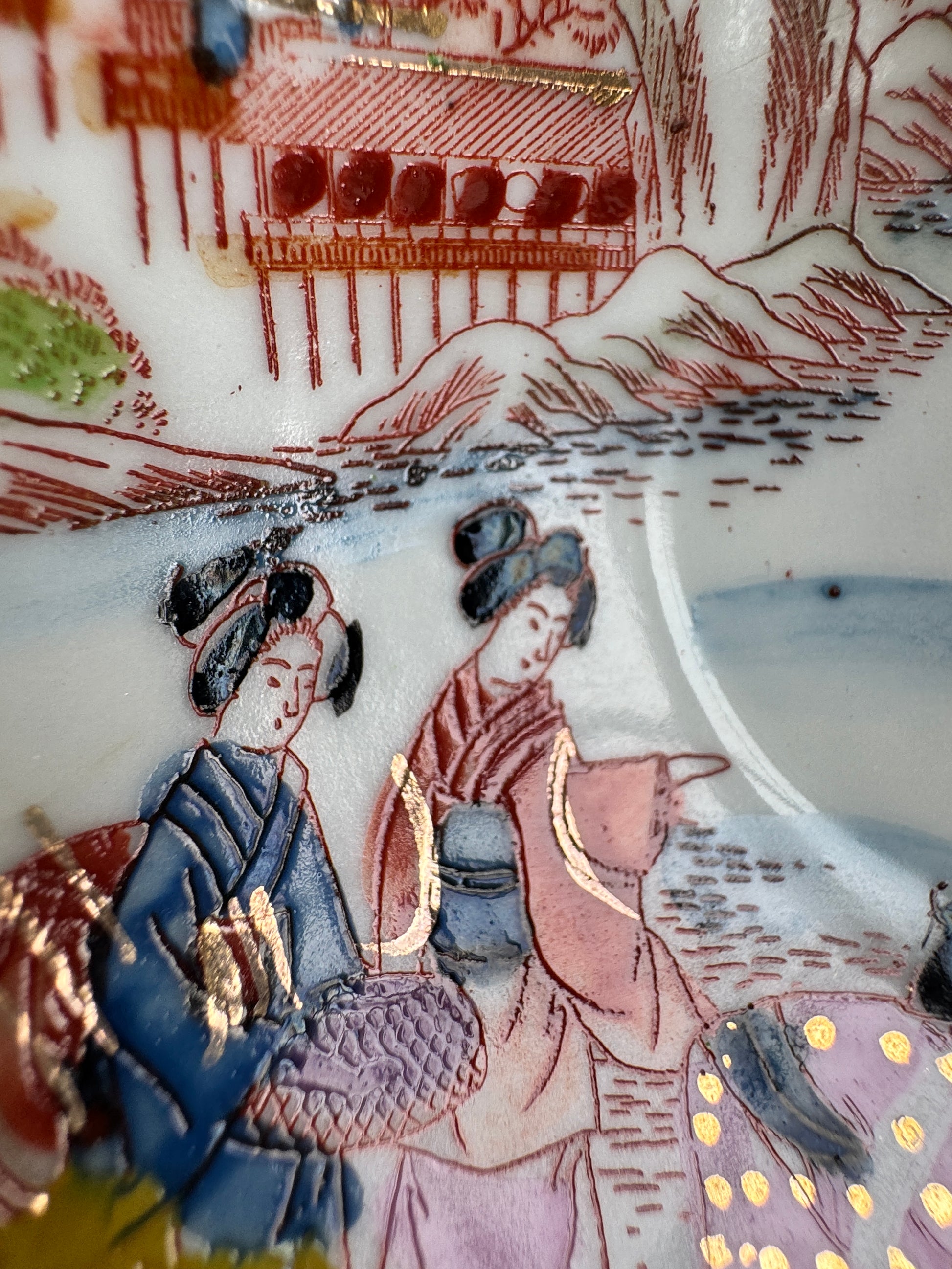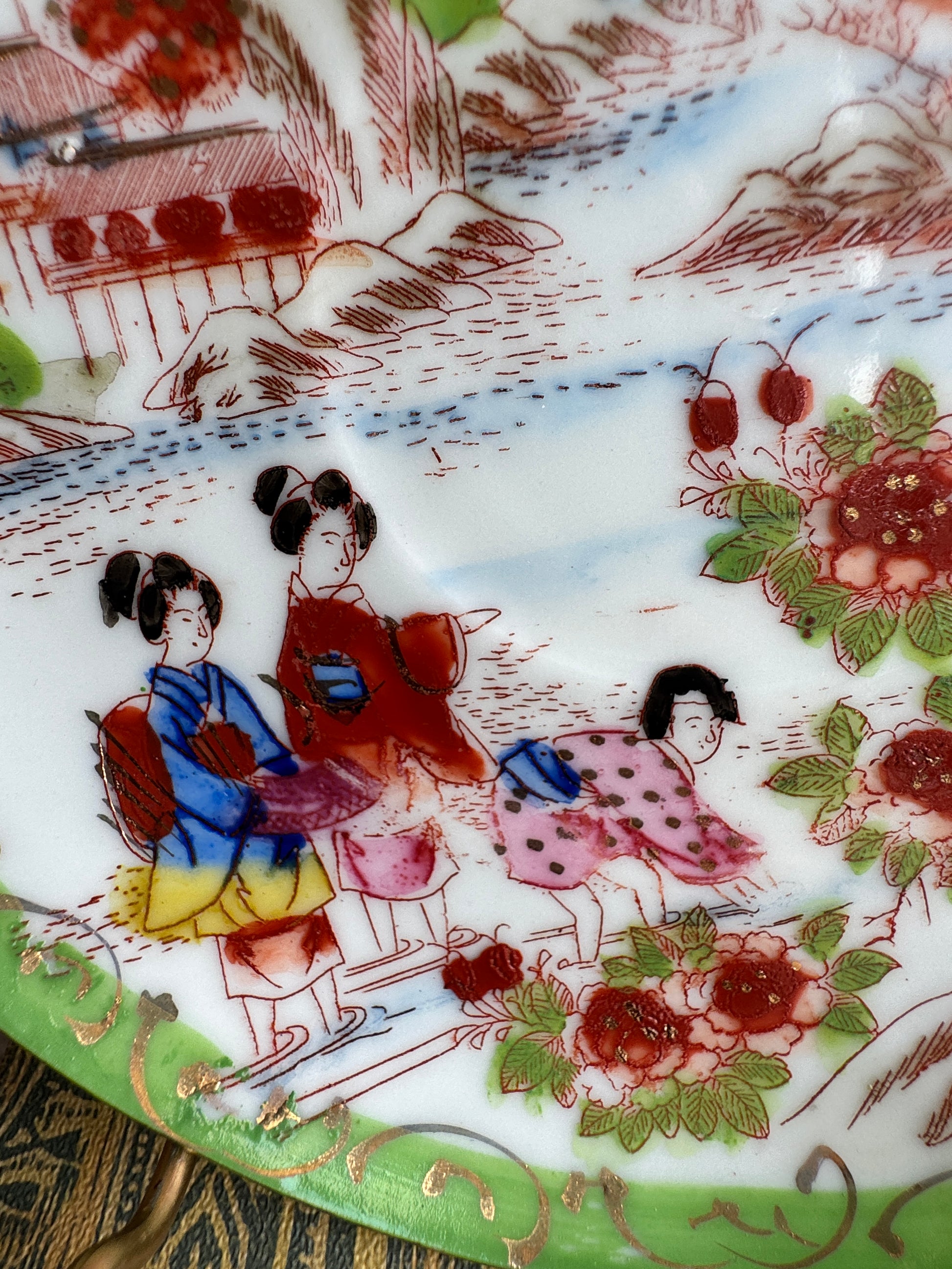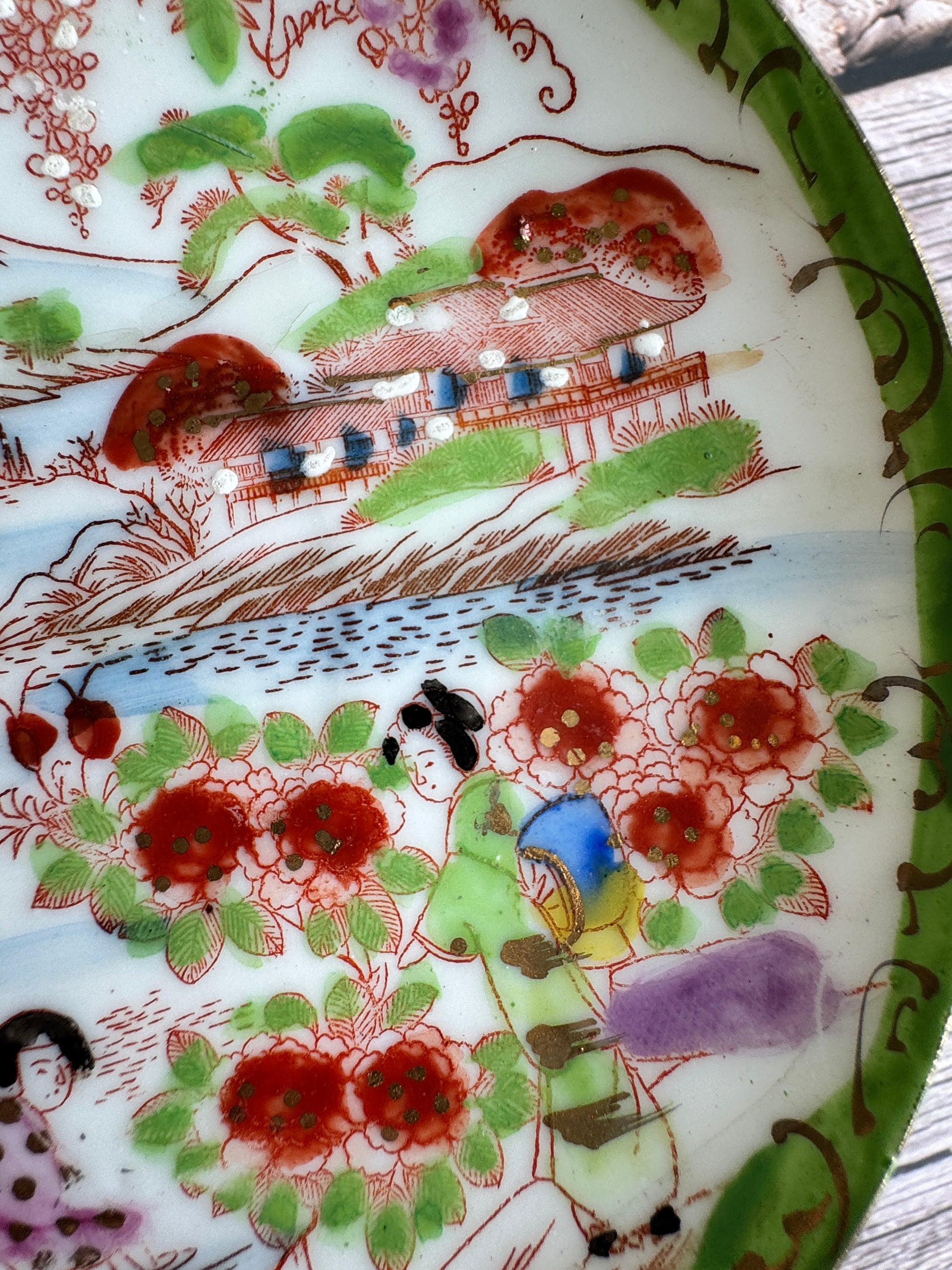 This delicate pair of vintage Japanese teacups and saucers features exquisite hand-painted scenic motifs—mountains, temples, trees, and water—framed in traditional red, green, and gold tones. Likely mid-20th century, these porcelain pieces reflect Japan’s export era, when fine wares were created for Western markets with an emphasis on artistry and elegance.