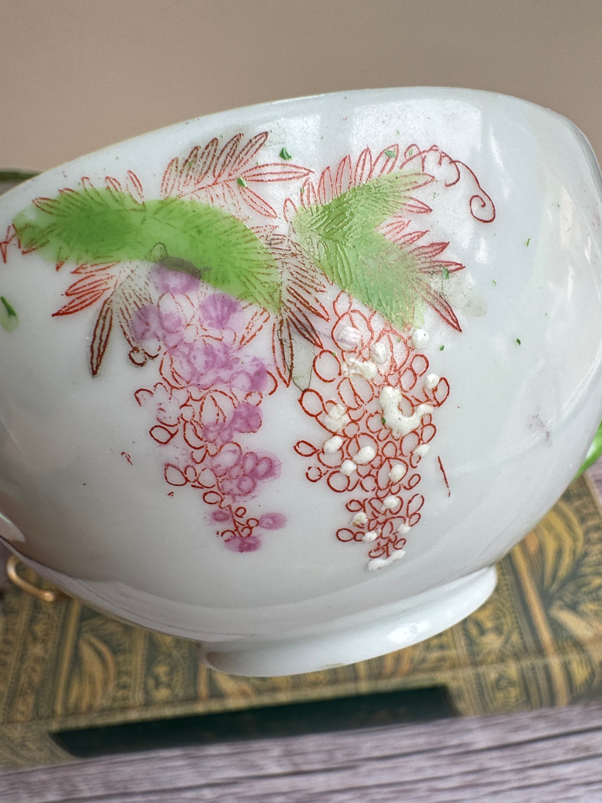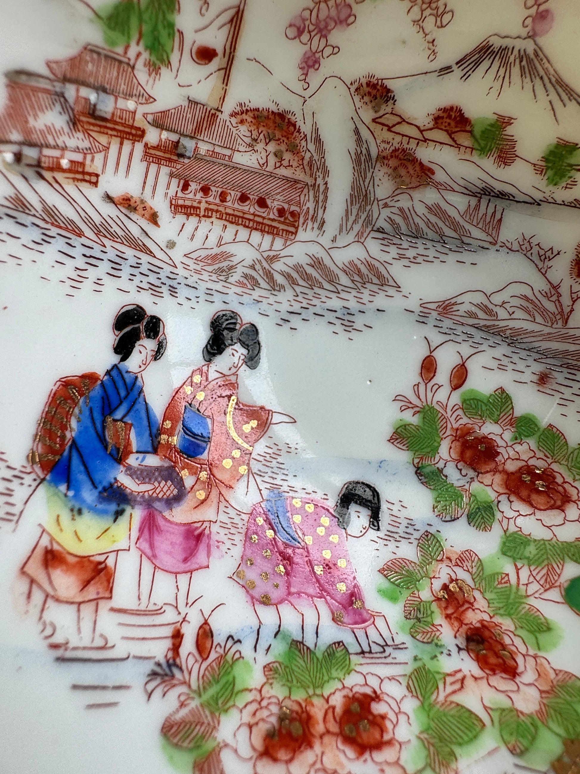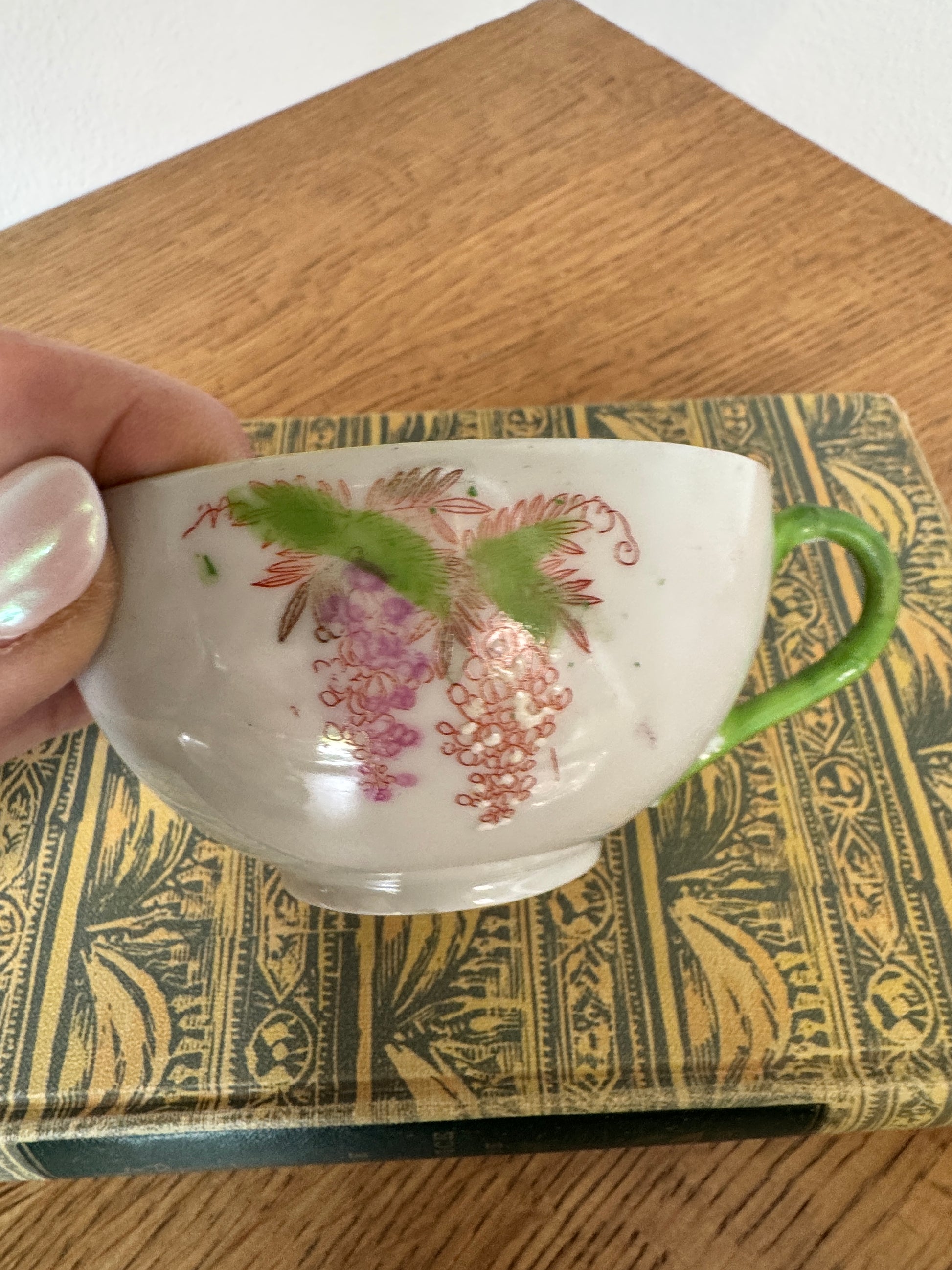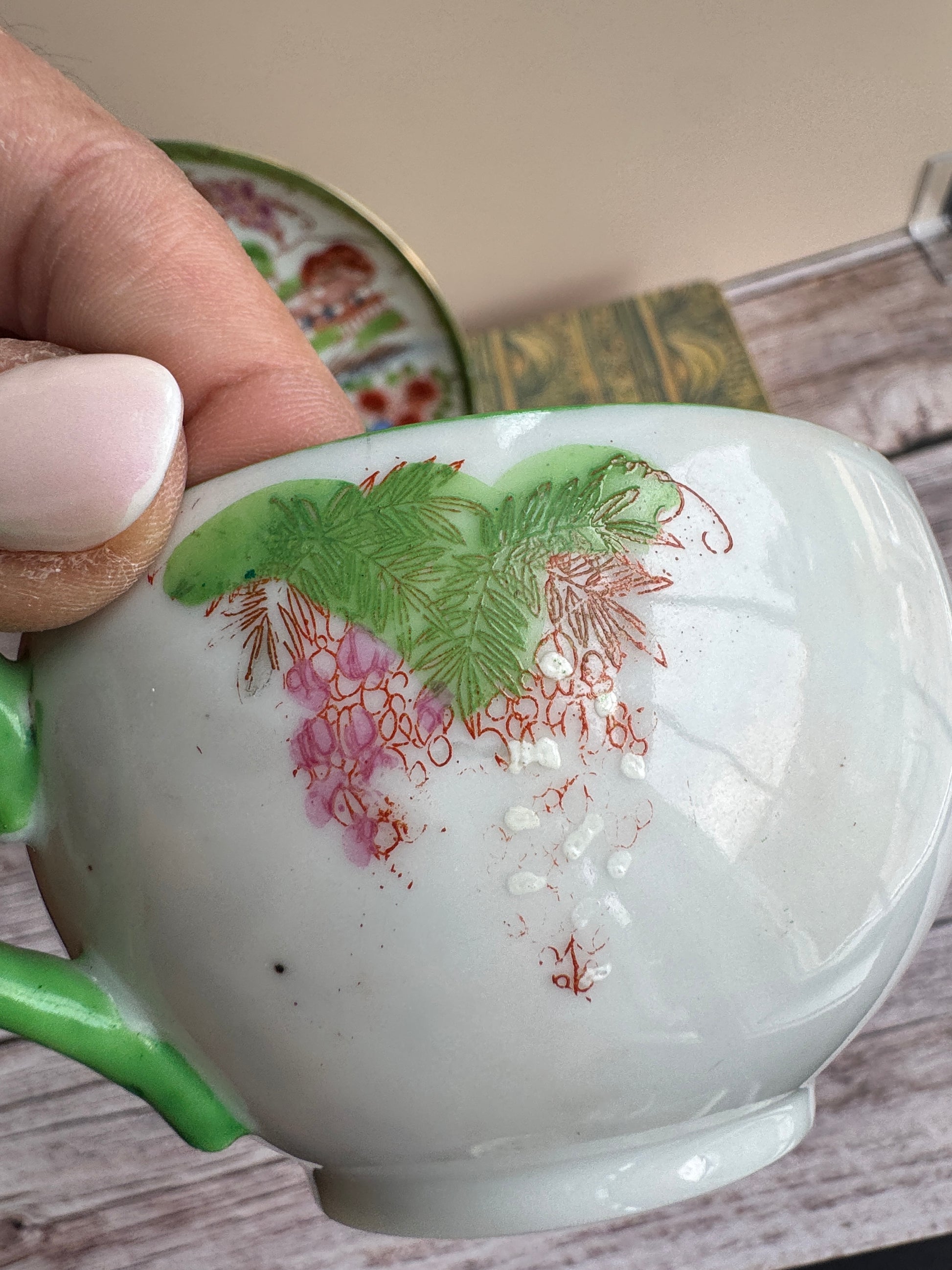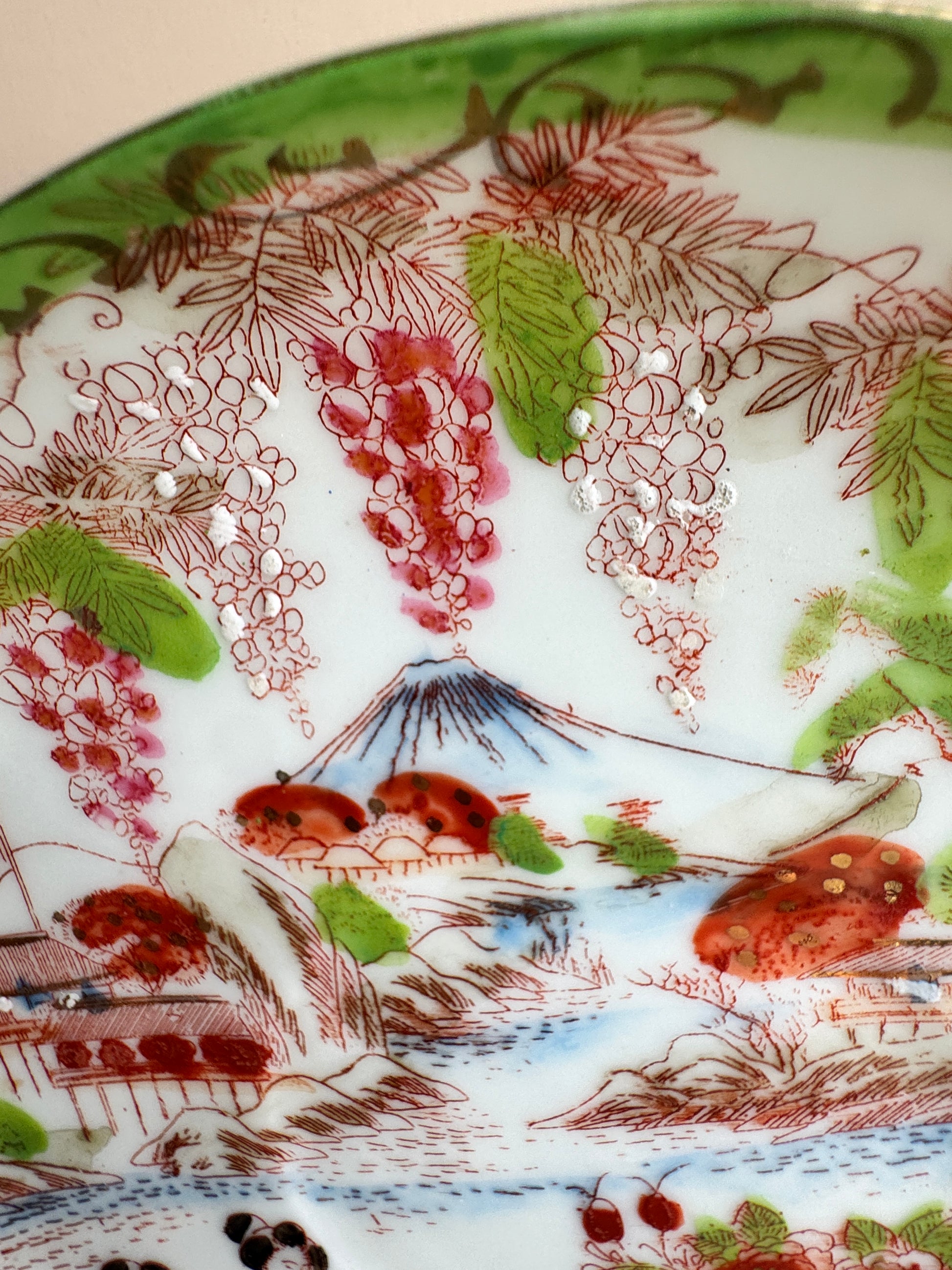 This delicate pair of vintage Japanese teacups and saucers features exquisite hand-painted scenic motifs—mountains, temples, trees, and water—framed in traditional red, green, and gold tones. Likely mid-20th century, these porcelain pieces reflect Japan’s export era, when fine wares were created for Western markets with an emphasis on artistry and elegance.