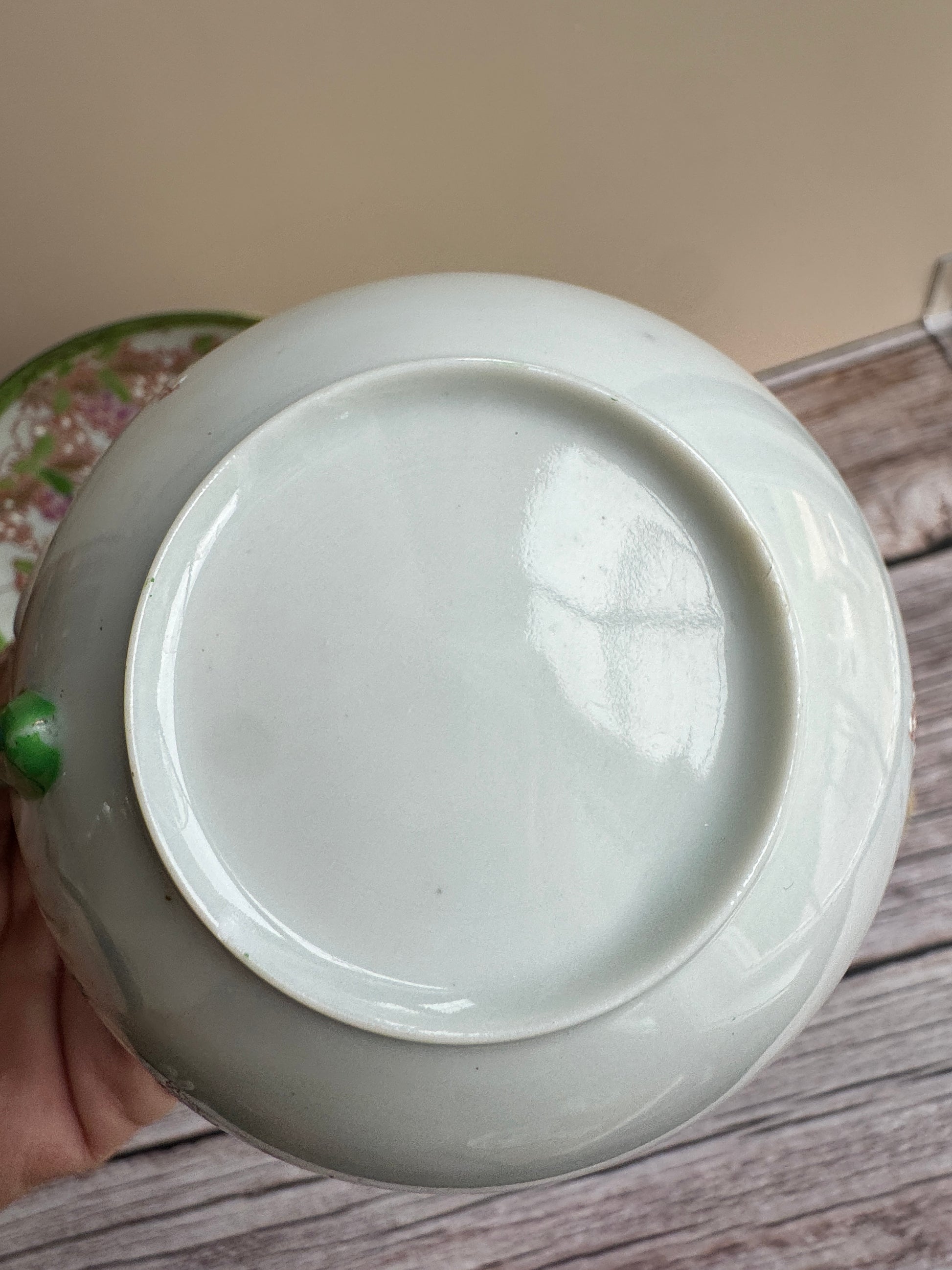 The cups are exceptionally thin, possibly egg shell porcelain or fine bone china, with light translucence when held to the light. Both sets include matching saucers and gold trim accents. Marked “Made in Japan” on the base, a common export hallmark post-1921.