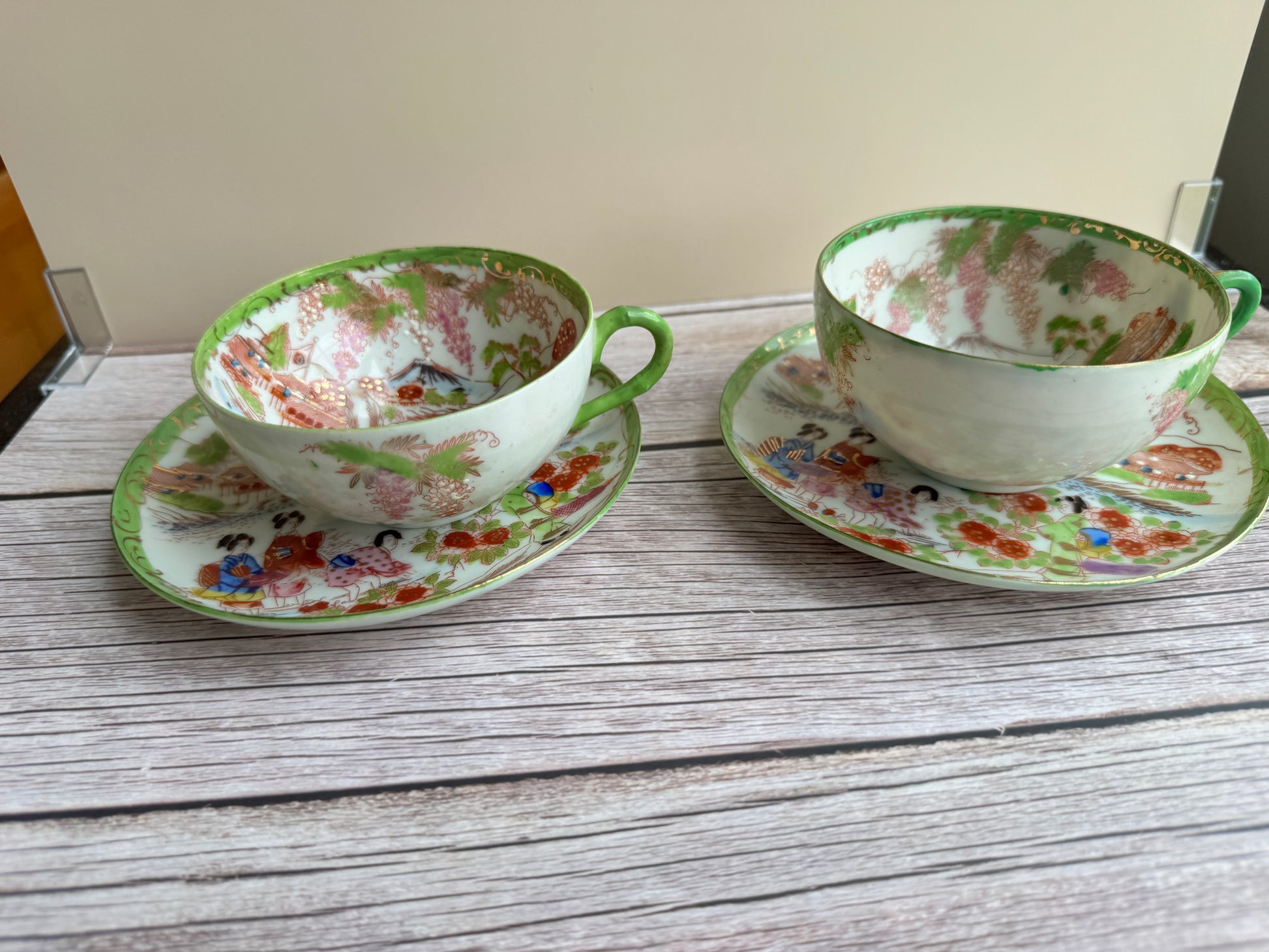 Vintage Japanese Scenic Teacups & Saucers – Pair with Gold Trim and Landscape Motifs