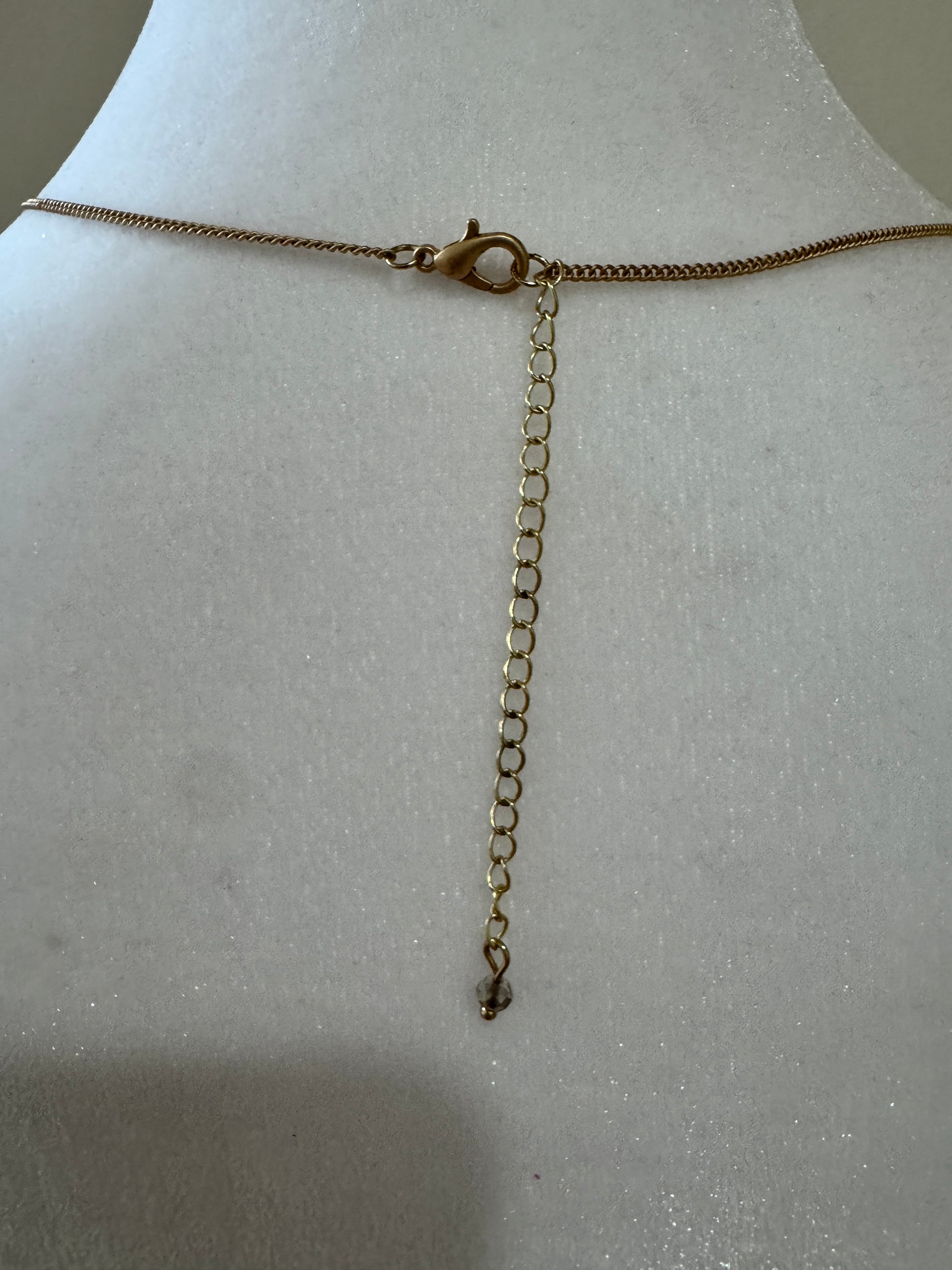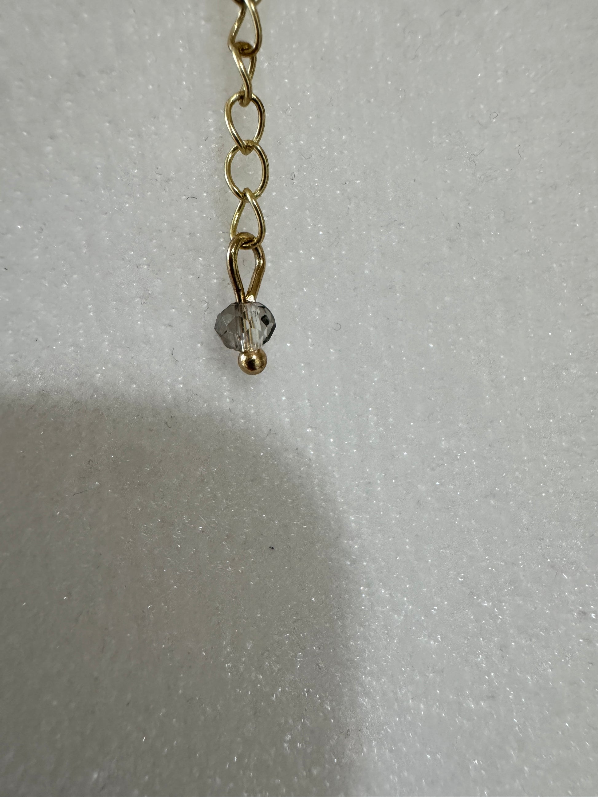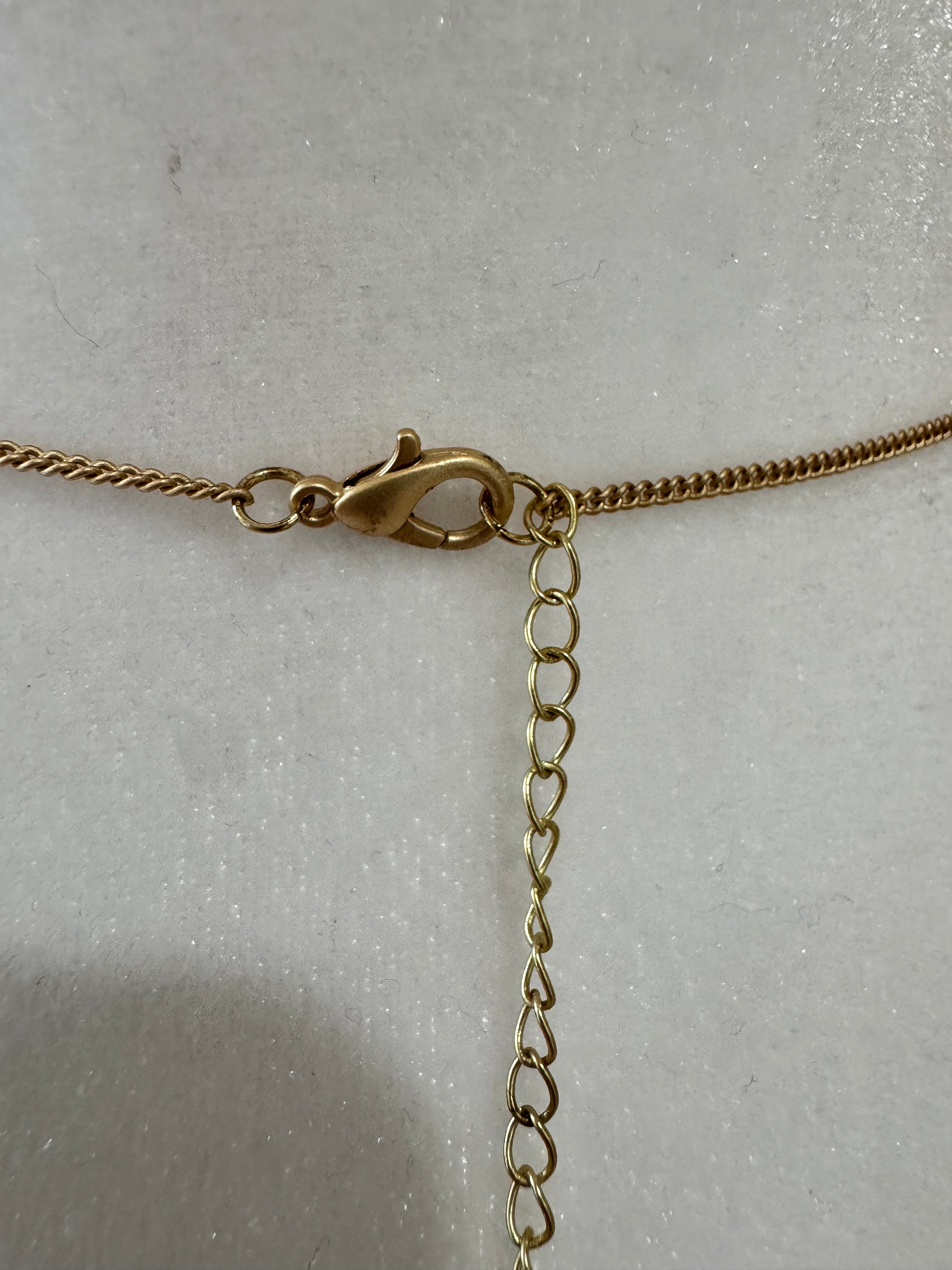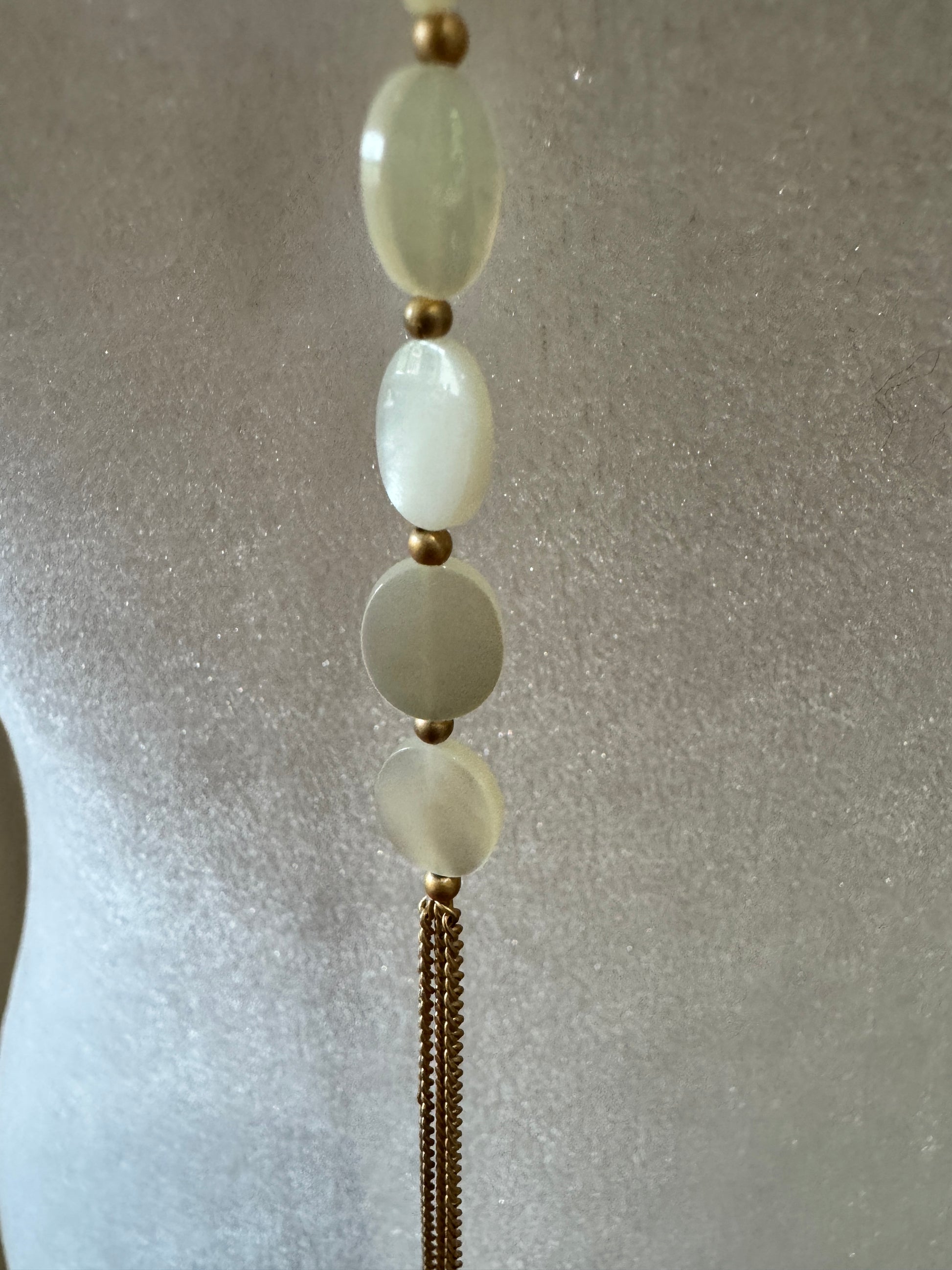 A romantic vintage necklace with a delicate glow — this gold-tone piece features oval mother-of-pearl-style beads with soft iridescence, accented by a dramatic chain tassel drop. Its adjustable clasp allows for versatile styling, sitting anywhere from 18" to 22.5" in length.