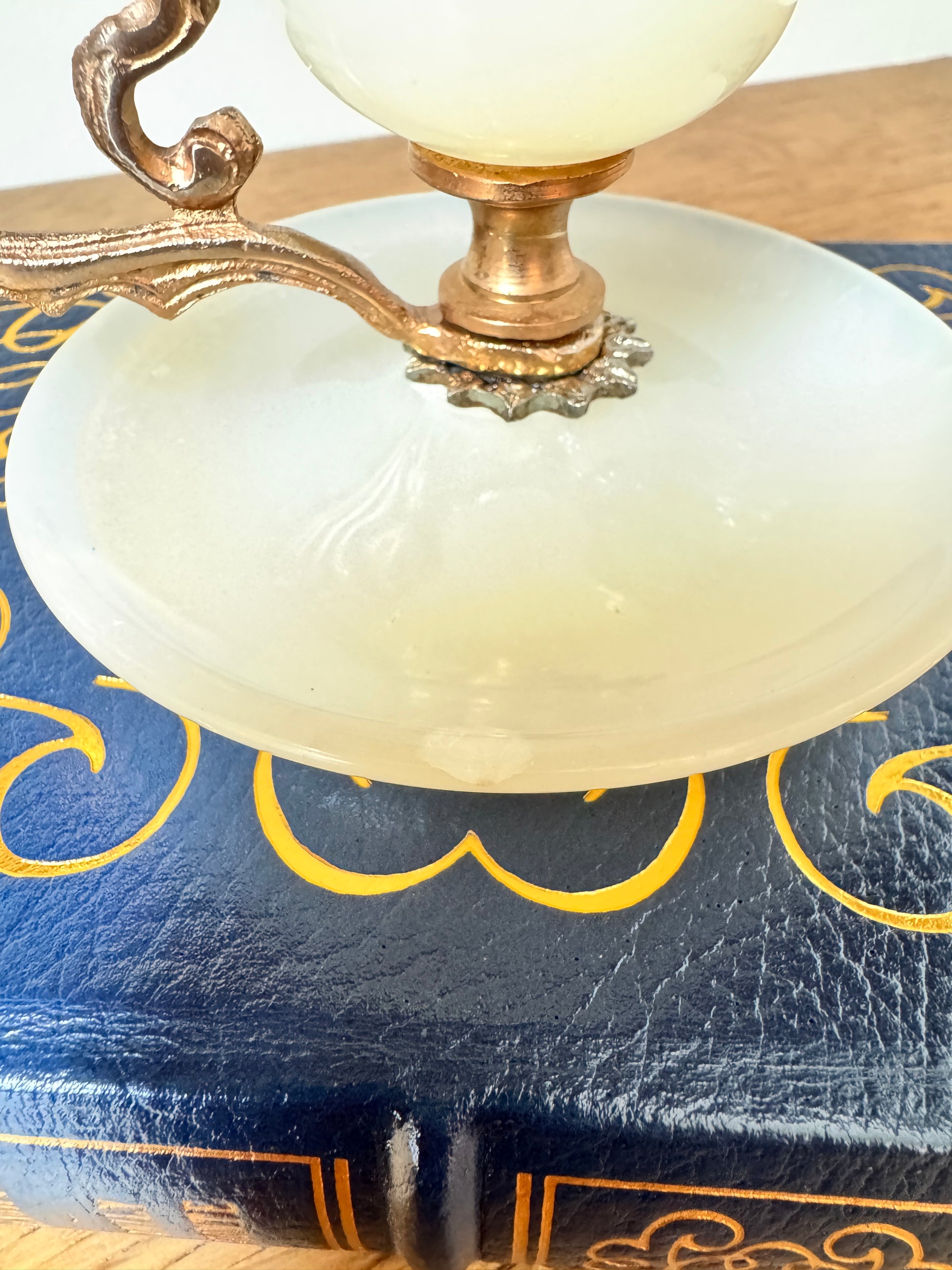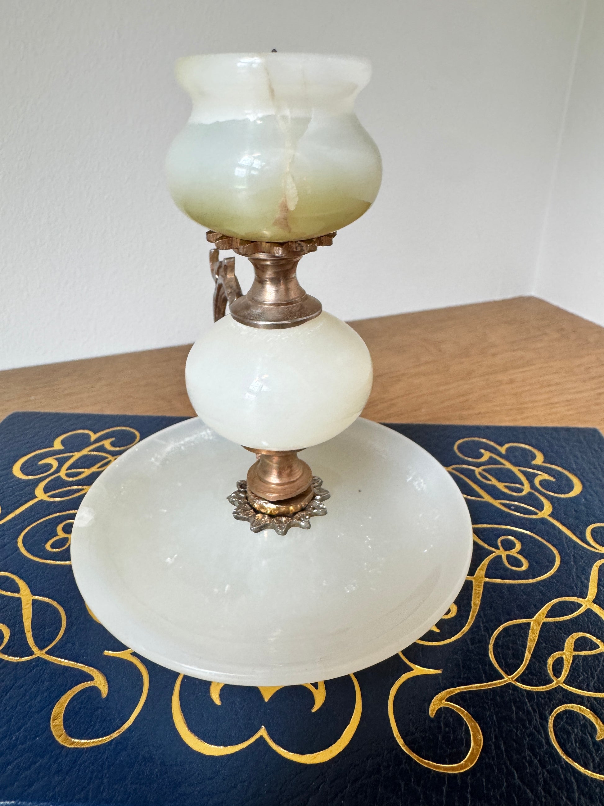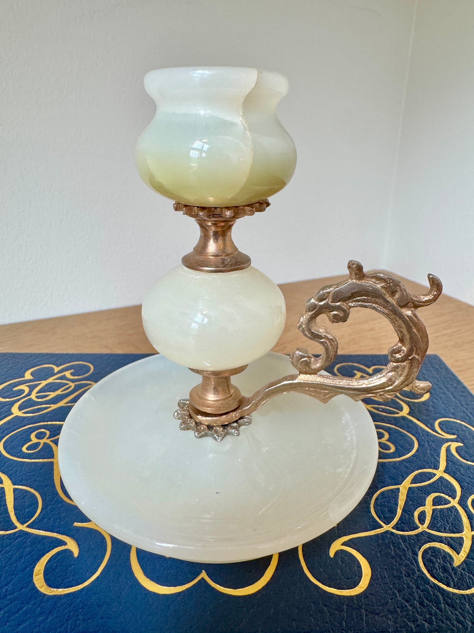 Bring a touch of timeless elegance into your home with this vintage onyx candlestick holder. Crafted from natural stone in soft cream and green tones, it’s accented with an ornate brass handle for a look that feels both classic and unique.