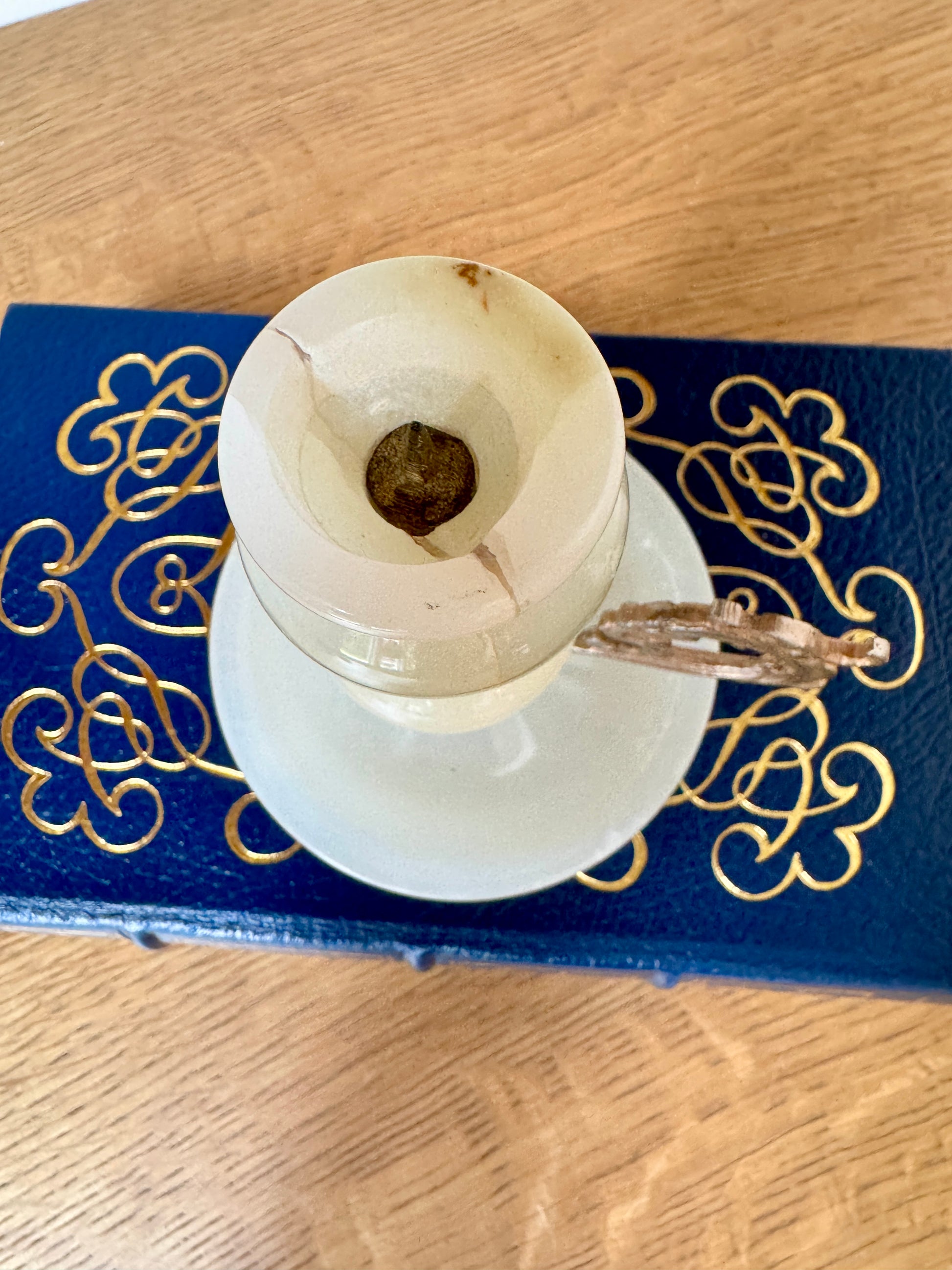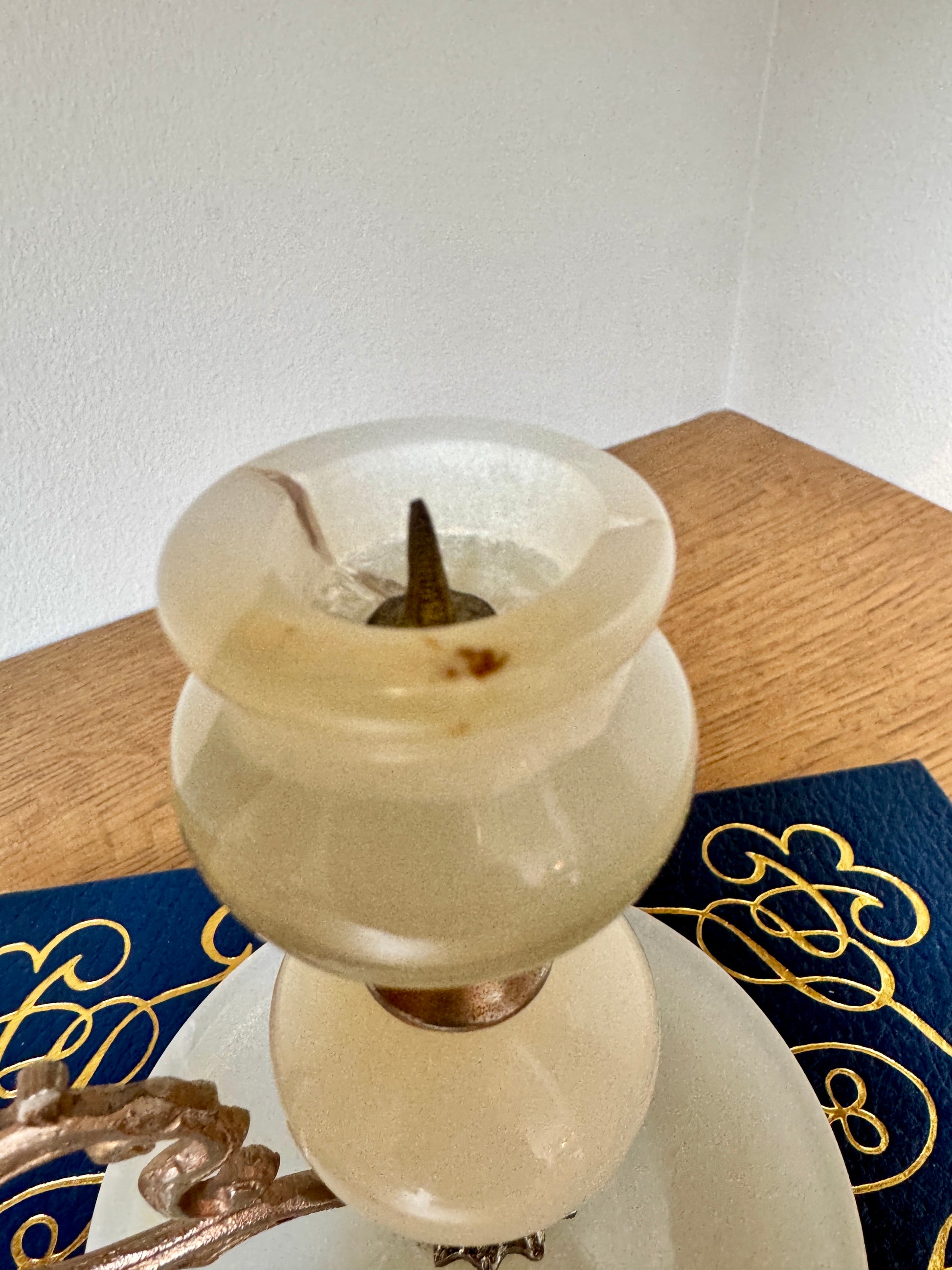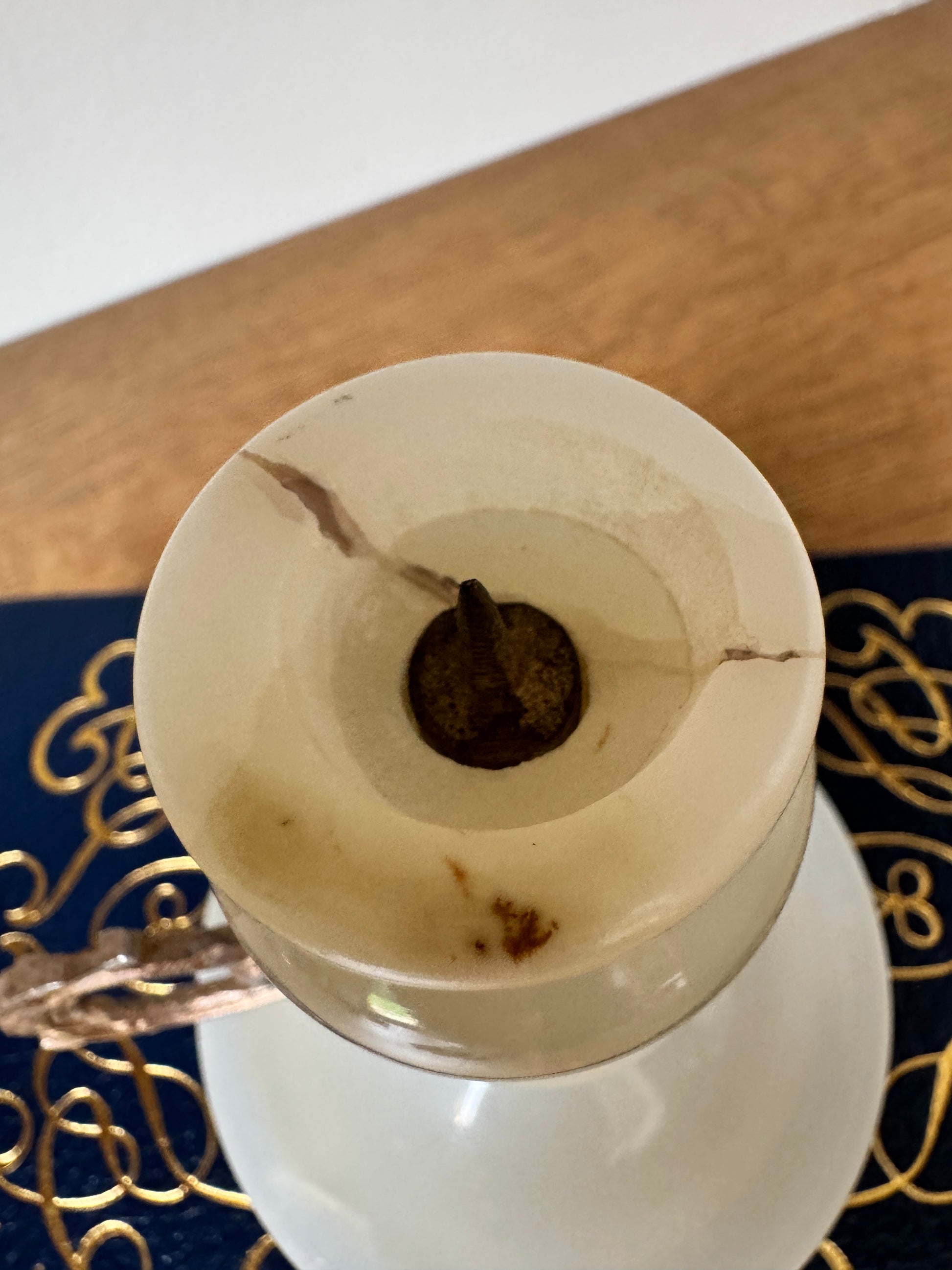 Onyx is known for its smooth texture and luminous glow, but it’s also a softer stone — meaning chips and cracks are quite common in antique candlesticks. This piece has visible age wear (see detailed photos), yet remains a beautiful decorative accent and conversation piece.