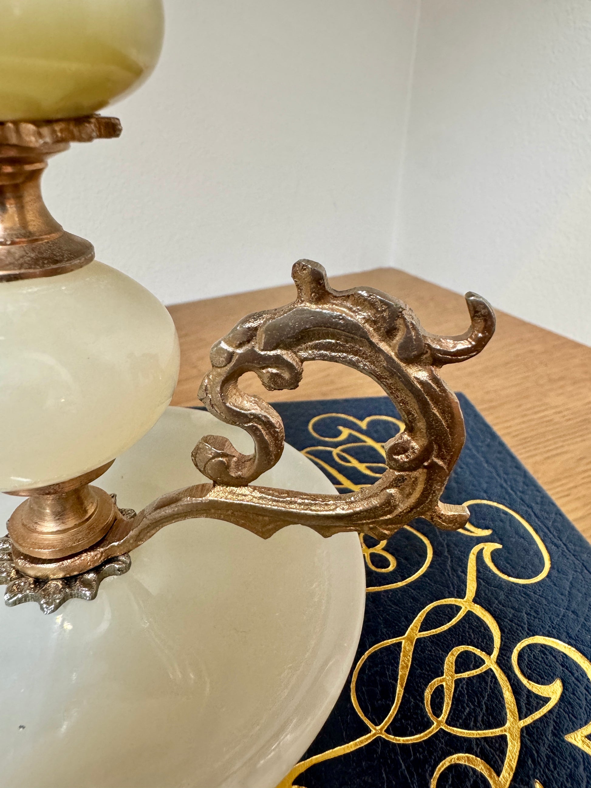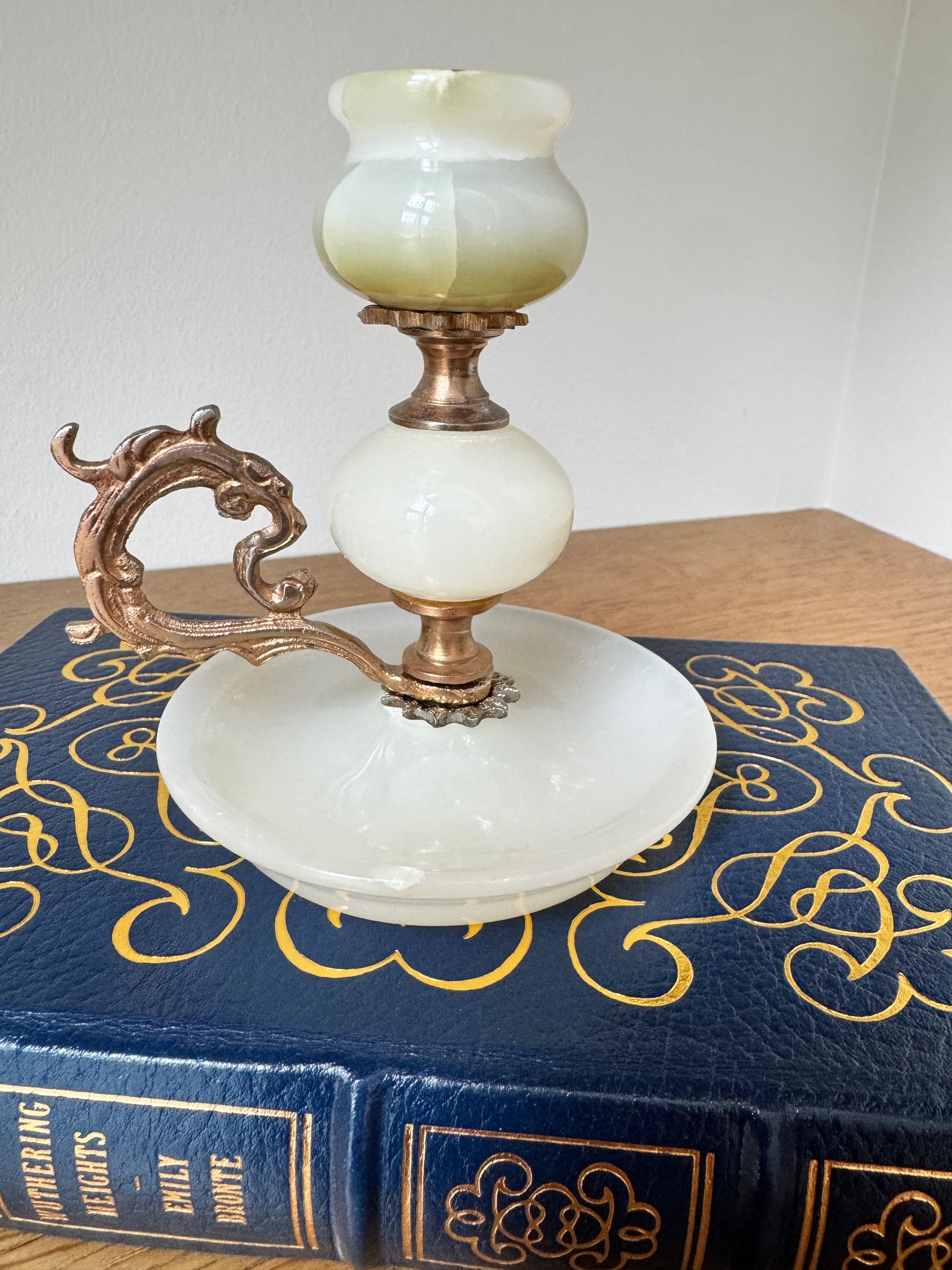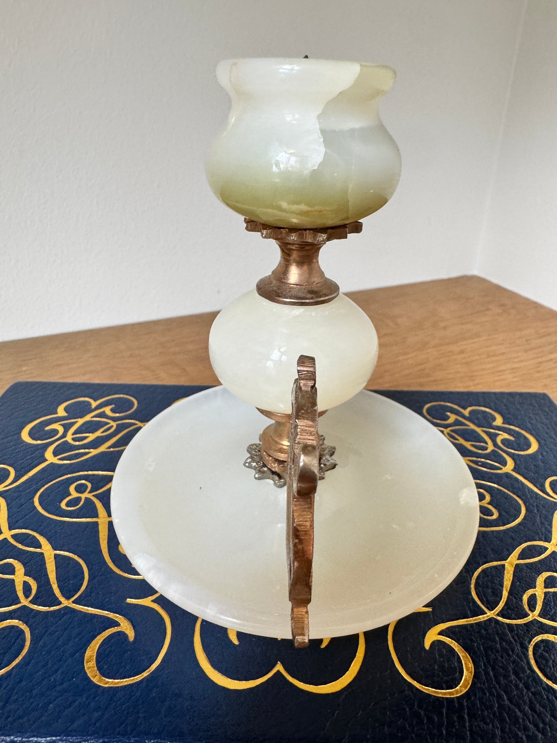 Vintage Onyx & Brass Candlestick Holder – Green & Cream Stone Candle Holder with Ornate Handle