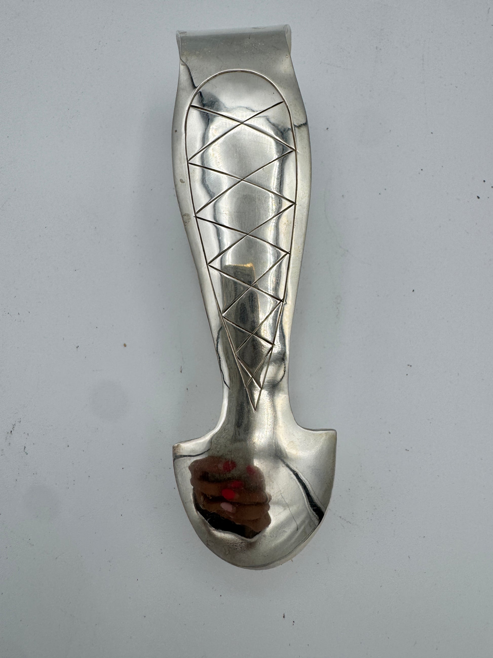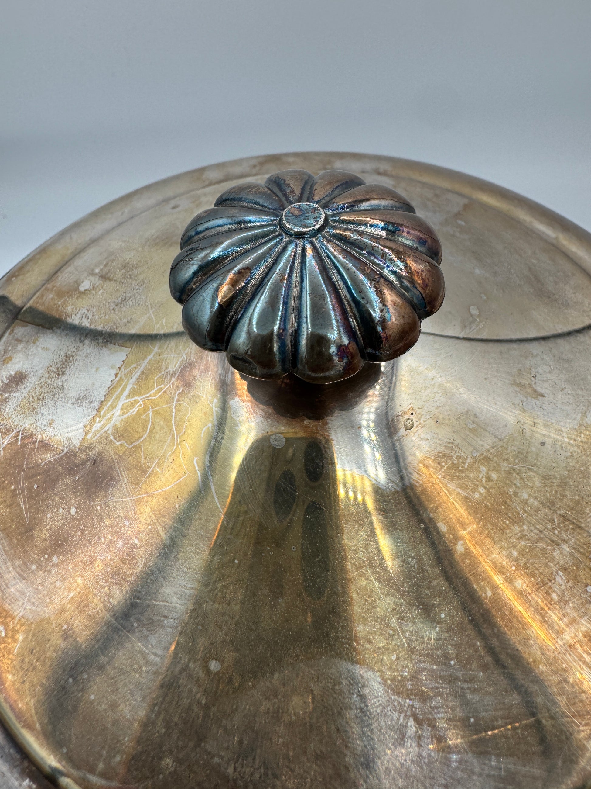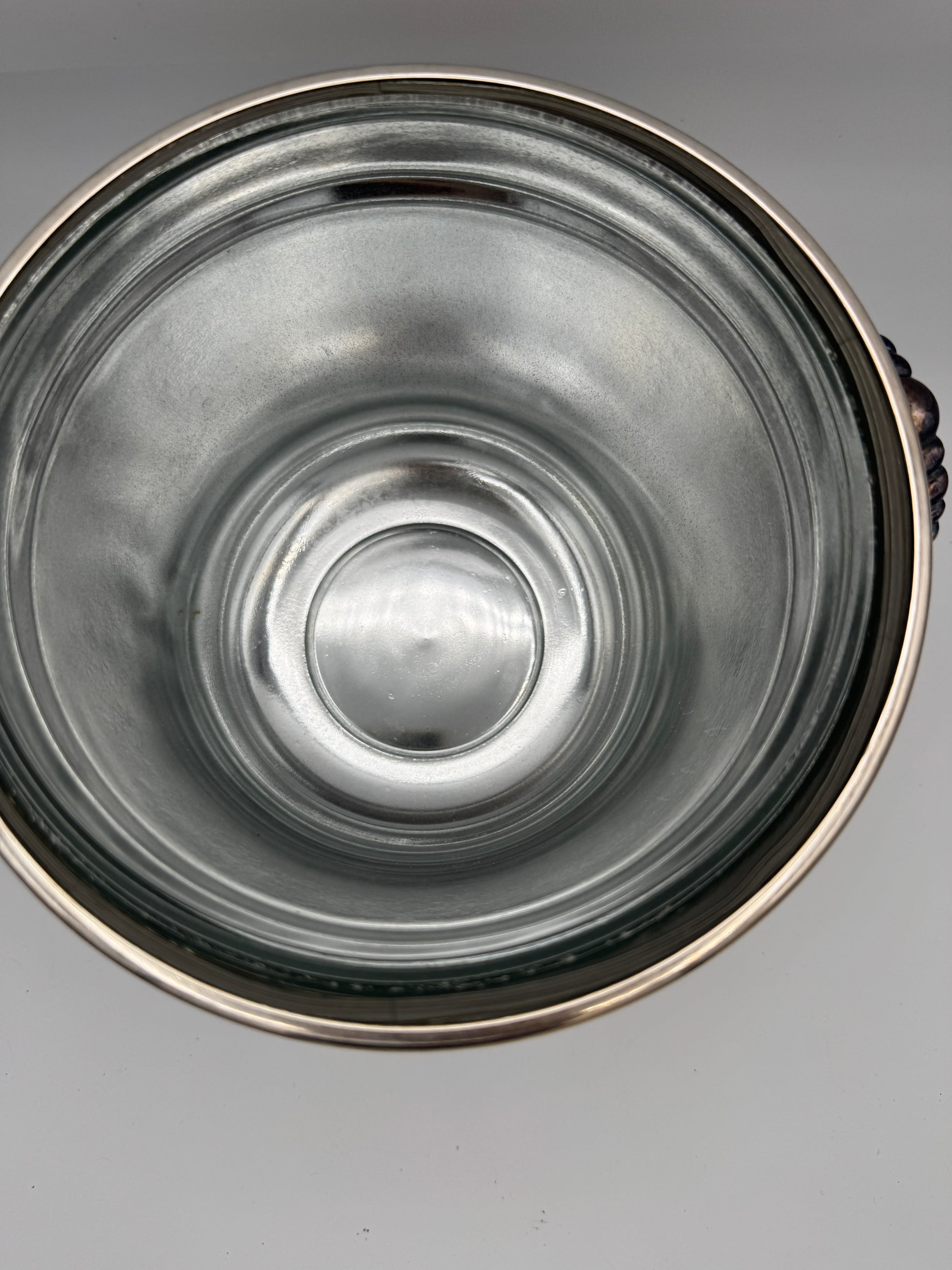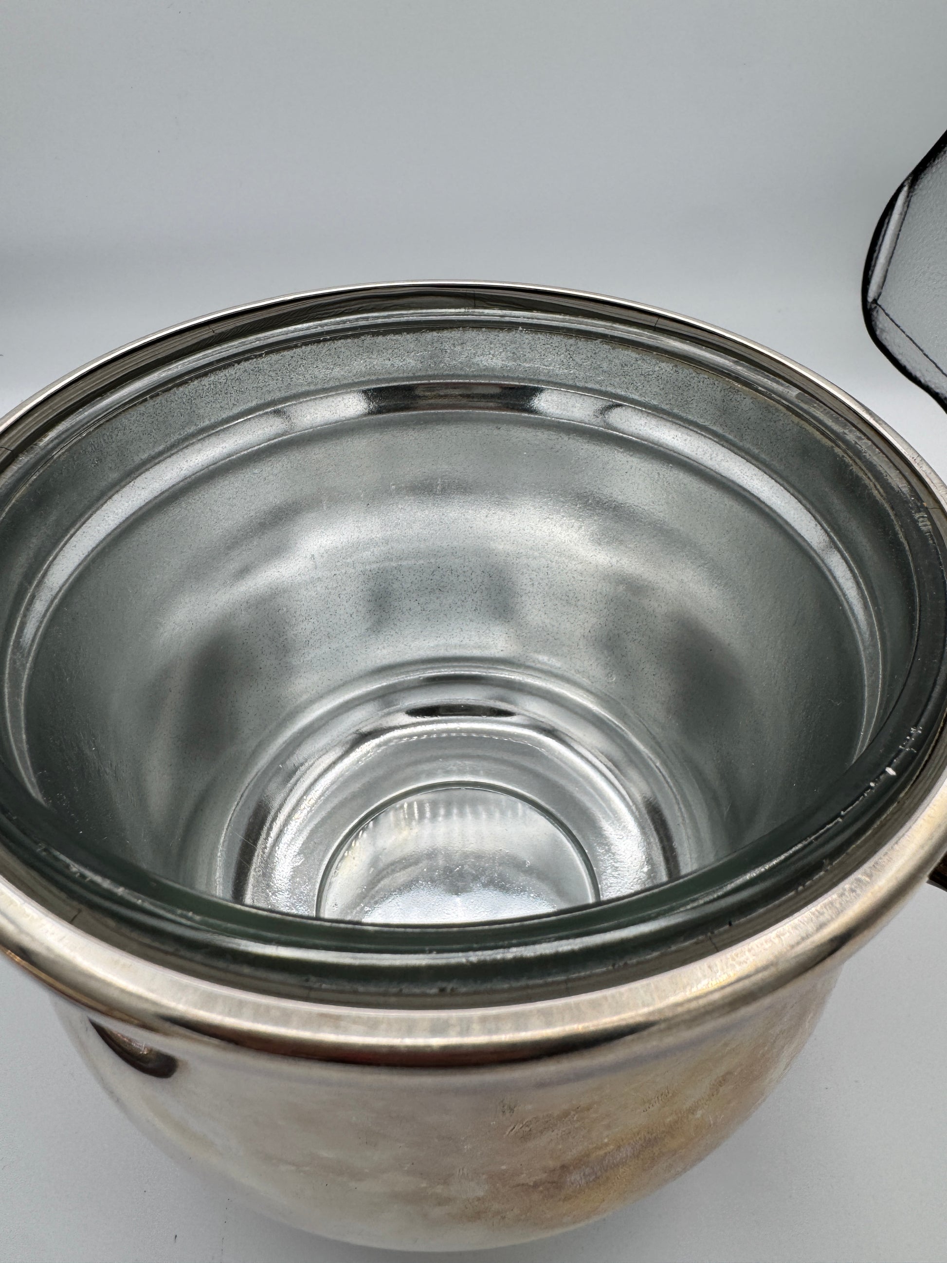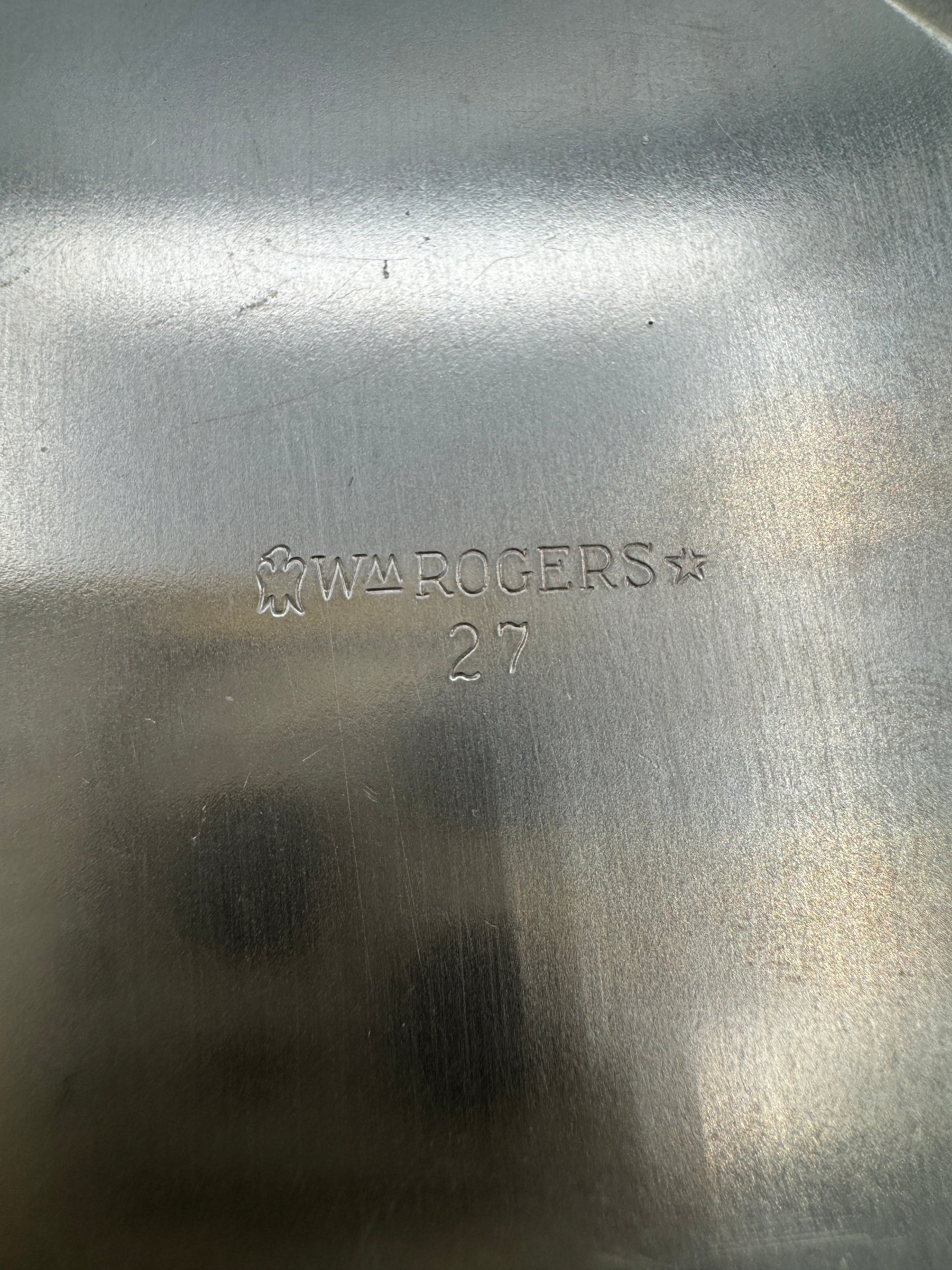 A polished classic for your vintage barware collection, this William Rogers silverplate ice bucket features the traditional Paul Revere-style silhouette, complete with footed base and curled rim. It’s marked Wm. Rogers No. 27 on the base and comes with coordinating silverplate tongs.